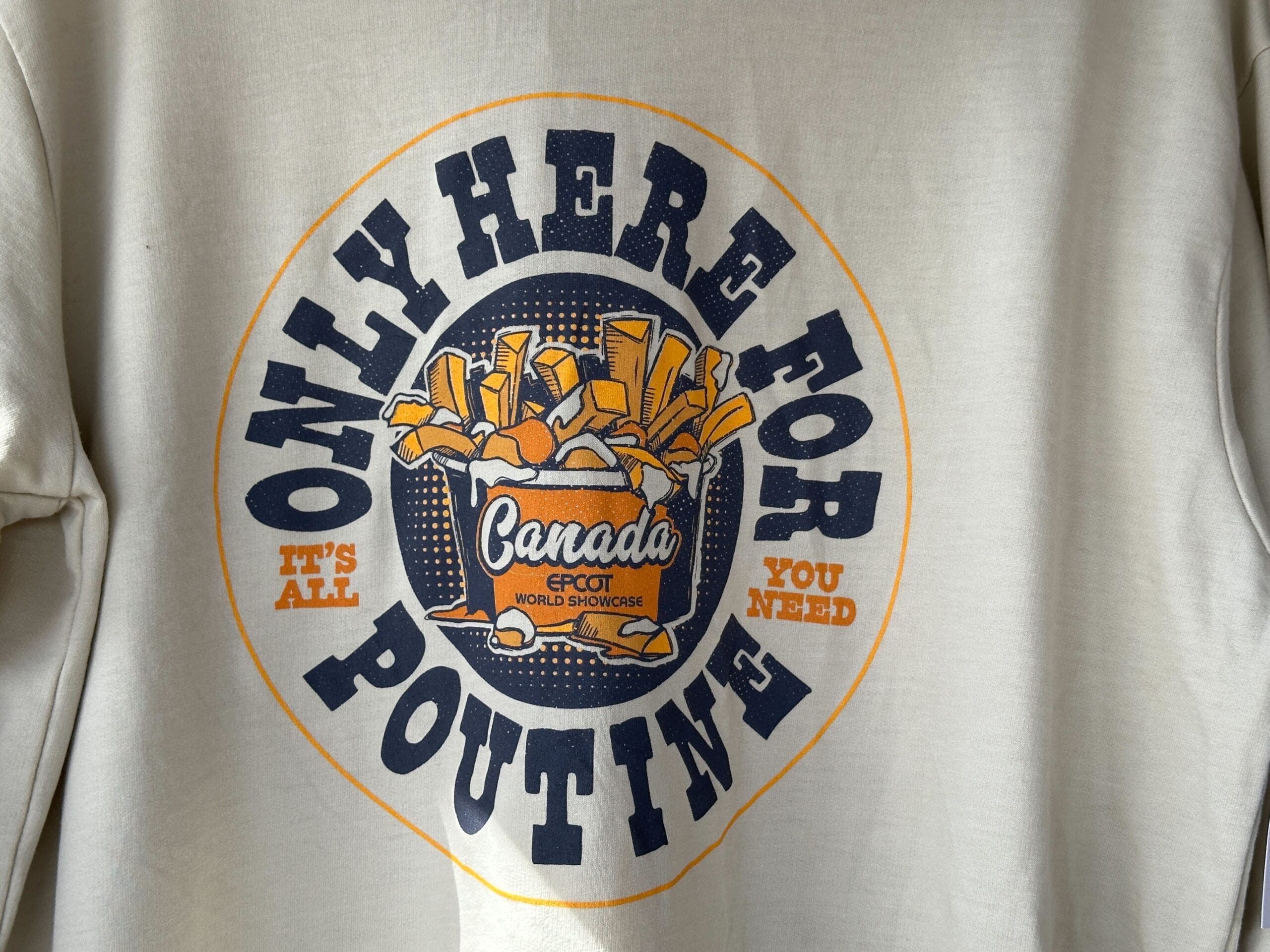 This is an off-white pullover with a drawstring hood and kangaroo pocket. “Only Here For Poutine” is printed on the chest as part of blue and orange artwork. A messy cup of poutine is in the center.