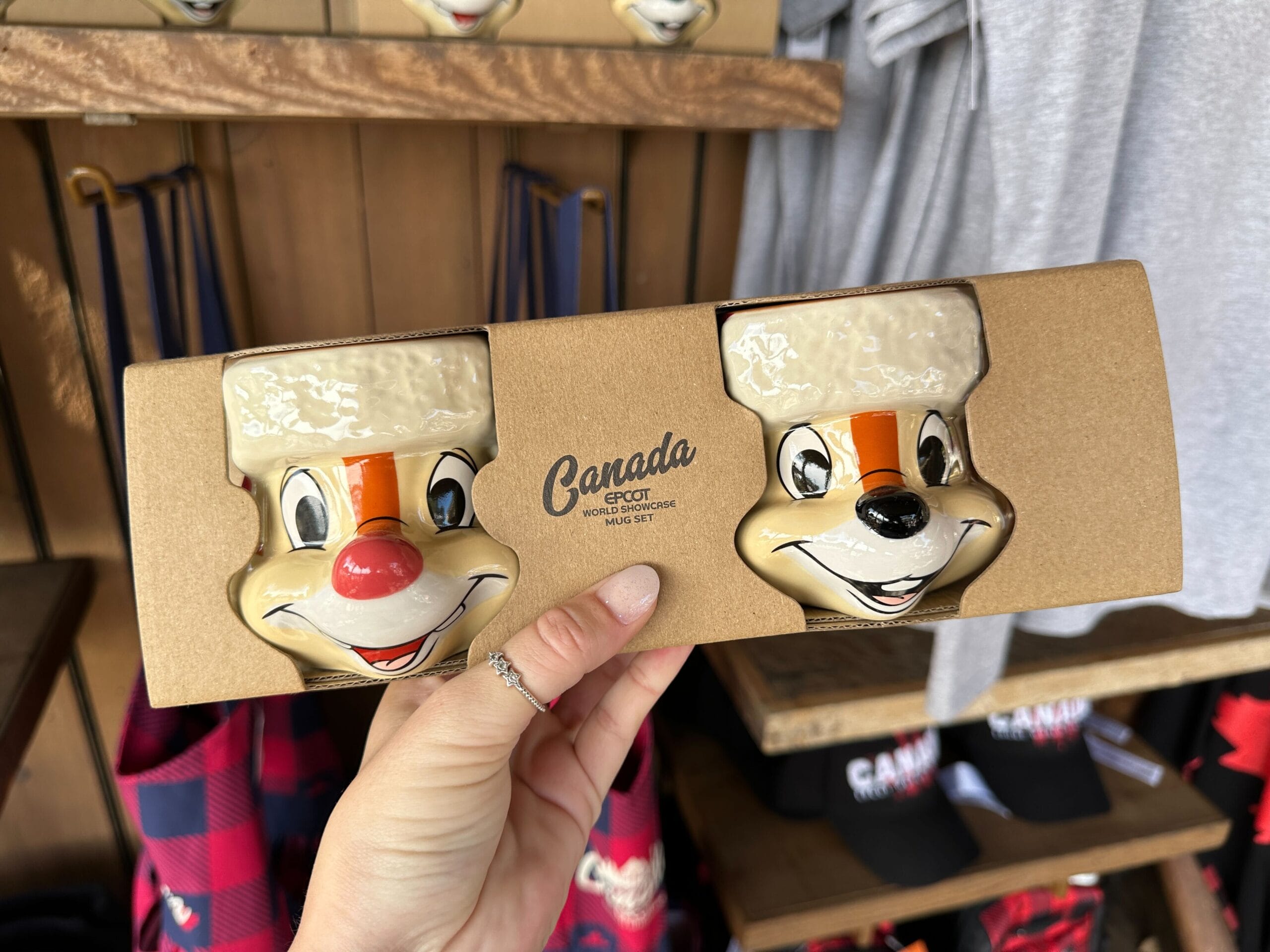 This is a set of two stoneware mugs sculpted to look like Chip and Dale’s heads. They are wearing red plaid hats with “fur” trim. “Canada EPCOT World Showcase” is on the back of each mug.