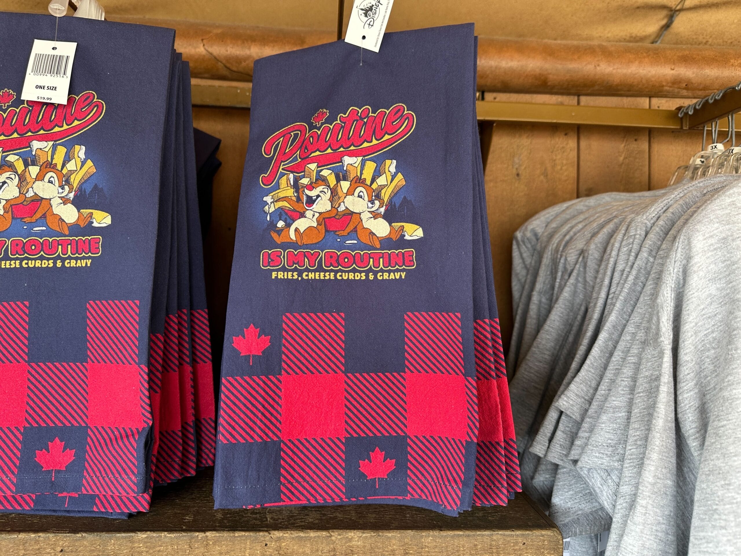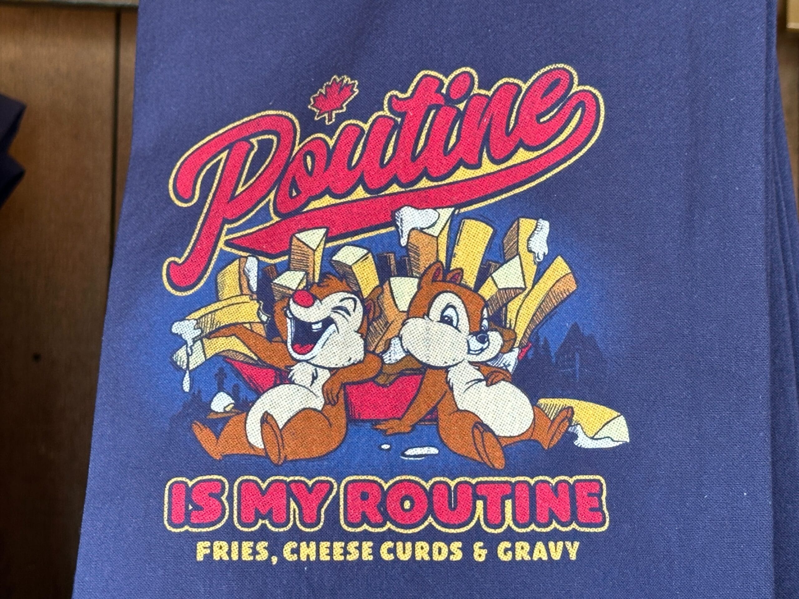 The towel is partially solid blue and partially red plaid. Chip ‘n’ Dale are pictured with a pile of poutine. Around them is “Poutine is my routine” and “Fries, cheese curds & gravy” text.