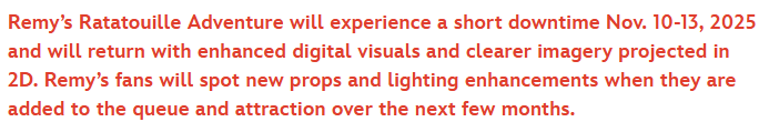 Remy’s Ratatouille Adventure will experience a short downtime Nov. 10-13, 2025 and will return with enhanced digital visuals and clearer imagery projected in 2D. Remy’s fans will spot new props and lighting enhancements when they are added to the queue and attraction over the next few months.