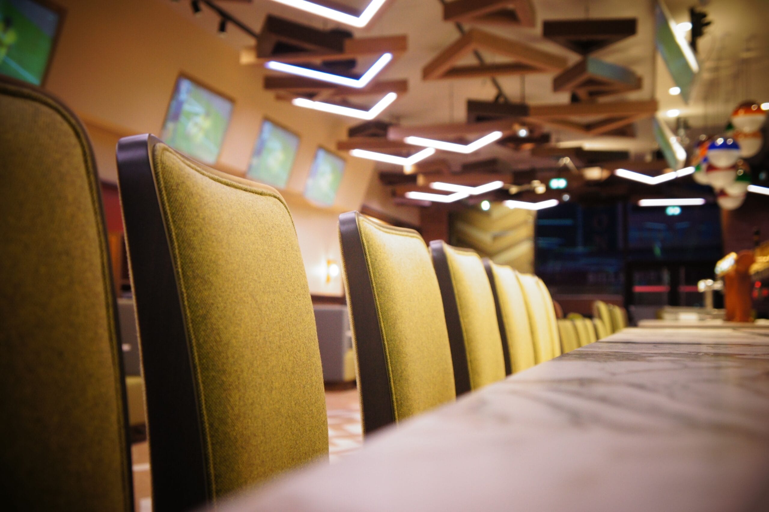 Photos shared in a press release and by Disneyland Paris president Natacha Rafalski show off unique lighting and chairs at long tables. The walls will be decorated with artworks and sports memorabilia. Screens will broadcast sporting events.