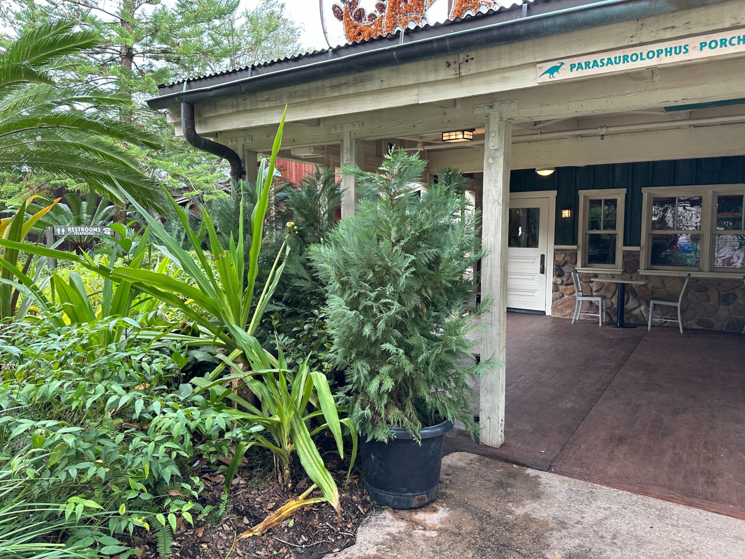 The meet and greet will be on the patio of Restaurantosaurus, one of the last remaining vestiges of DinoLand. Above the patio entrance, a trio of light-up tinsel dinosaurs appear to sing Christmas carols.