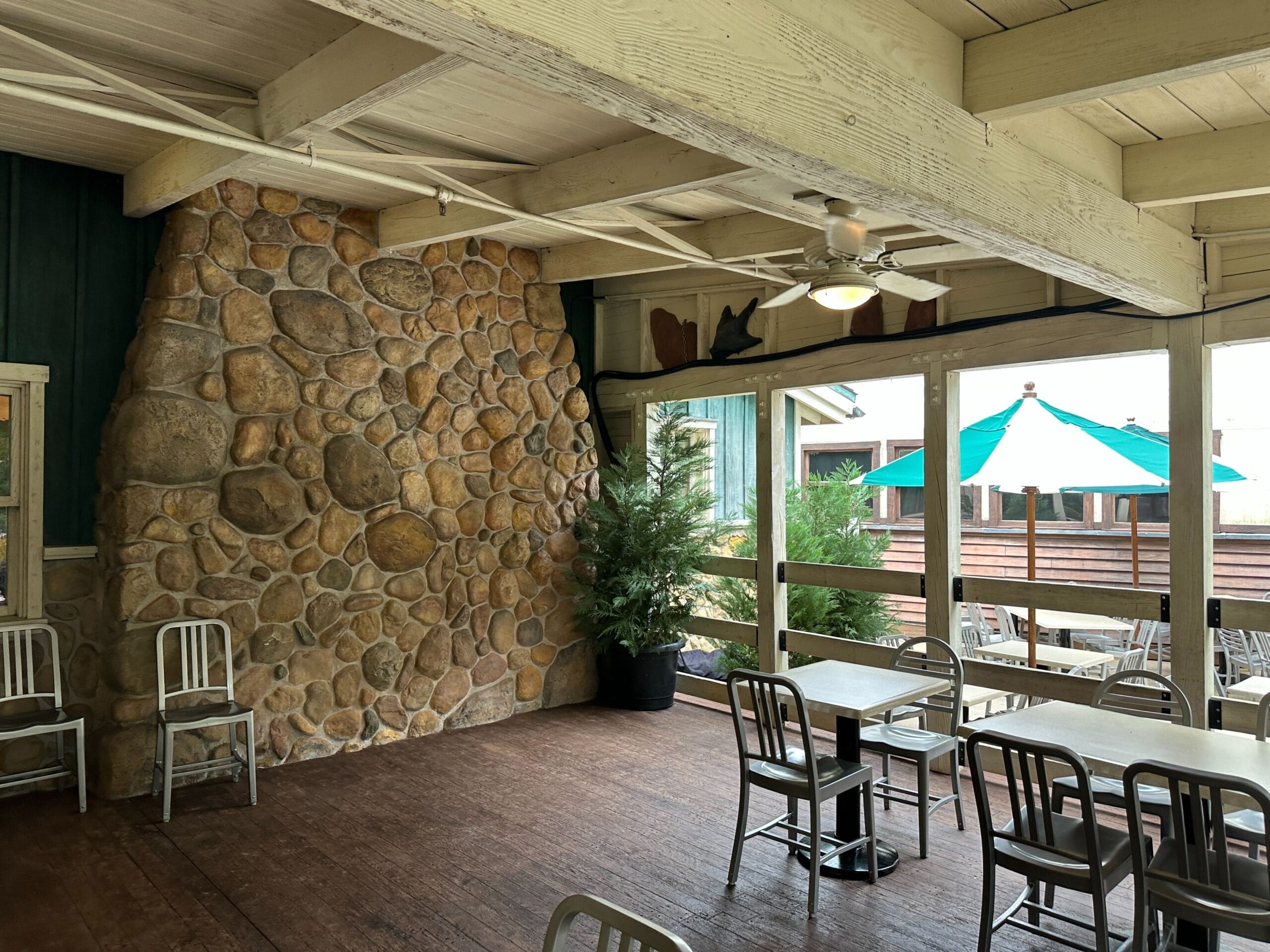 It looks like some chairs and tables have been cleared from the patio. There were a few potted plants, either for decoration or to eventually block work in the area from guest view.