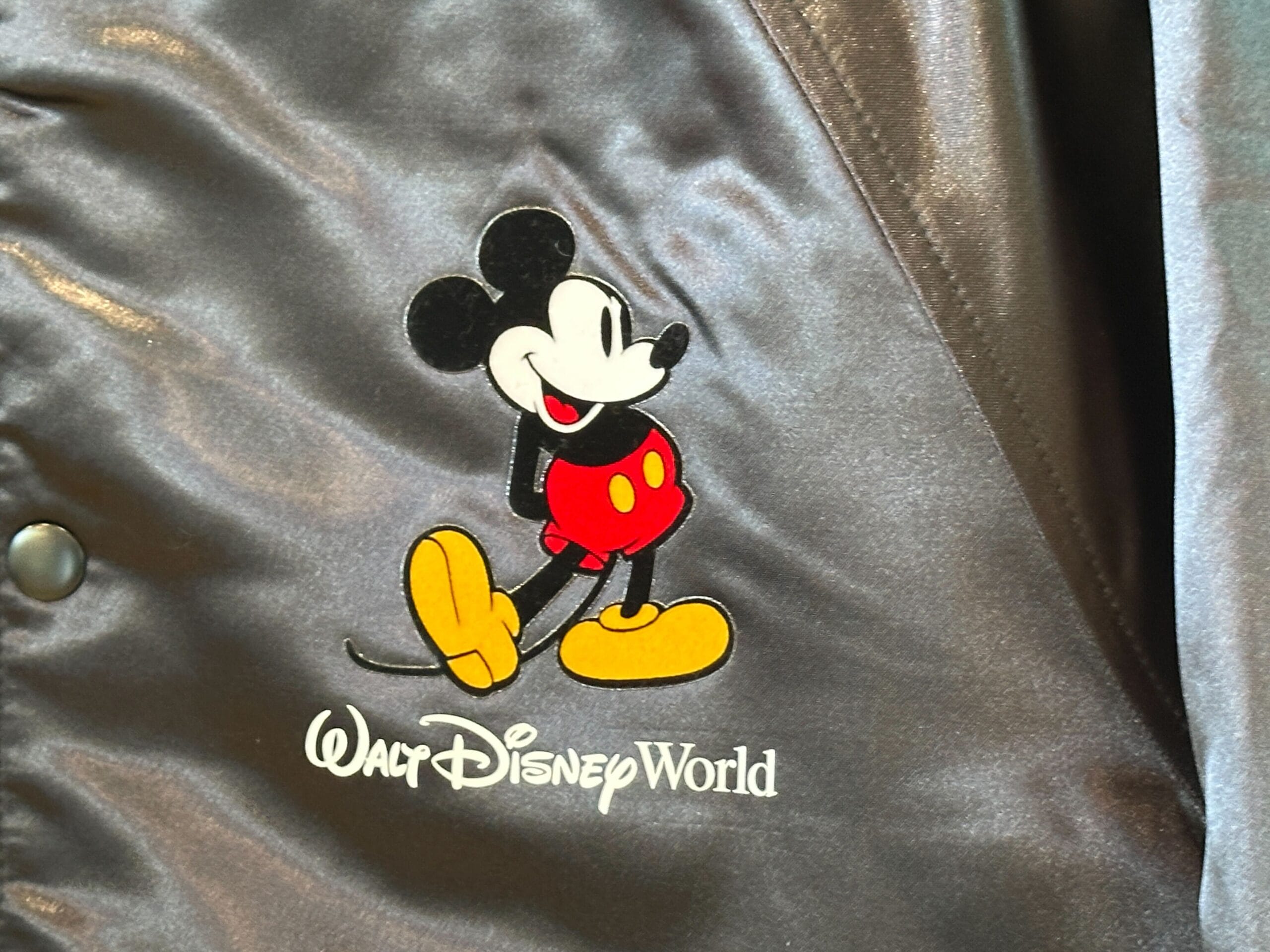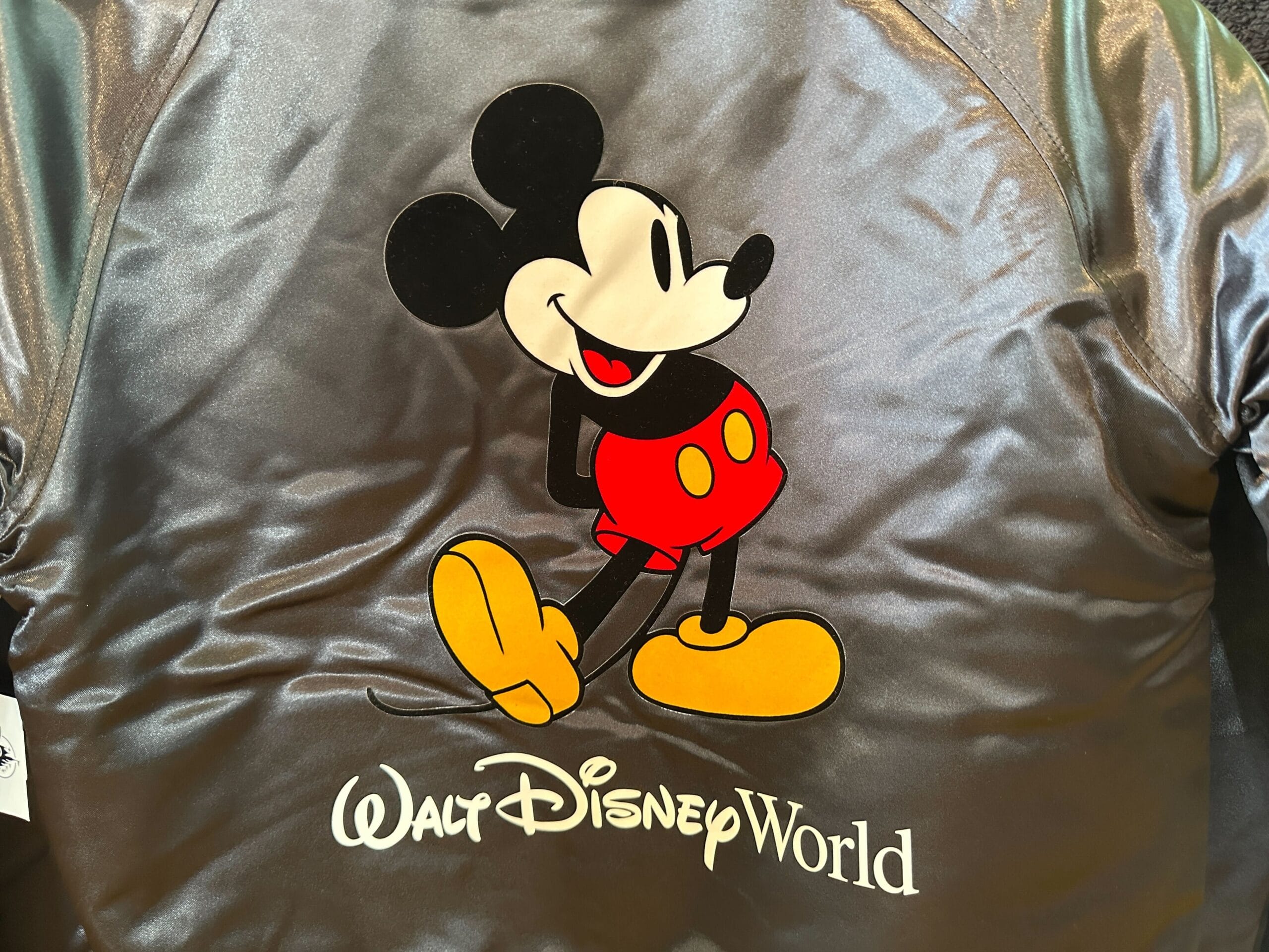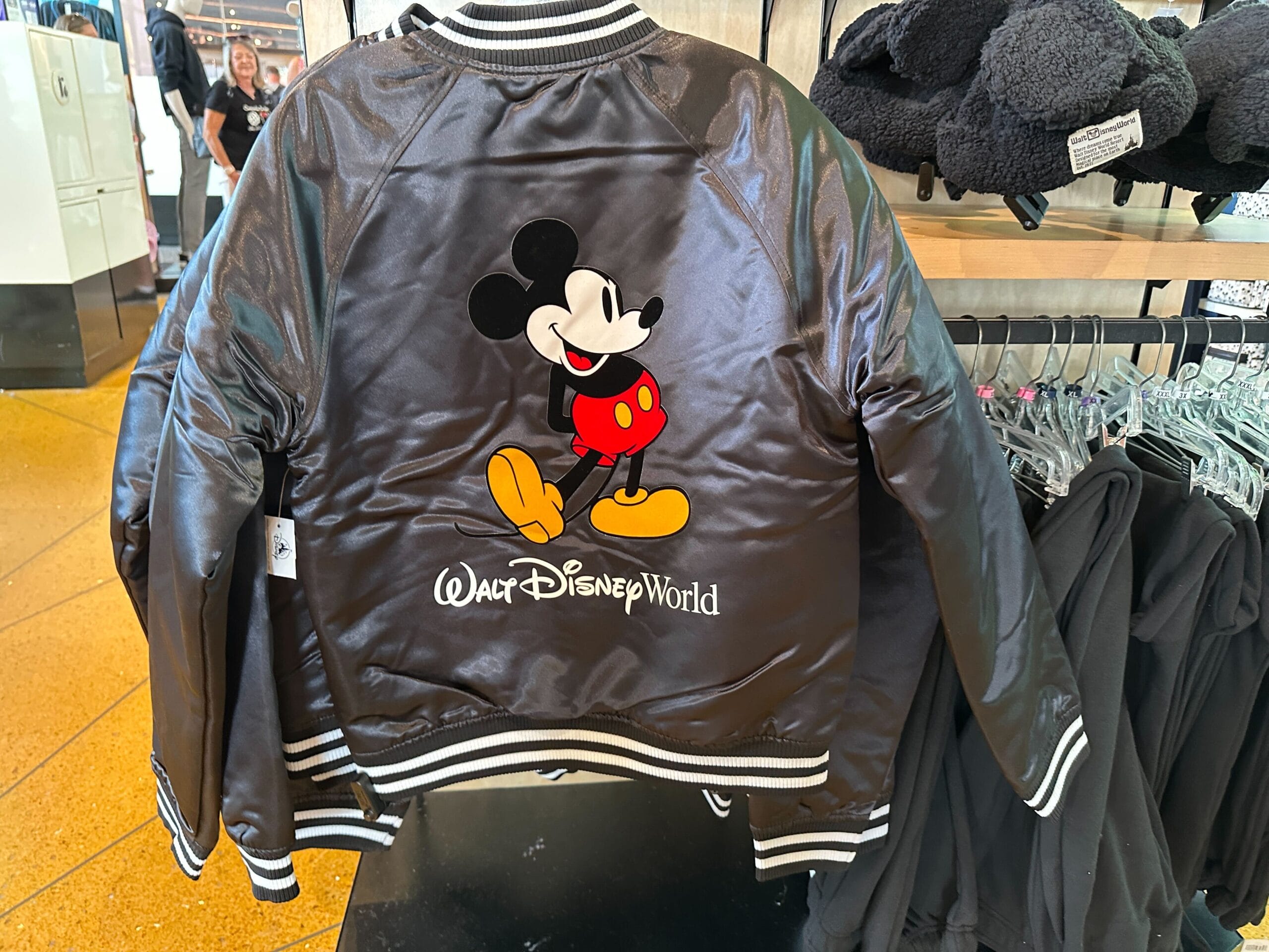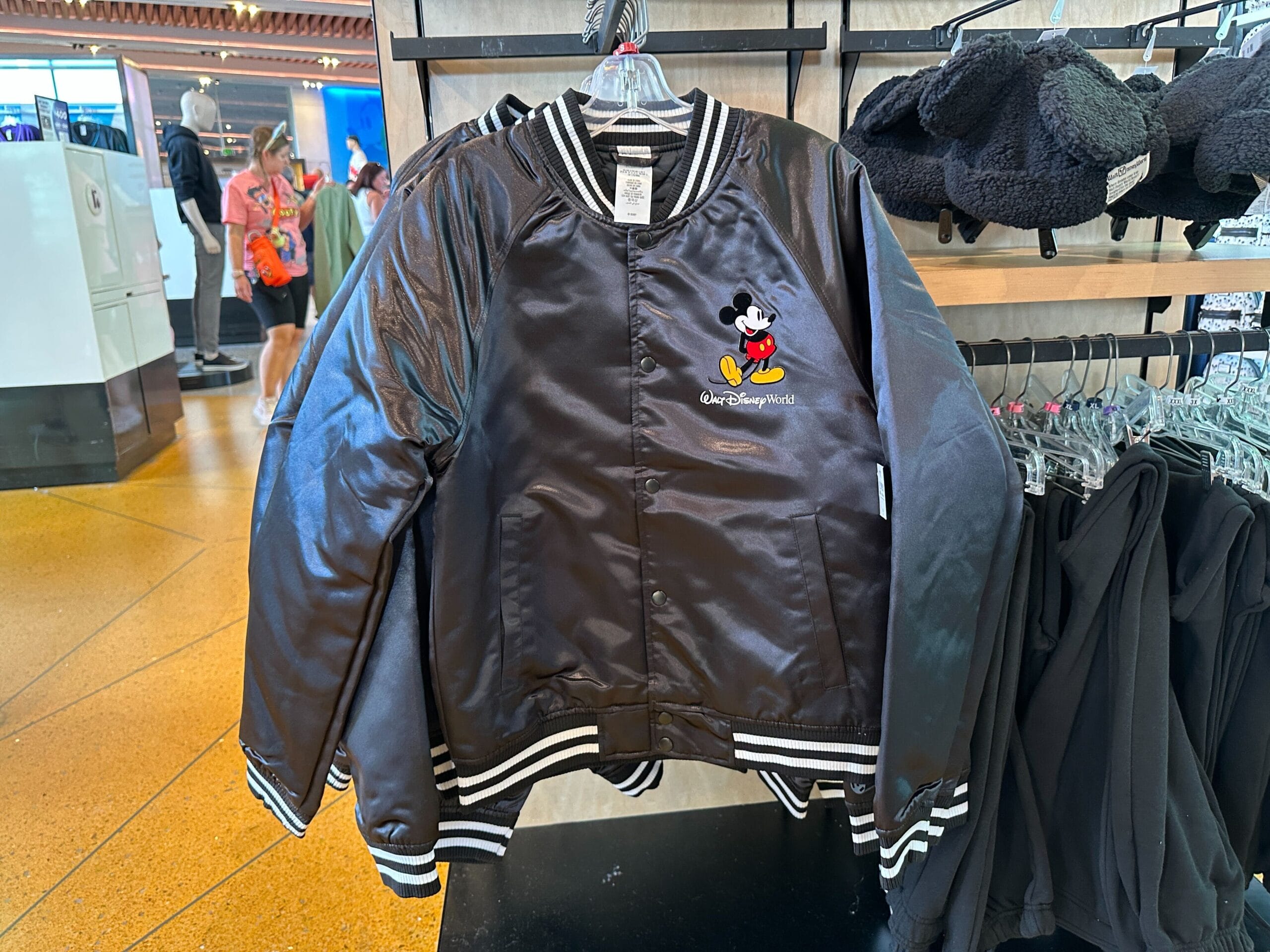 The jacket is made of a shiny black satin material with ribbed cuffs, hem, and collar. The trims also feature white stripes. Mickey is on the left chest with “Walt Disney World.”