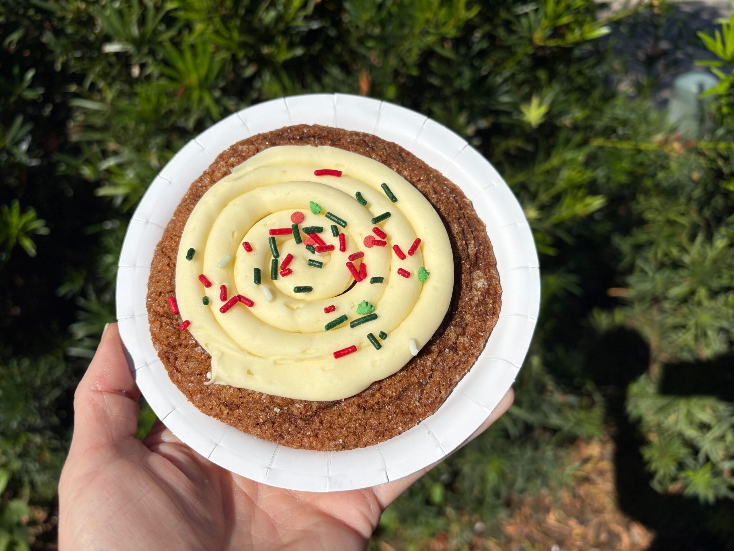 It’s your basic sugar cookie. It’s fun and soft. You get vanilla with a hint of cinnamon, and the sprinkles add a good crunch. (Though, to be honest, we hoped that at this price point, they would’ve used Mickey sprinkles instead of the plain red circles.) We’d compare it to a soft chocolate chip cookie minus the chips. It’s fine, but there are other options more worthy of your money.