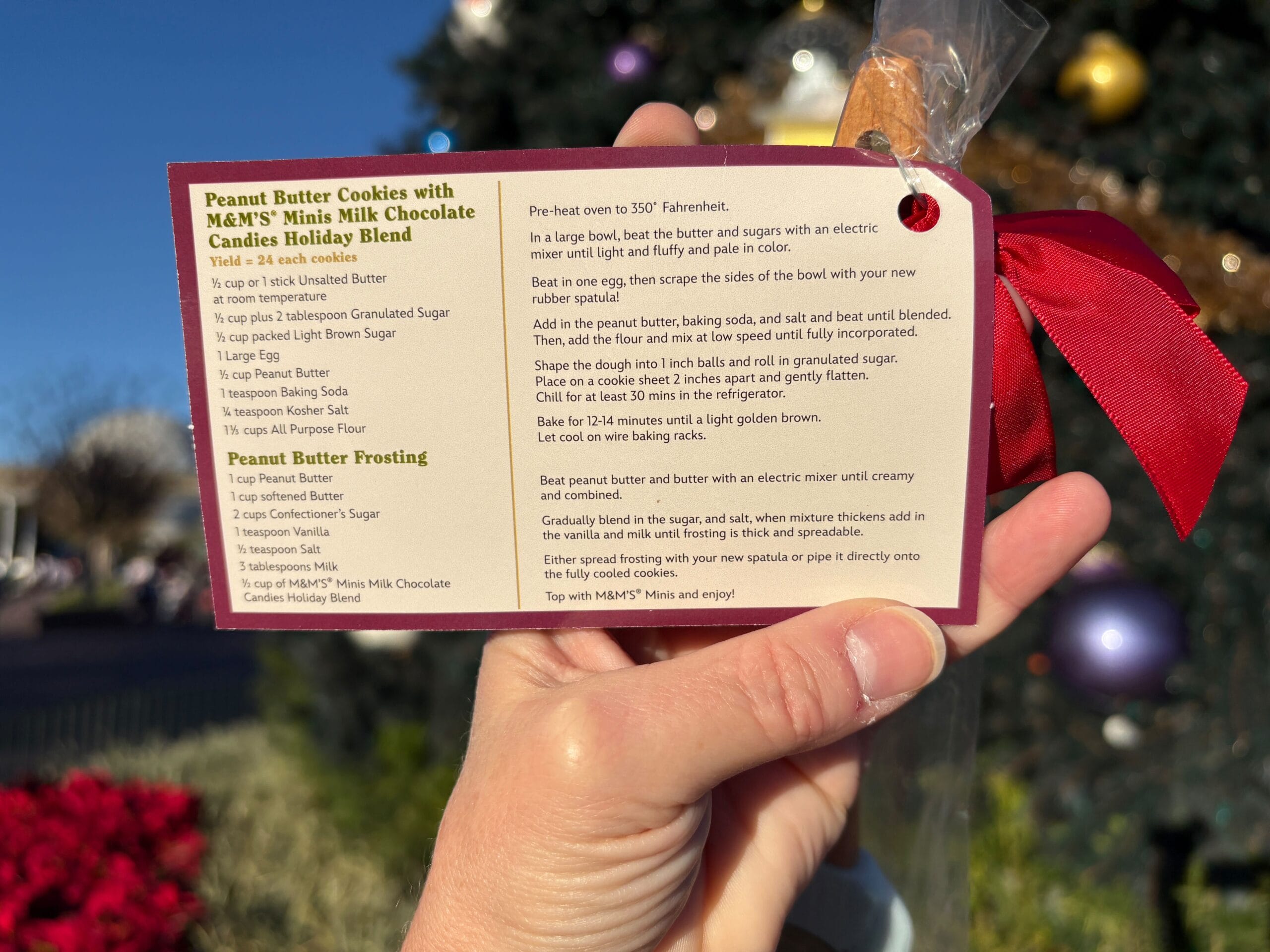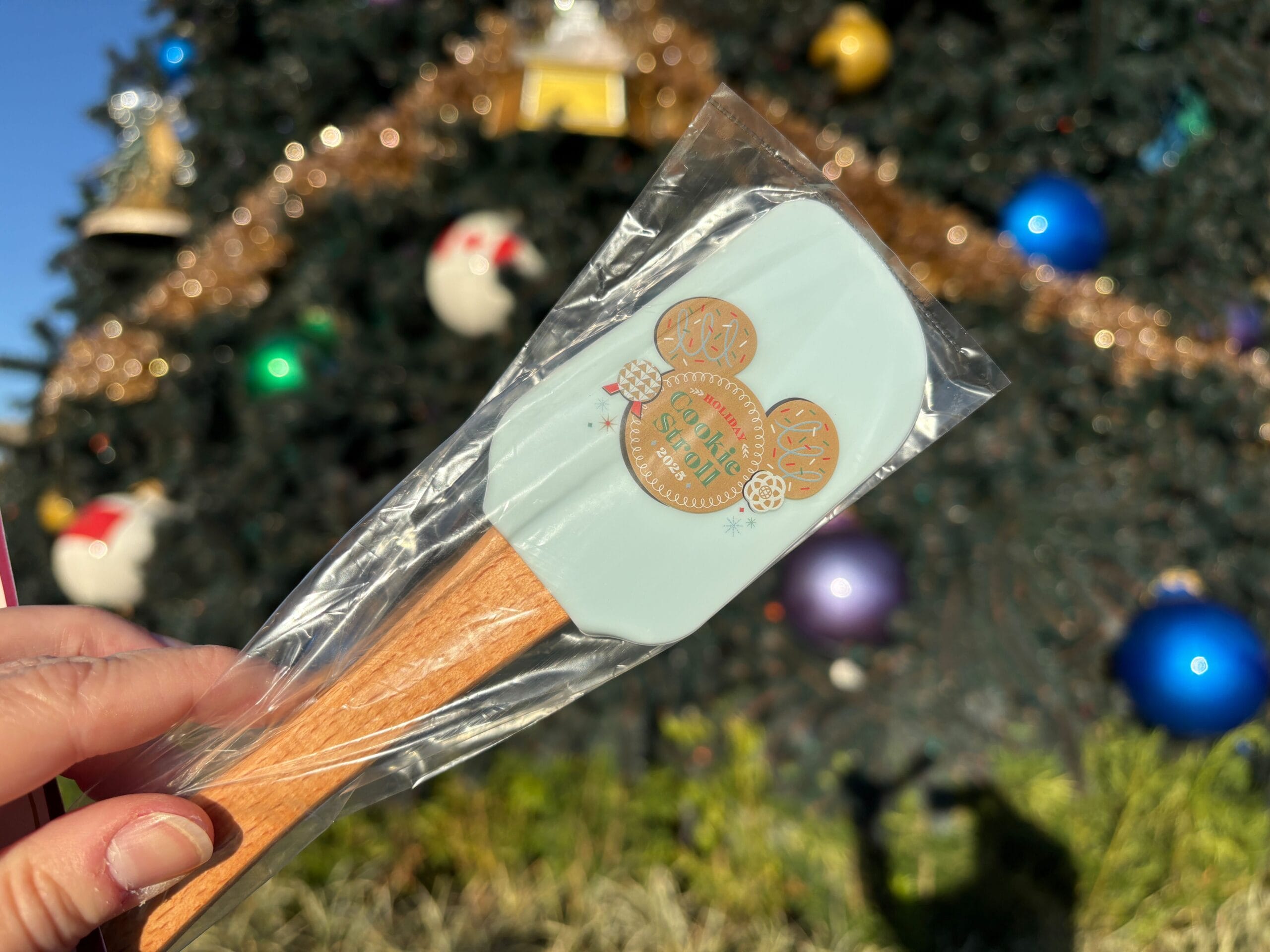 The spatula is icy blue silicone printed with a Mickey cookie and the text “Holiday Cookie Stroll 2025,” accented with a small Spaceship Earth cookie. The handle is embossed with the Epcot logo. The spatula also comes with a tube of holiday M&M’s Minis and a recipe card for peanut butter cookies.