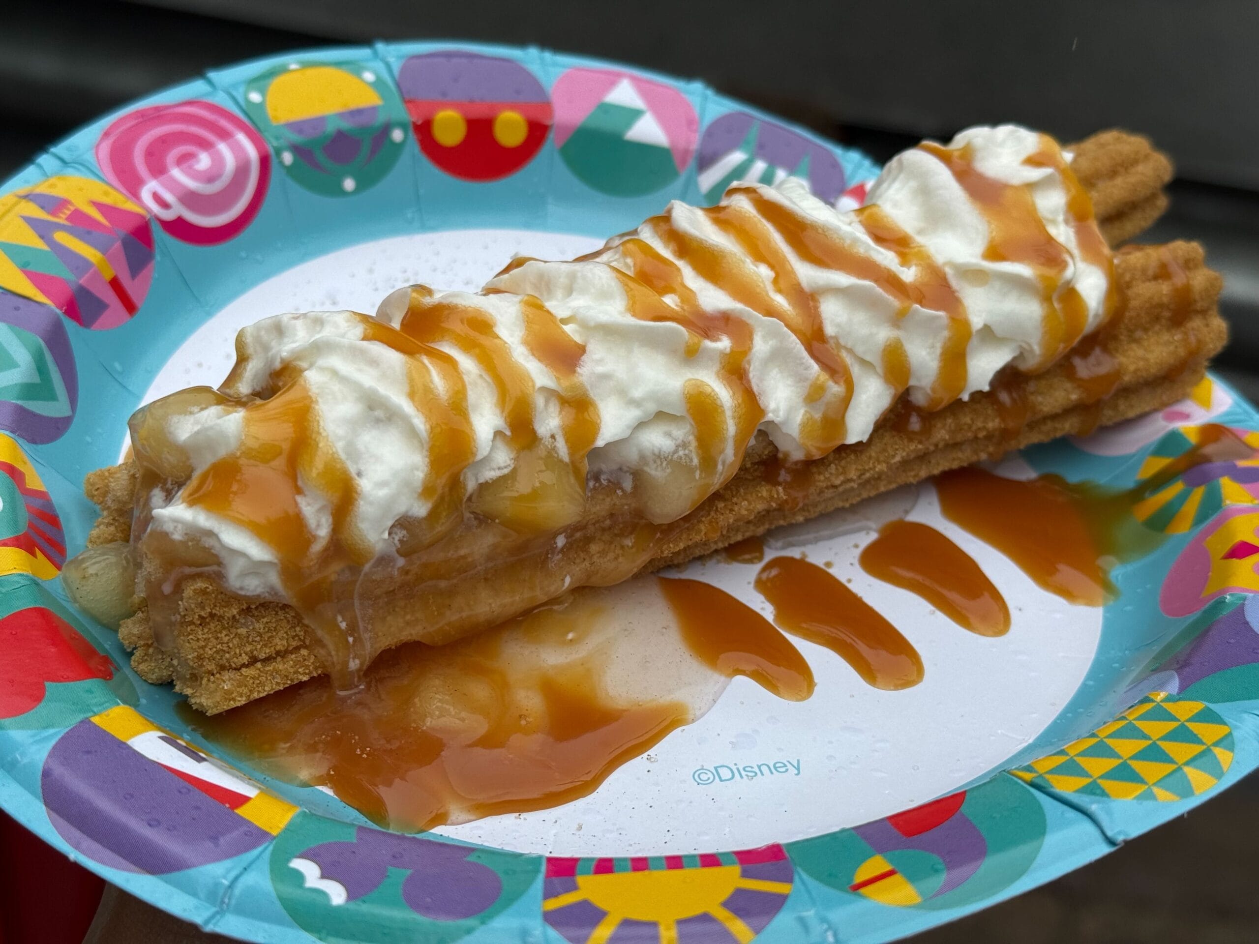 Classic churro with graham cracker sugar, apple pie filling, whipped topping, and caramel