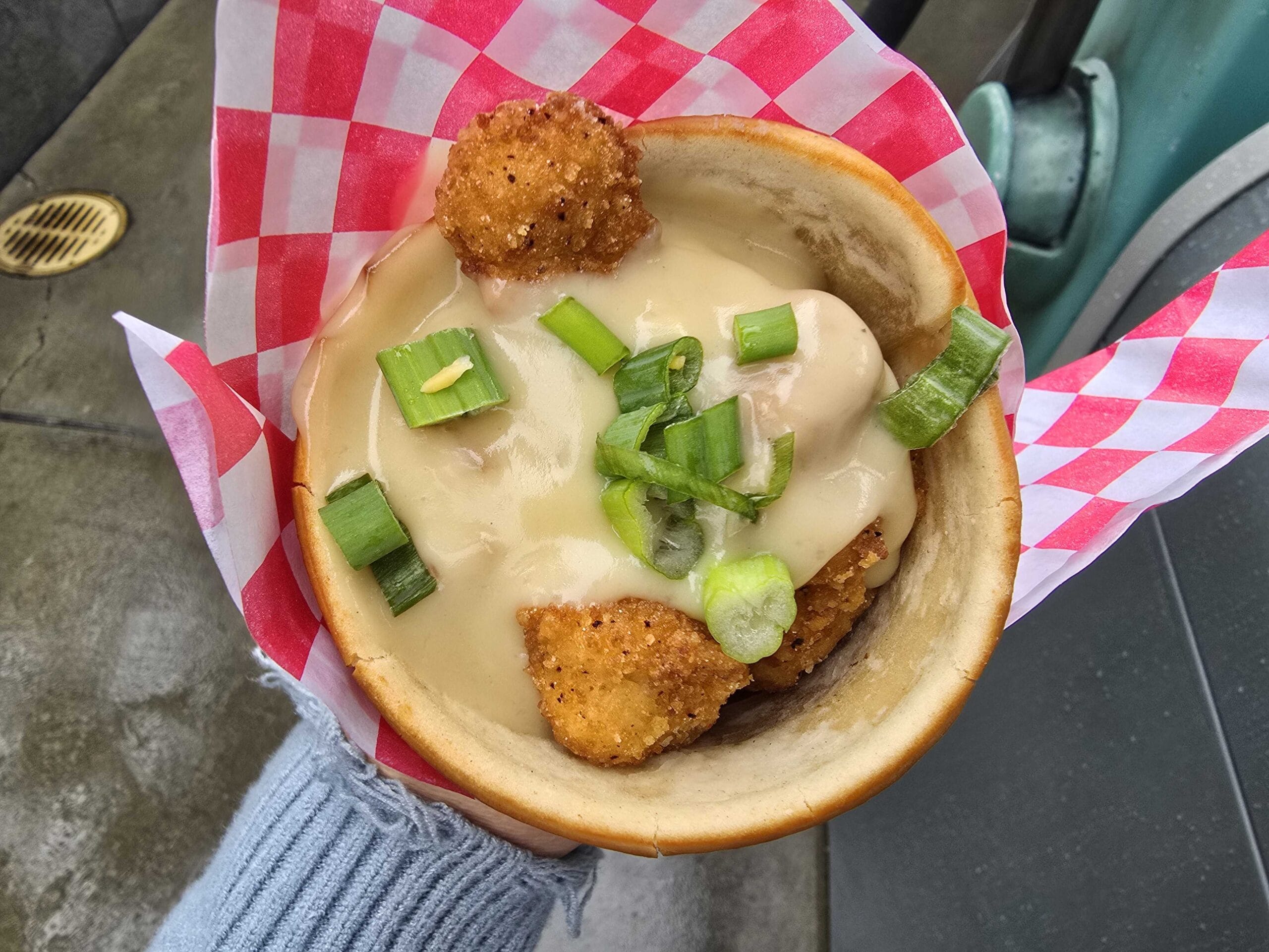 If you like the KFC Famous Bowl, this is basically it. The “chopped fried chicken” is actually small pieces of overly salty popcorn chicken. The mashed potatoes, corn, and gravy were good, but the saltiness of the chicken was the dominant flavor, which was impressive considering we only had six small pieces of chicken on top.