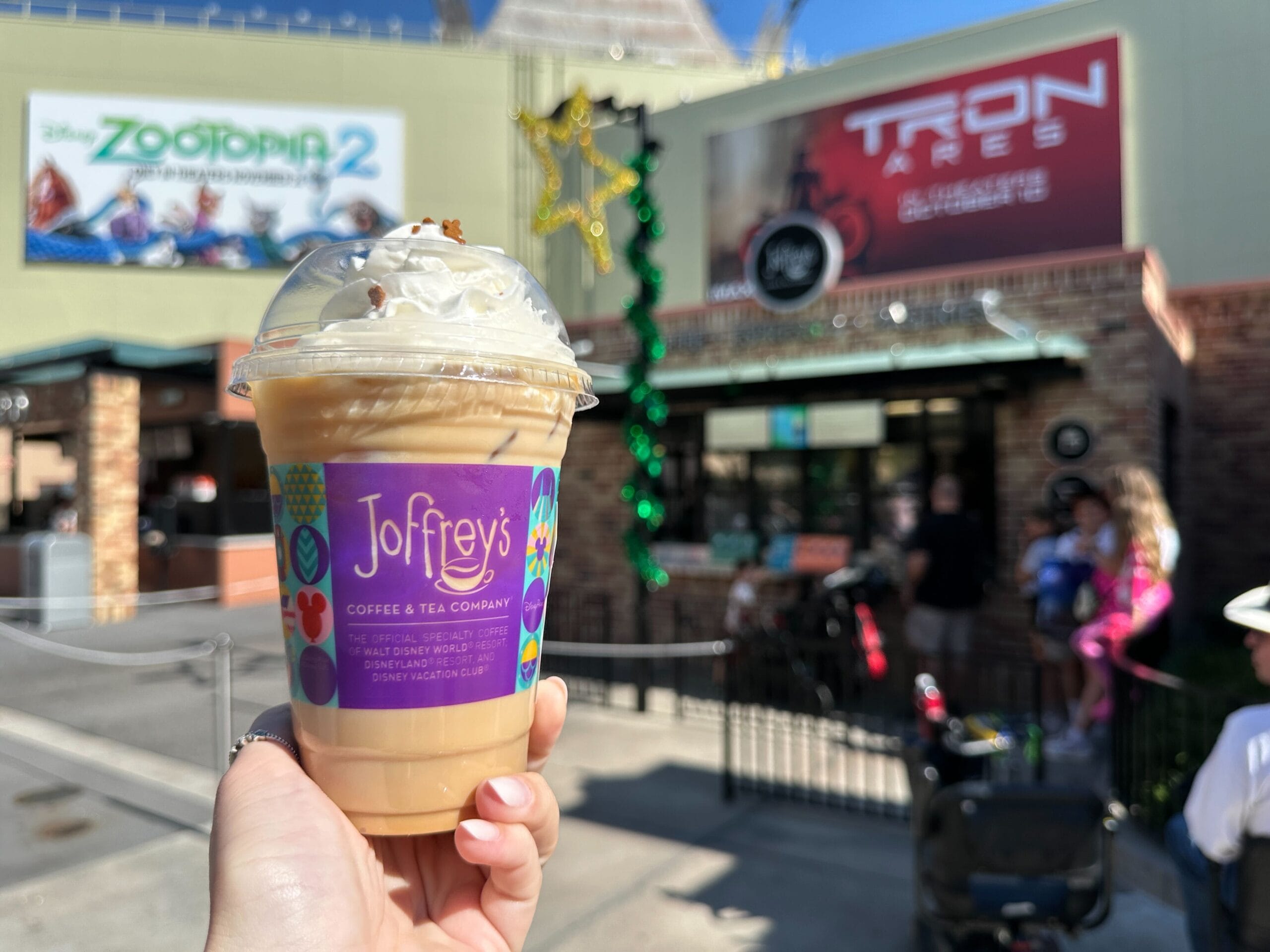 It’s time for our fourth Annual Passholder-exclusive Joffrey’s holiday drink of the season. We already tried the Cocoa & Spice hot chocolate, Yuletide Log Mocha, and Cheerful Elf Latte. Now we’re getting the Cookie Butter Gingerbread Latte at Disney’s Hollywood Studios.