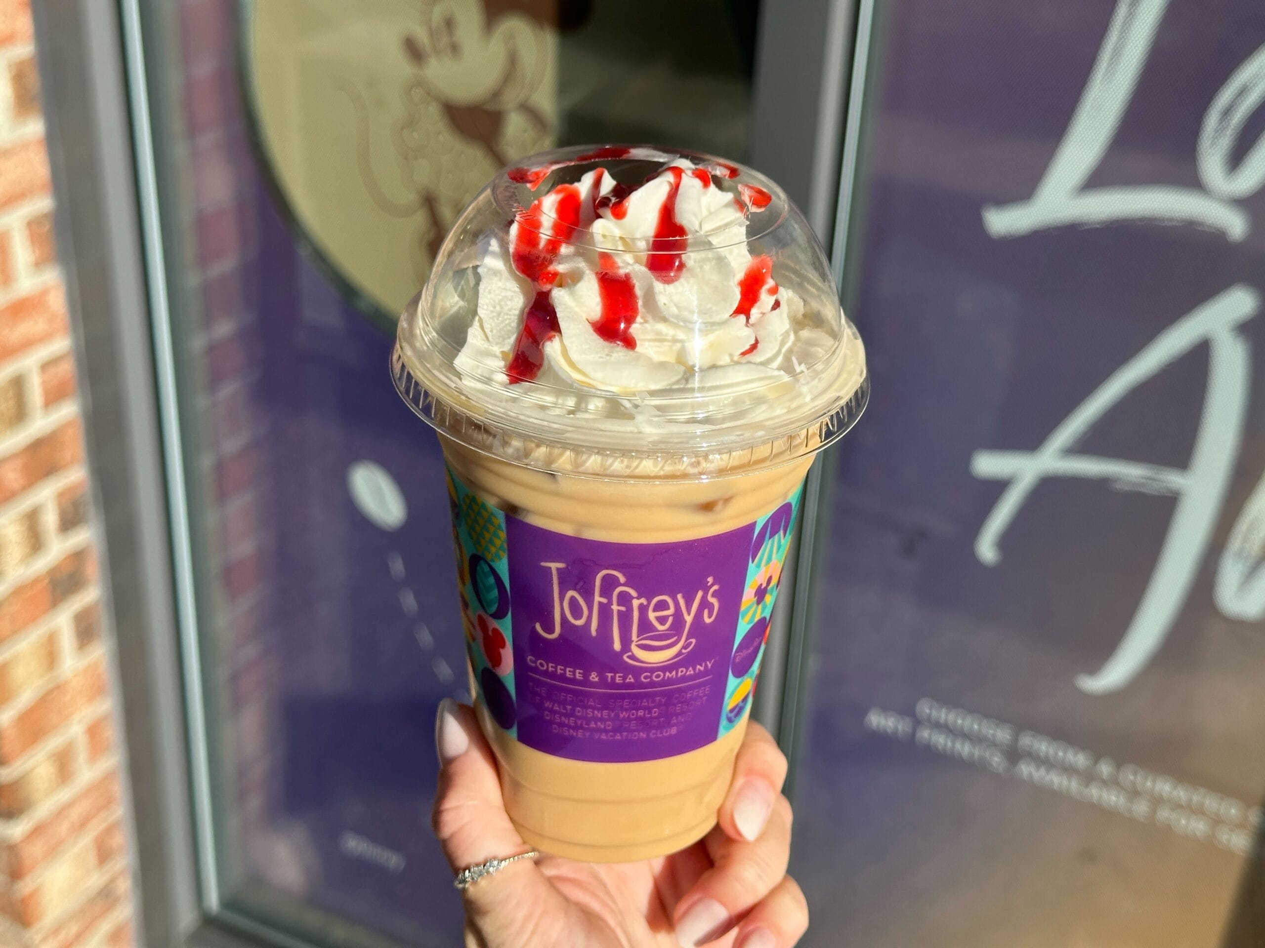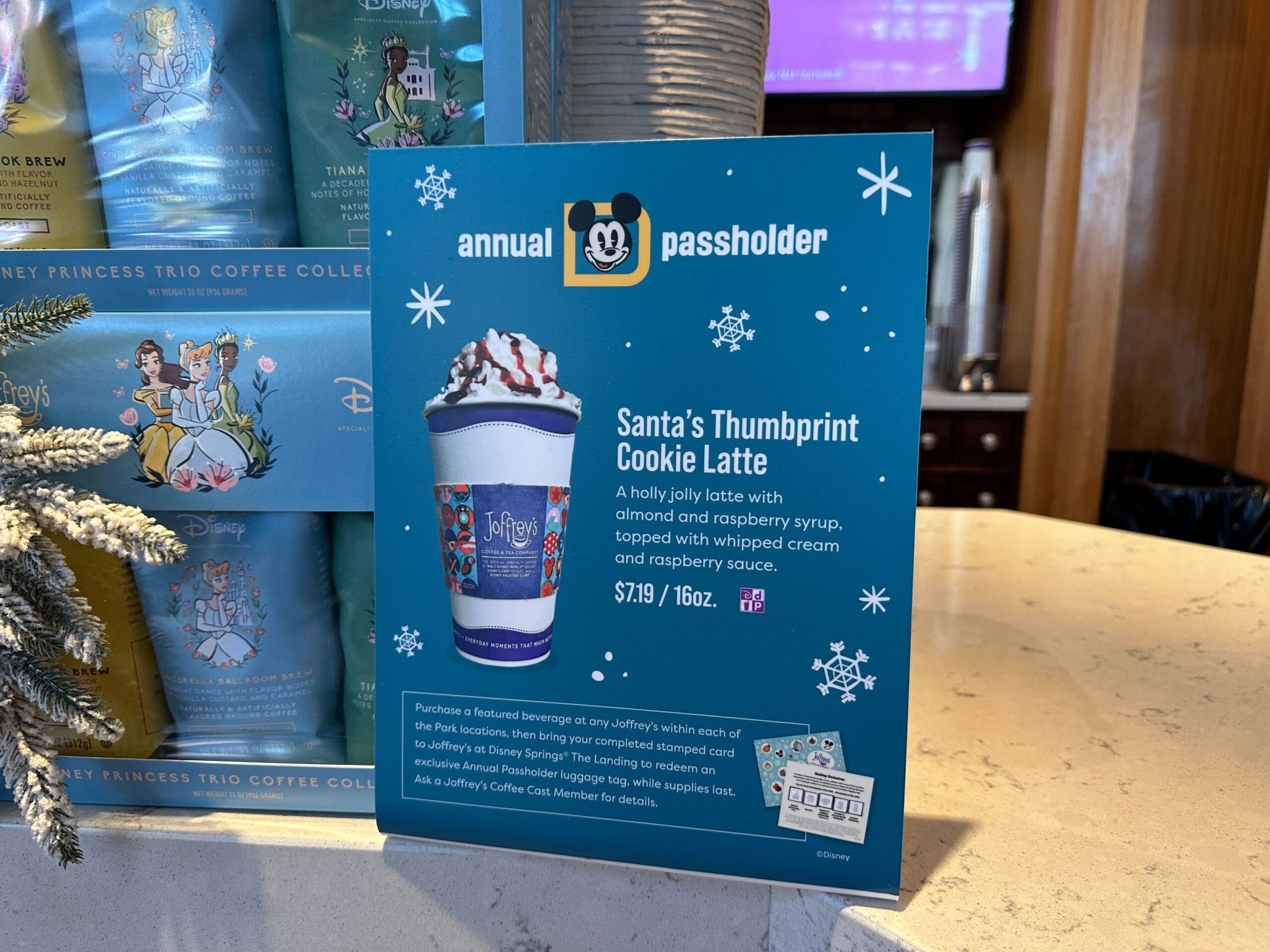 There’s one more Annual Passholder-exclusive holiday drink from Joffrey’s Coffee & Tea Company for us to try: the Santa’s Thumbprint Cookie Latte. This is available at the Disney Springs Joffrey’s, where you can also pick up your complimentary Passholder magnet if you purchase all five drinks.