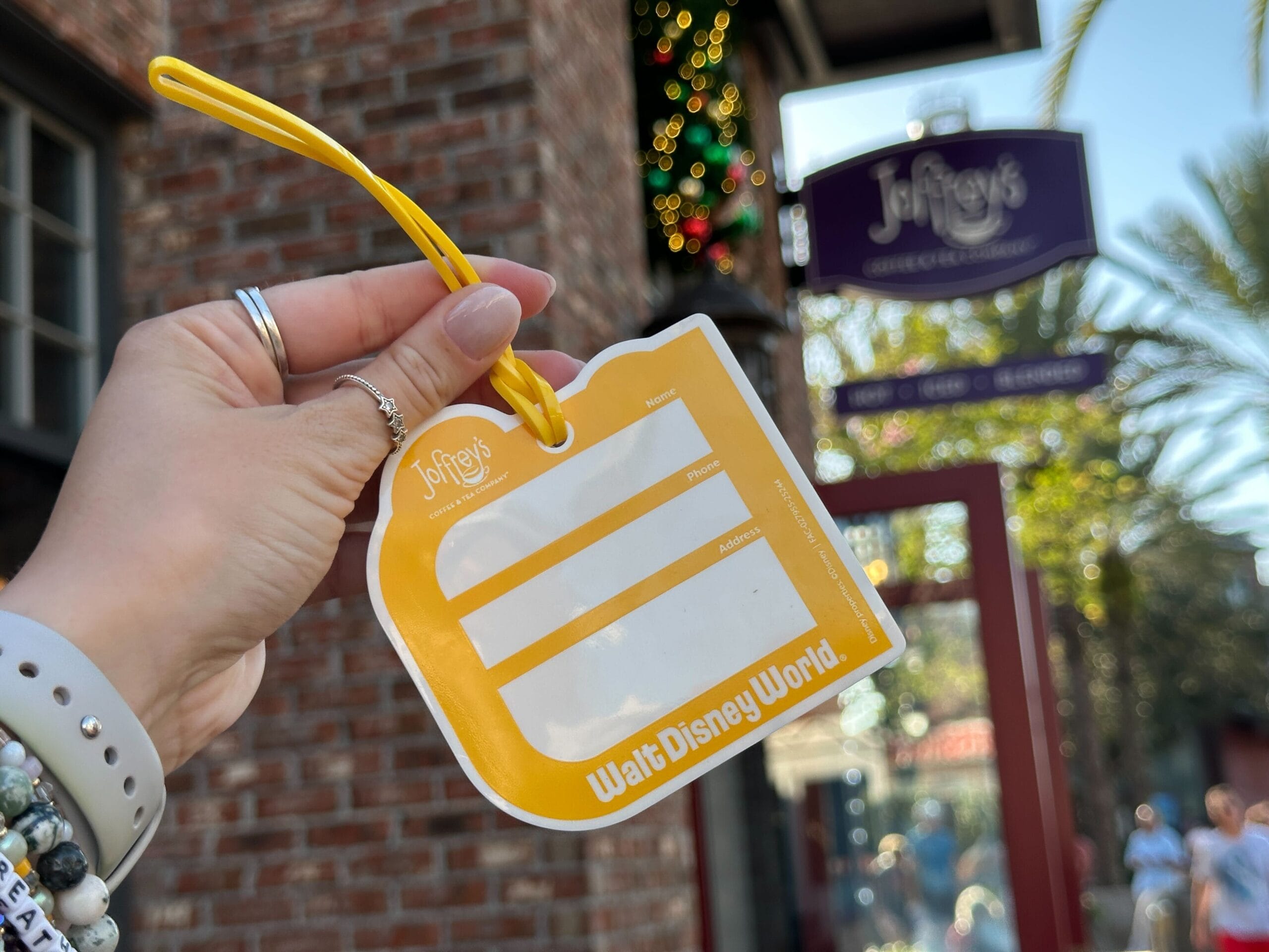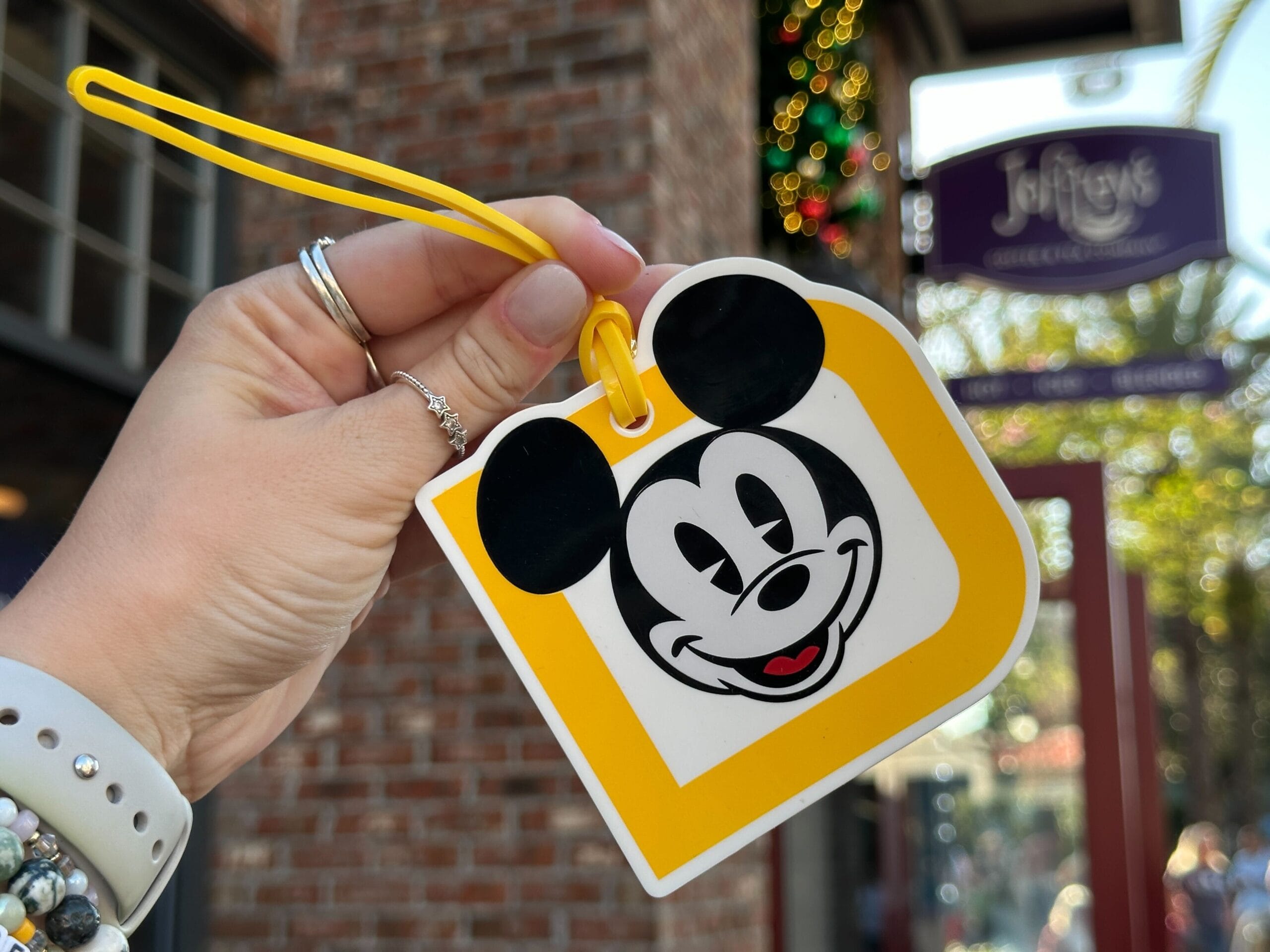 When you buy any one of the exclusive drinks, you will get a card. As you buy each drink, Cast Members can stamp your card. Once you’ve bought all five, the Disney Springs location will give you this Passholder luggage tag. It’s thick rubber and features the yellow Passholder “D” logo with Mickey’s face. On the back are blank spots to fill in your name, number, and address.