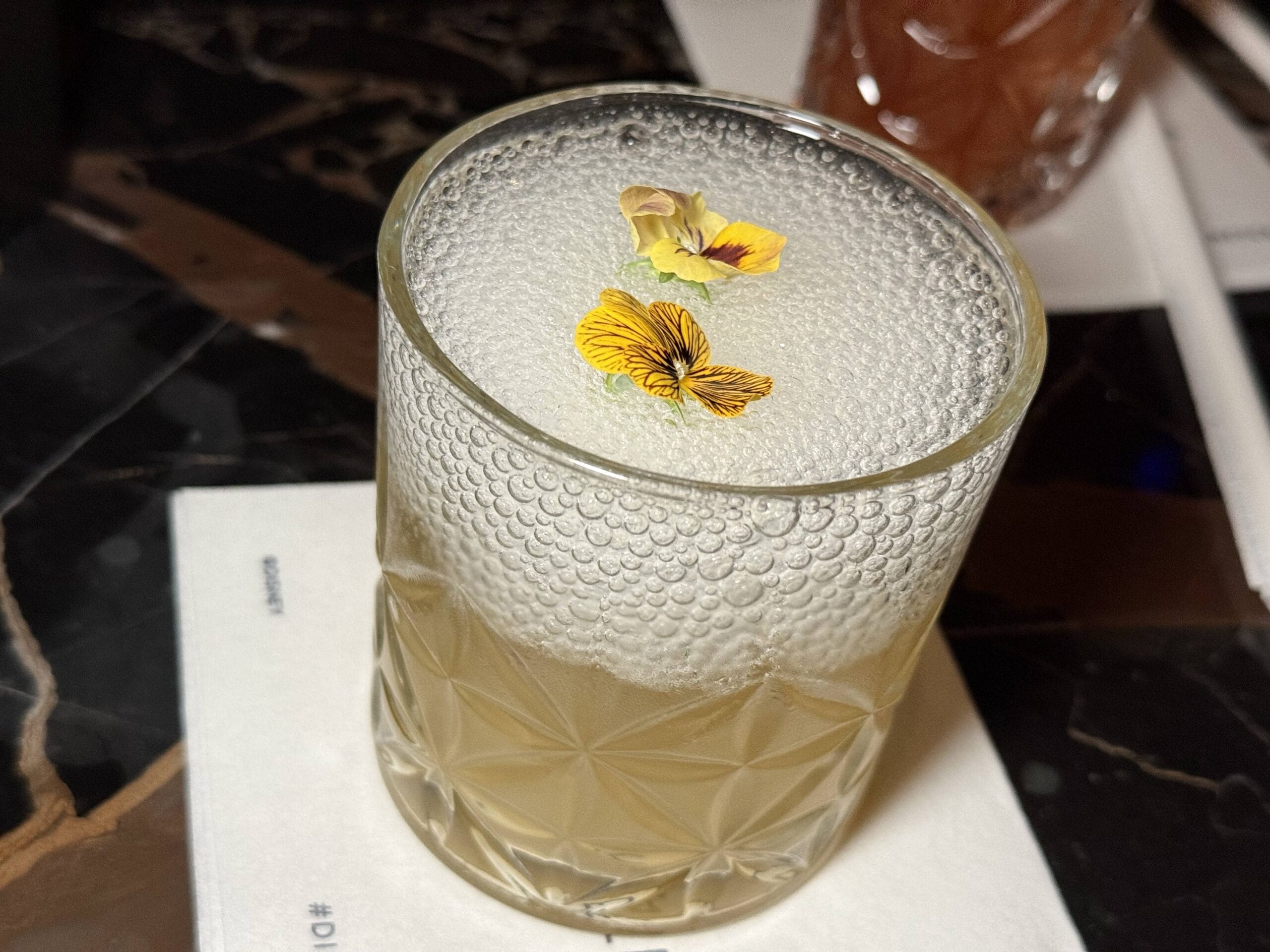 Cognac, Cointreau Noir, Joto Yuzu Sake, Orange Blossom Foam, Edible Viola Flowers