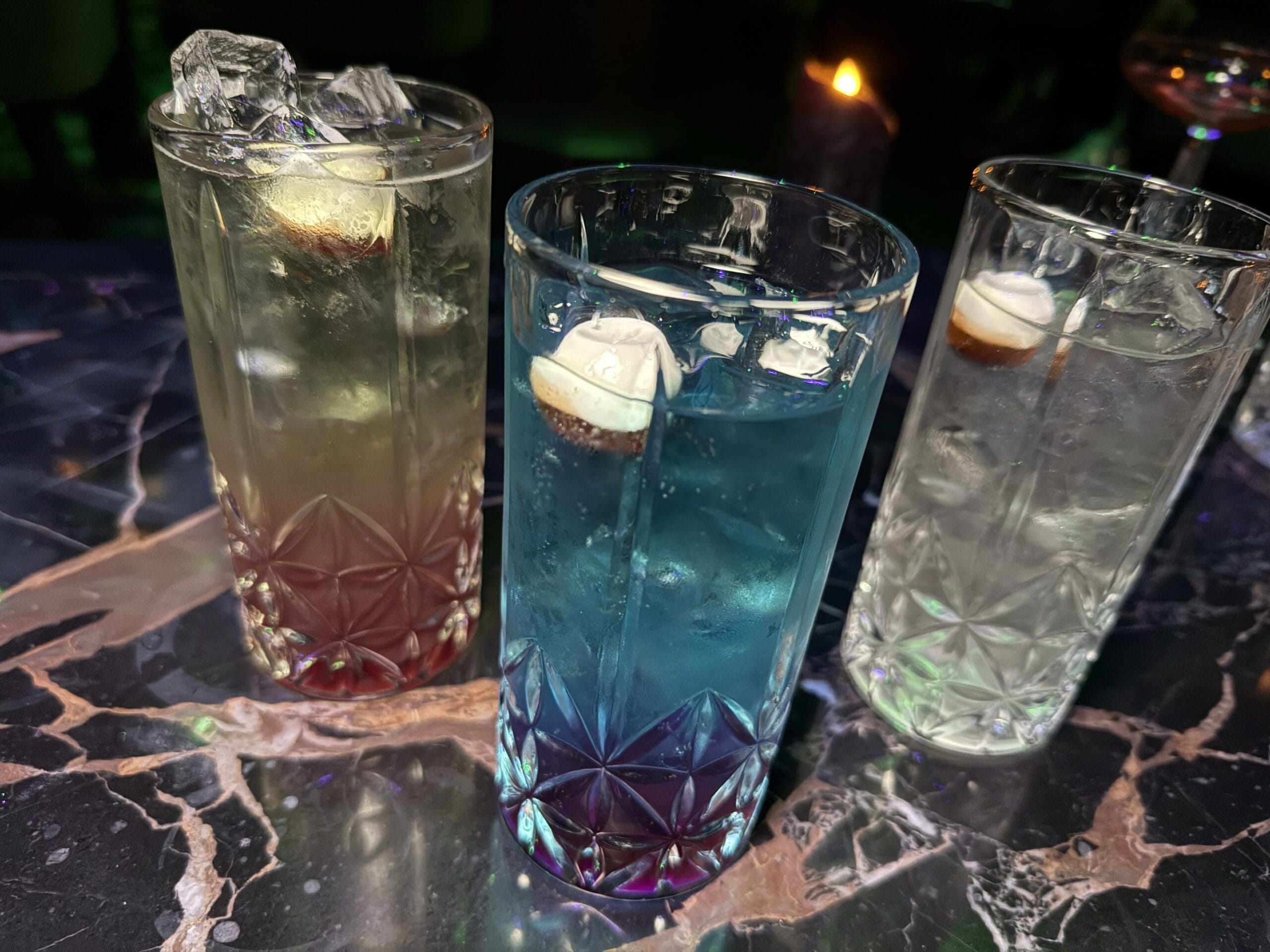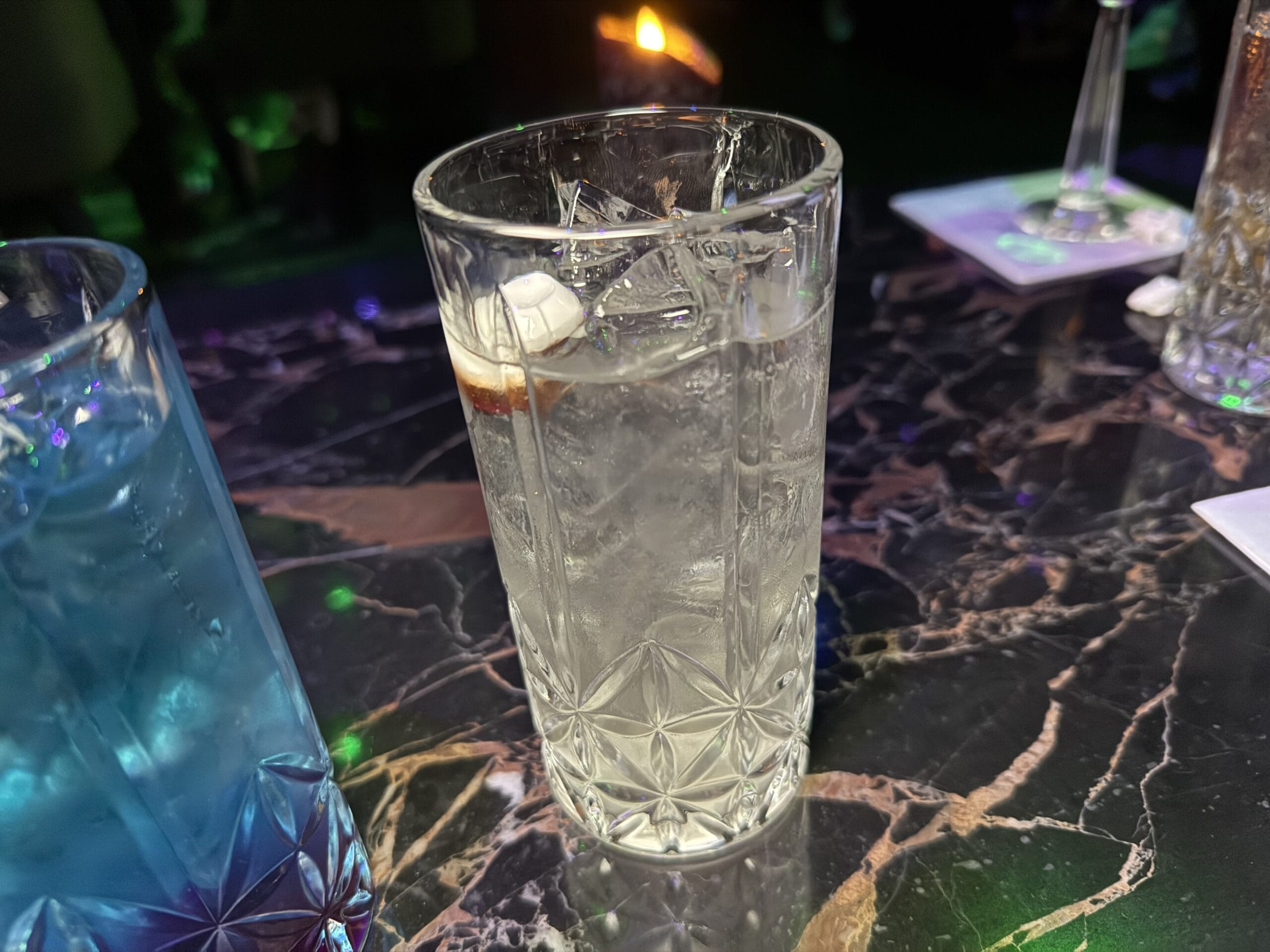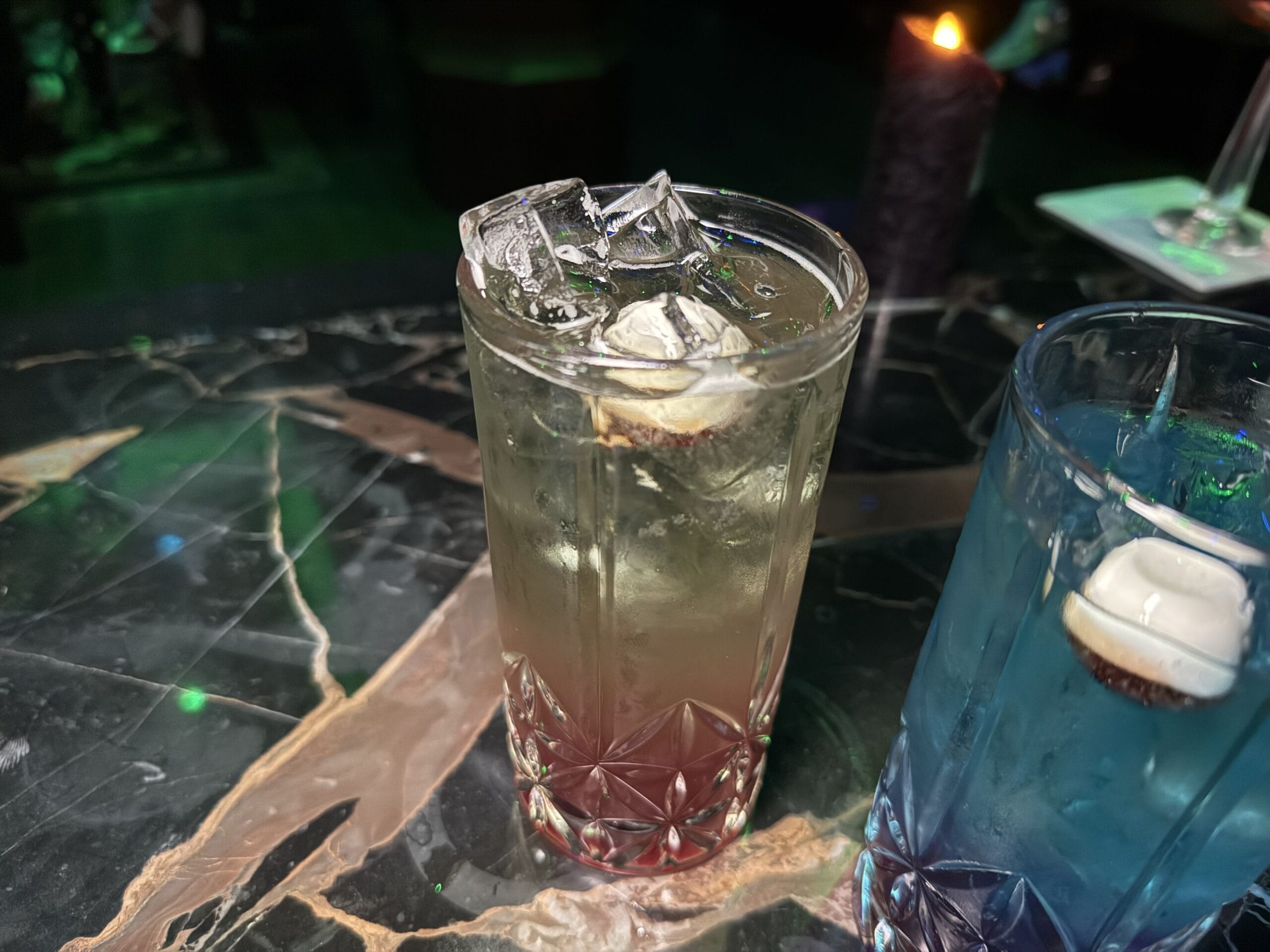 This drink has the same name and presentation as the menu offering on the Treasure, but it’s new drink. Our first impression is that there are a lot of bubbles, and they overpower the rest of the drink. It tastes like drinking soap. Once you get through it, it does not get better, unfortunately. It is watery with a bitter cleaning solution taste. The presentation is really neat with the Death Certificate, but it cannot save how bad the drink tastes.