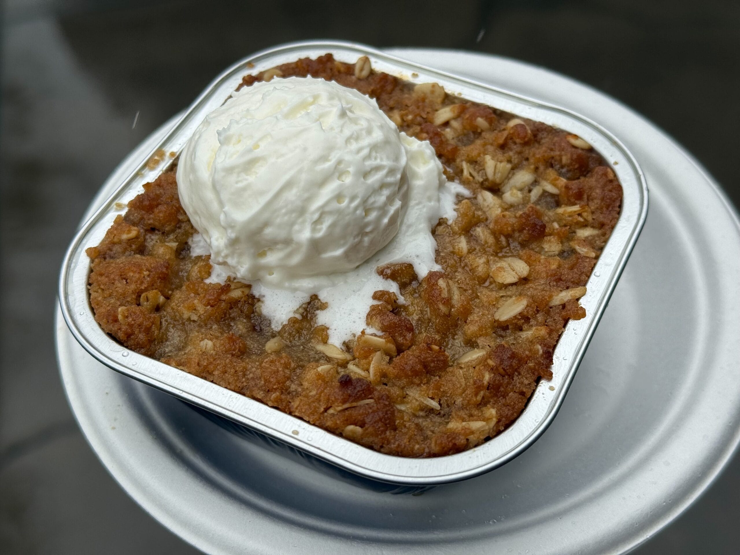 The vibe we got was apple pie filling topped with brown sugar oatmeal. The topping tasted more like granola than a typical crumble. The apple filling is the same used on the Apple Pie Churro at Cozy Cone Motel, so it has plenty of apple chunks but almost no spice to balance the sweetness.