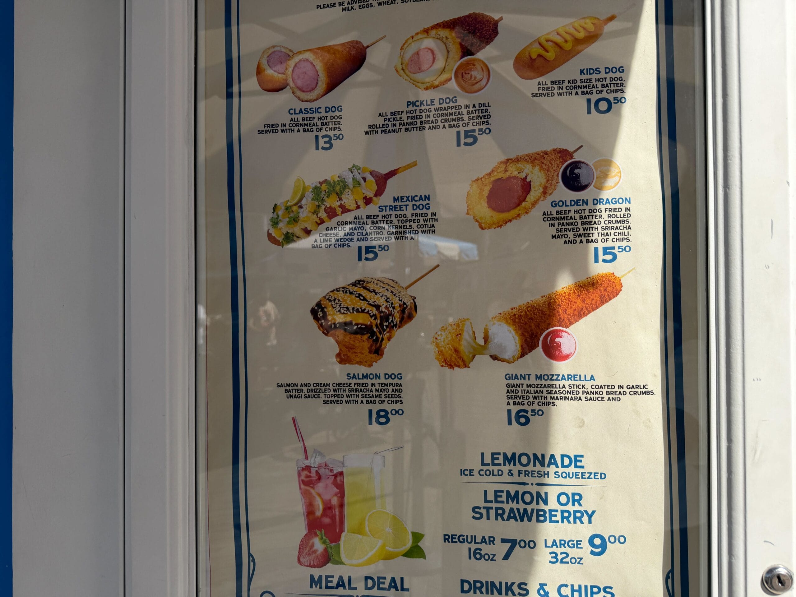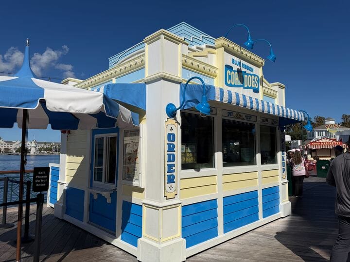 Blue Ribbon Corn Dogs is located on Walt Disney World’s BoardWalk, across from AbracadaBar and Trattoria al Forno. The location serves a variety of unique corn dogs, including a Mexican Street Dog and Pickle Dog. Read our review of the full menu at opening to find out if the kiosk is worth the trip.