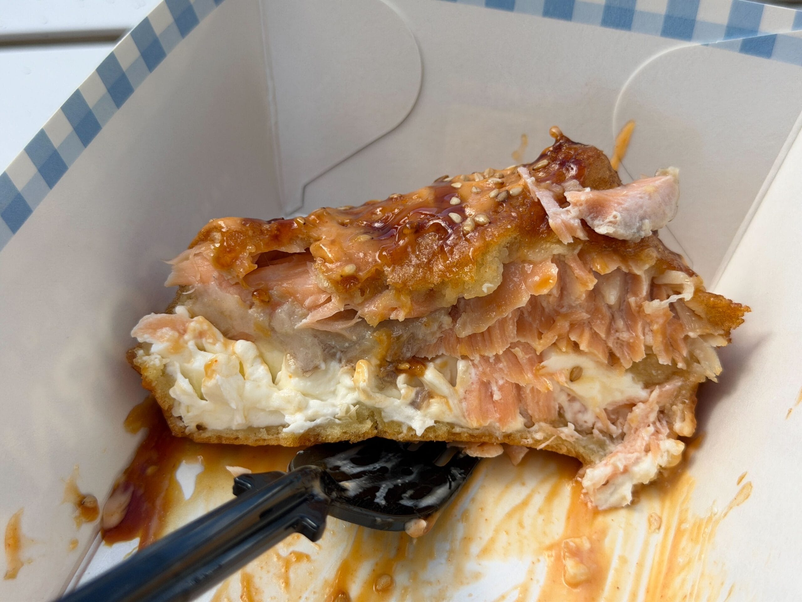 Since they used tempura butter, it’s not hard like other regular corn dogs. The salmon isn’t over cooked and the cheese and eel sauce kill the overly fishy smell and taste of the salmon. If you like baked salmon in general or any sushi with salmon and eel sauce or sriracha mayo, you’ll like this. We would come back and get this for sure. Again, it is messy, so be prepared with a fork, knife, and napkins. (One final thought from our reporter: “I want rice!”)