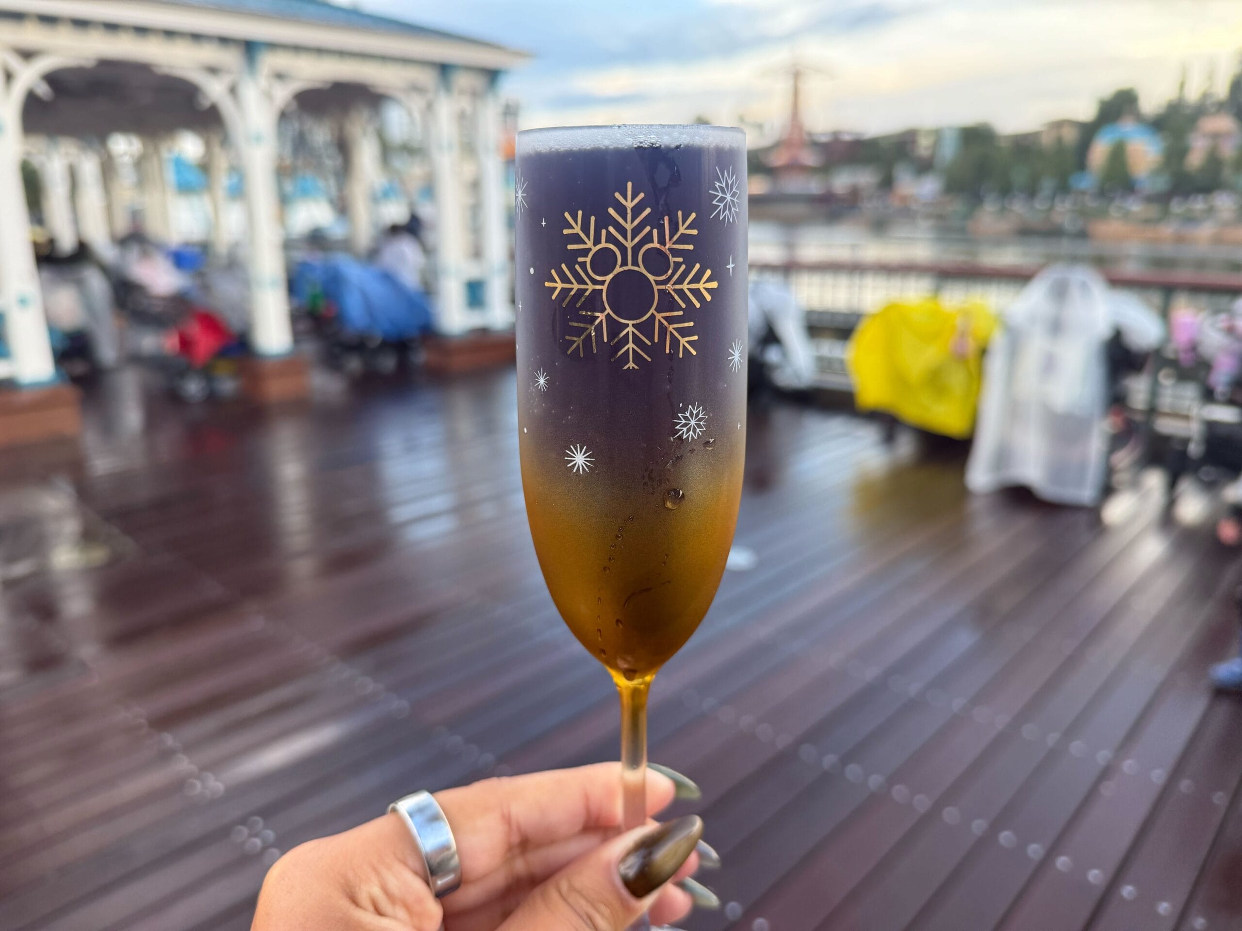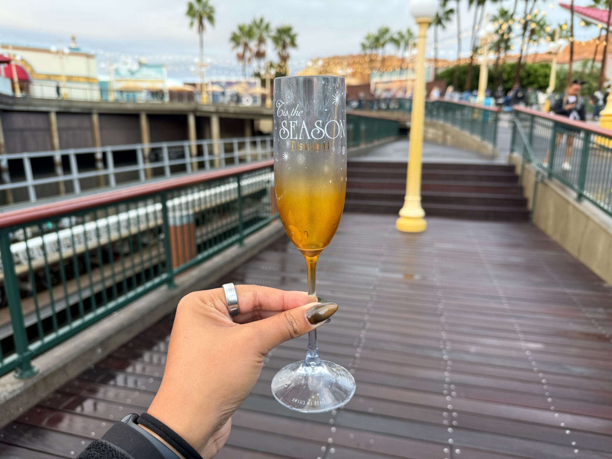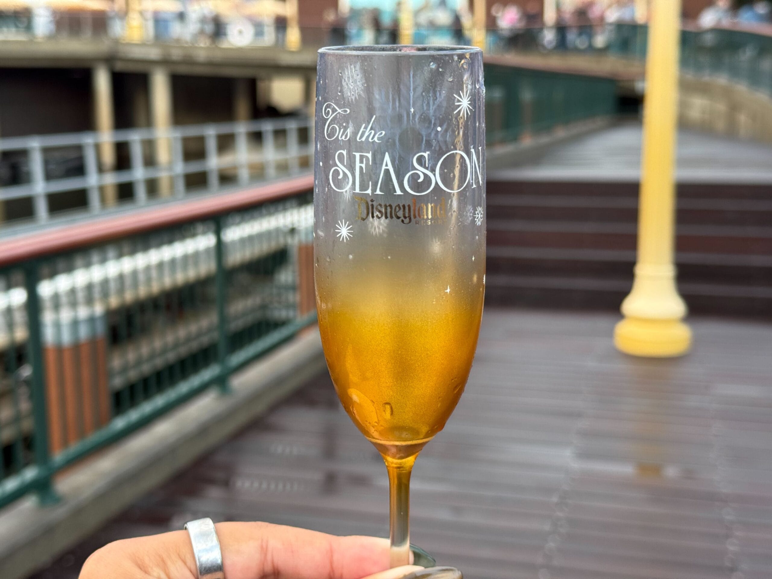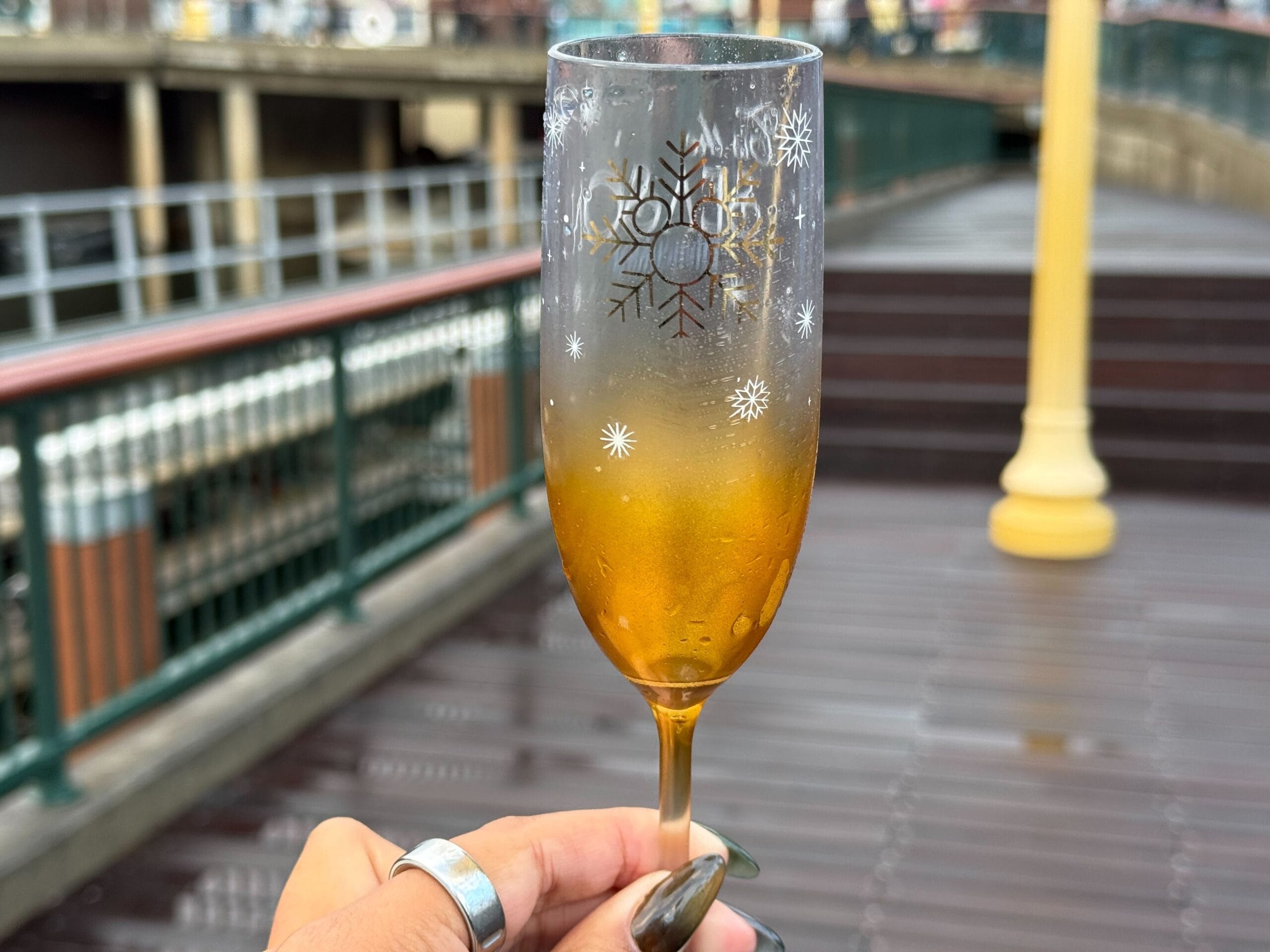 The flute is transparent with a yellow-gold ombré design. On one side is “Tis the Season” in white with the Disneyland wordmark in gold. On the reverse is a large golden Mickey snowflake. Small white stars and snowflakes are across the surface.