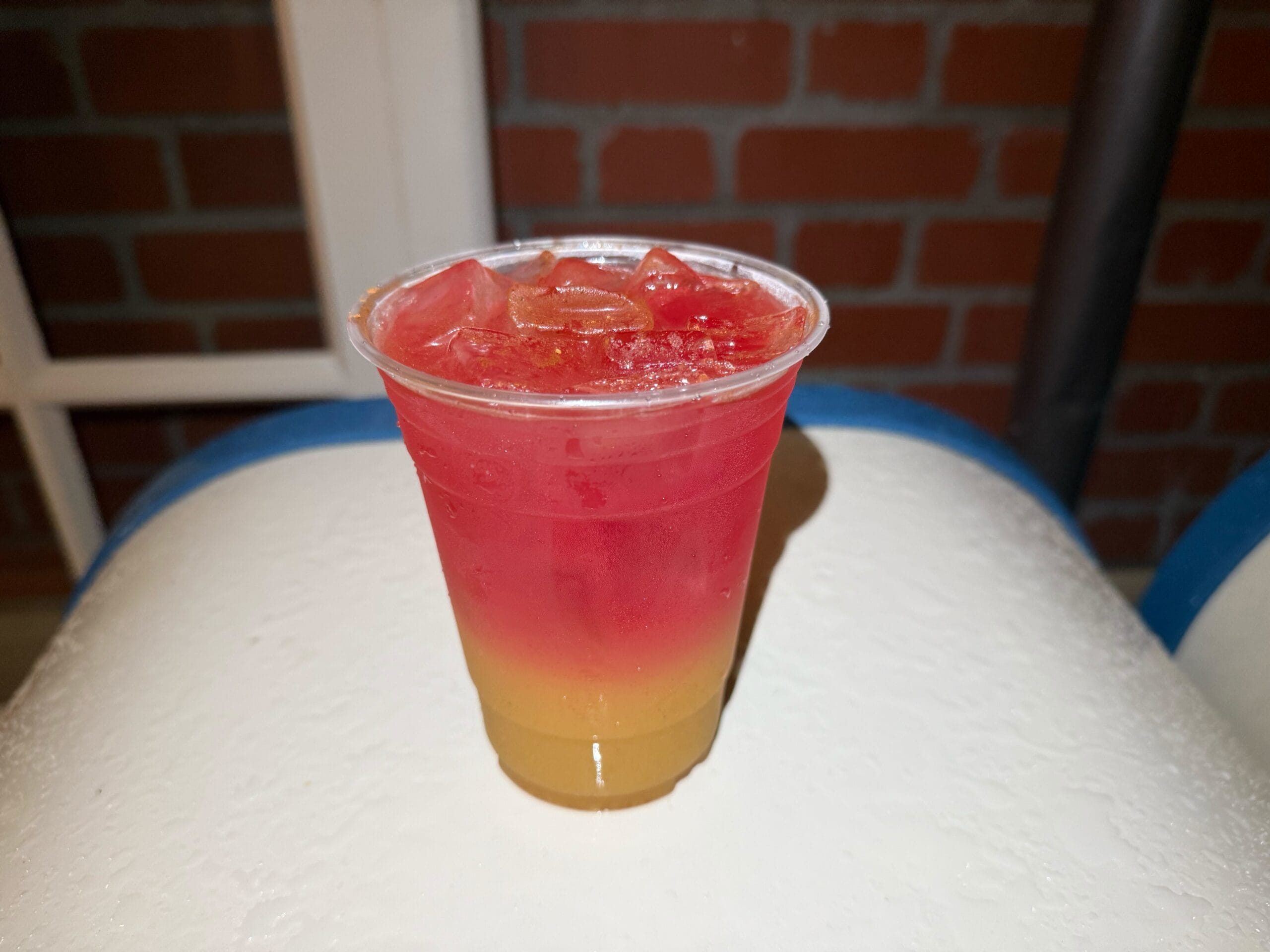 Despite its electric blue color, the flavor of this beverage is fresh and juicy, with the sweetness coming from the blend of juices as opposed to anything artificial. It’s a nice blend of tropical juices with coconut. The gummy is a basic blue raspberry gummy slice.