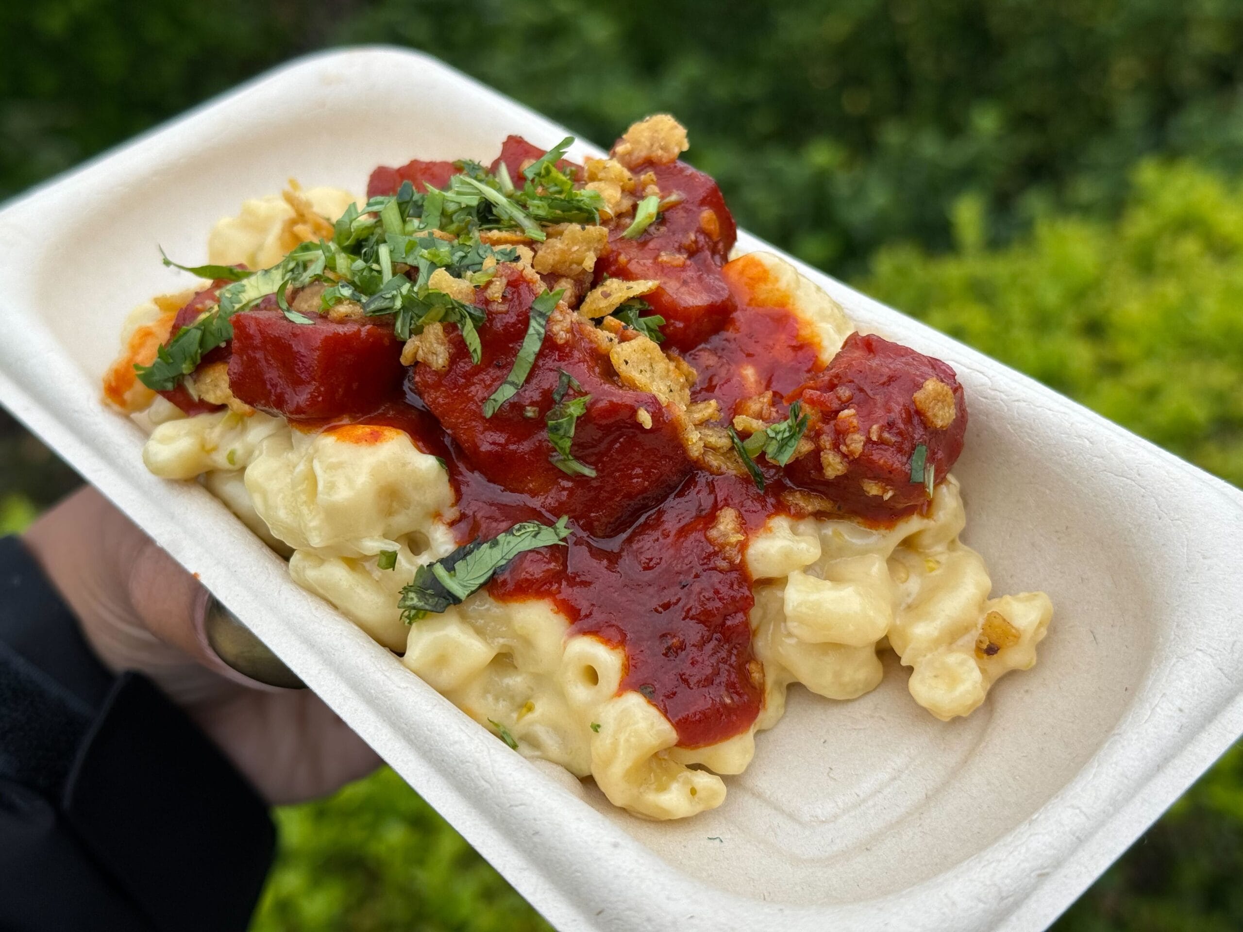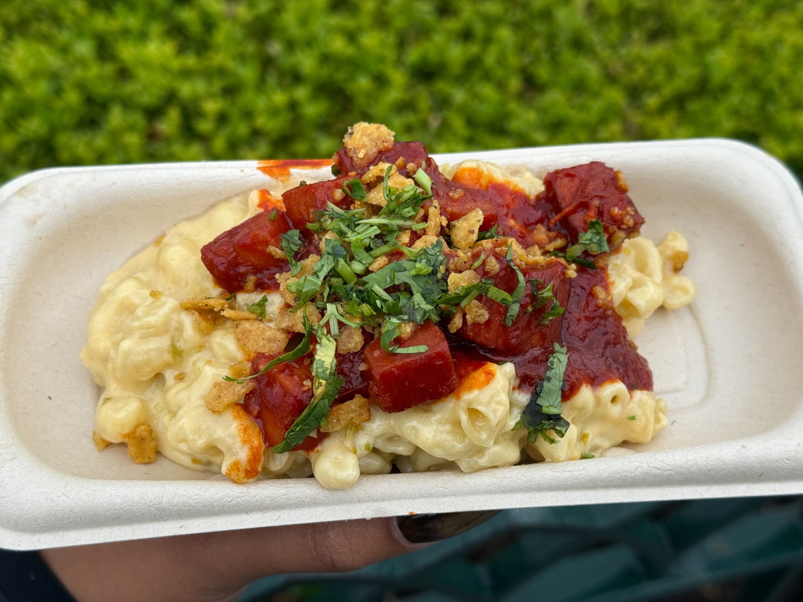 This is a solid riff on mac and cheese. The meat is tender and flavorful, blending well with the creamy, cheesy pasta. The crushed tortilla chips are a good textural stand-in for the traditional breadcrumbs. We just wish there wasn’t so much cilantro on top.