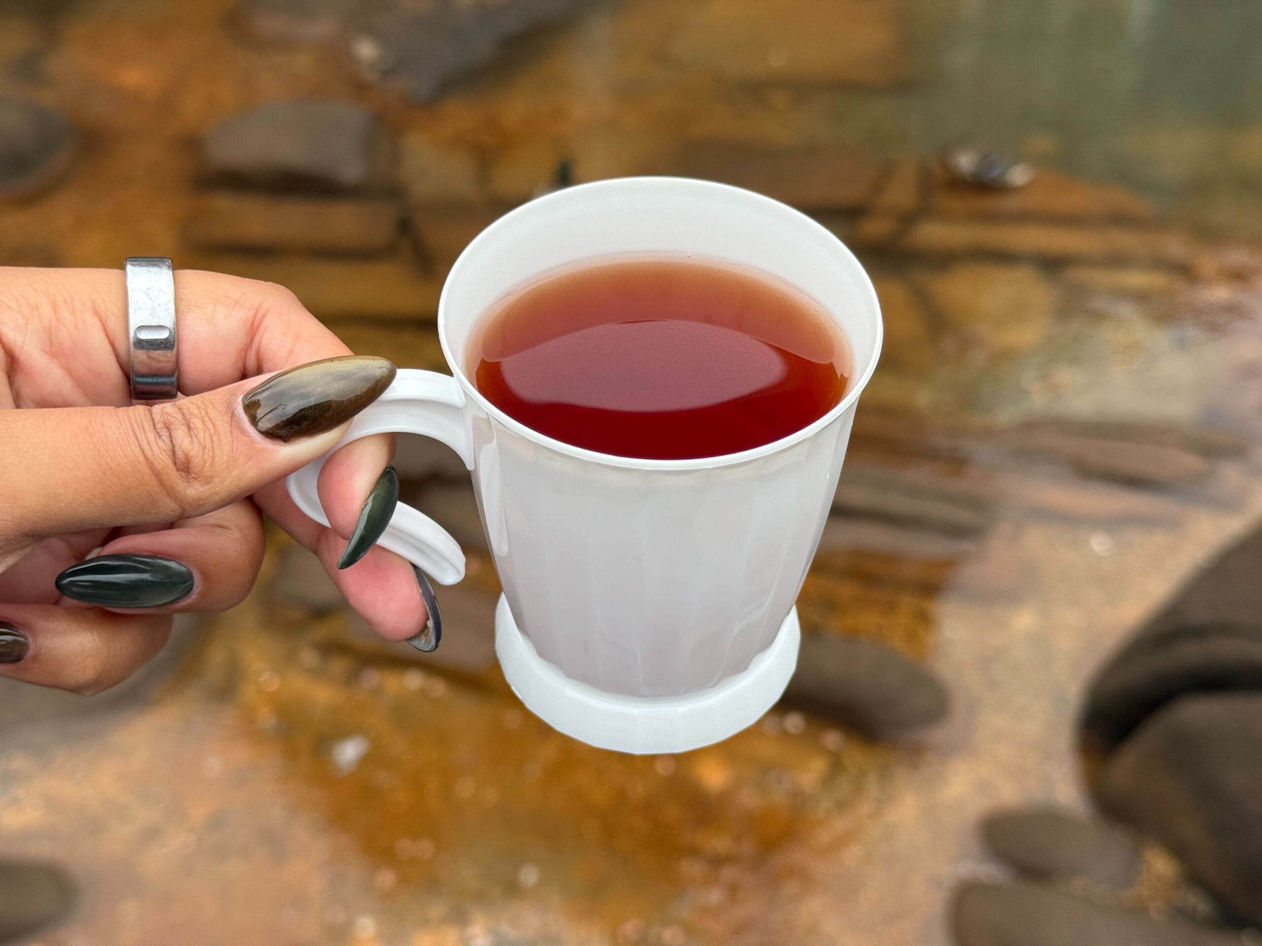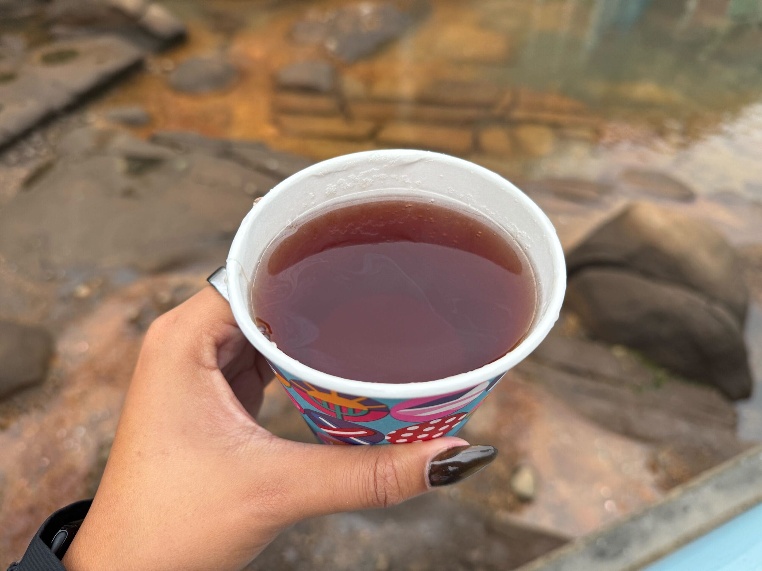 It tastes like warm cranberry-blueberry juice. We got a whiff of fake blueberry before we even took a sip. There’s barely any apple flavor at all — you have to keep drinking it to taste it — or even a hint of mulling spices that would make it feel like cider.