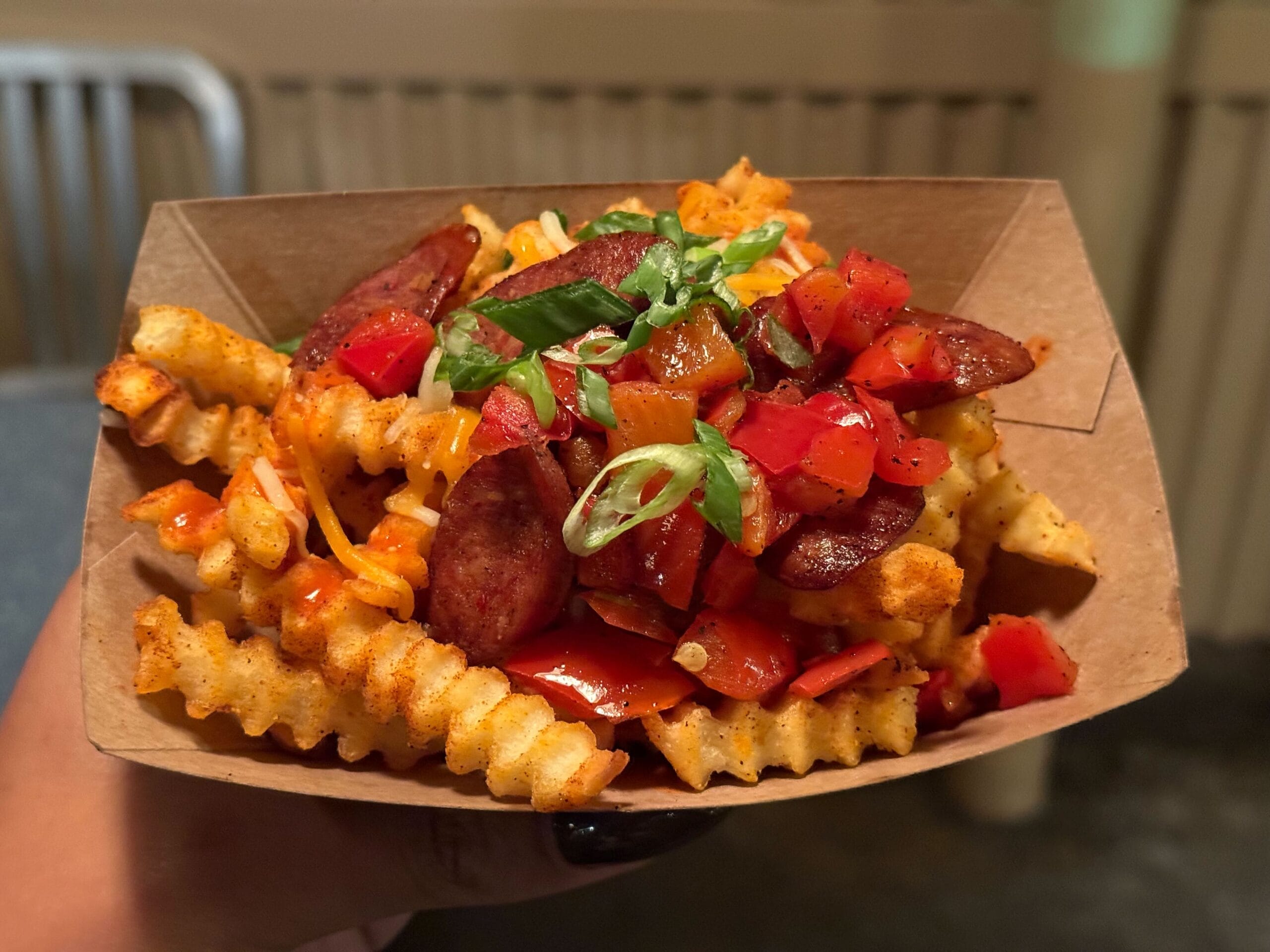 Cajun fries topped with hot links, cheddar cheese, corn, and bell peppers
