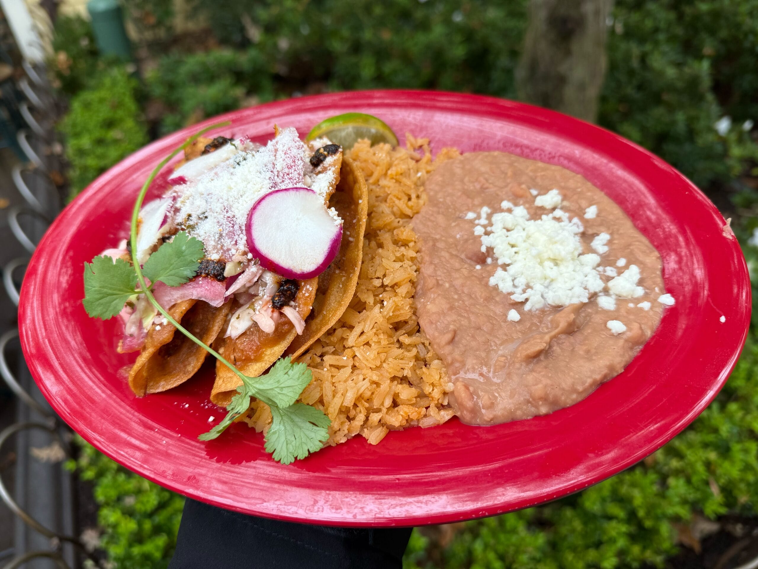 These two tacos packed a punch! The shrimp isn’t individual shrimp but a seasoned shrimp patty. The protein and salsas are definitely on the medium to hot side — if you’re spice-averse, steer clear.