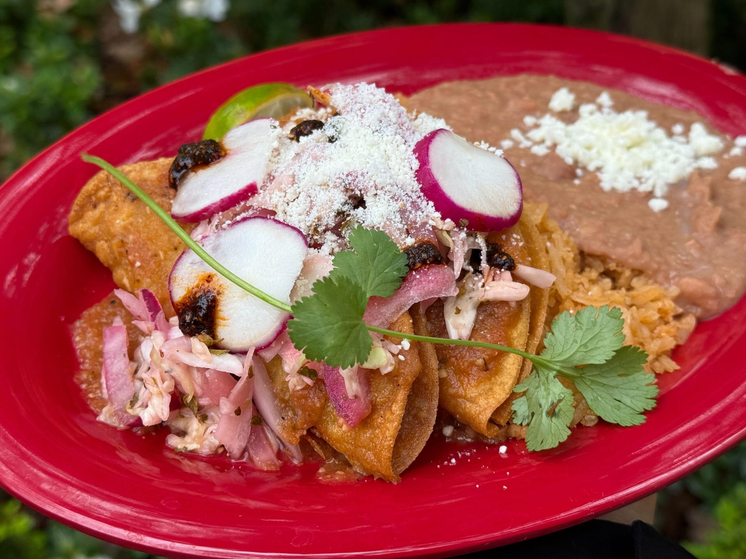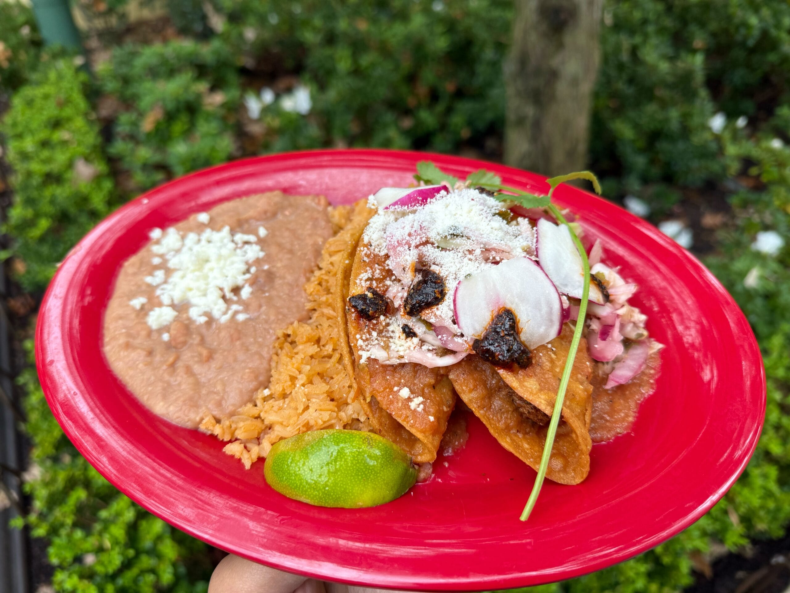 Two shrimp tacos fried to a golden brown topped with zesty slaw, salsa roja, salsa macha, and crema served with Spanish rice and refried beans