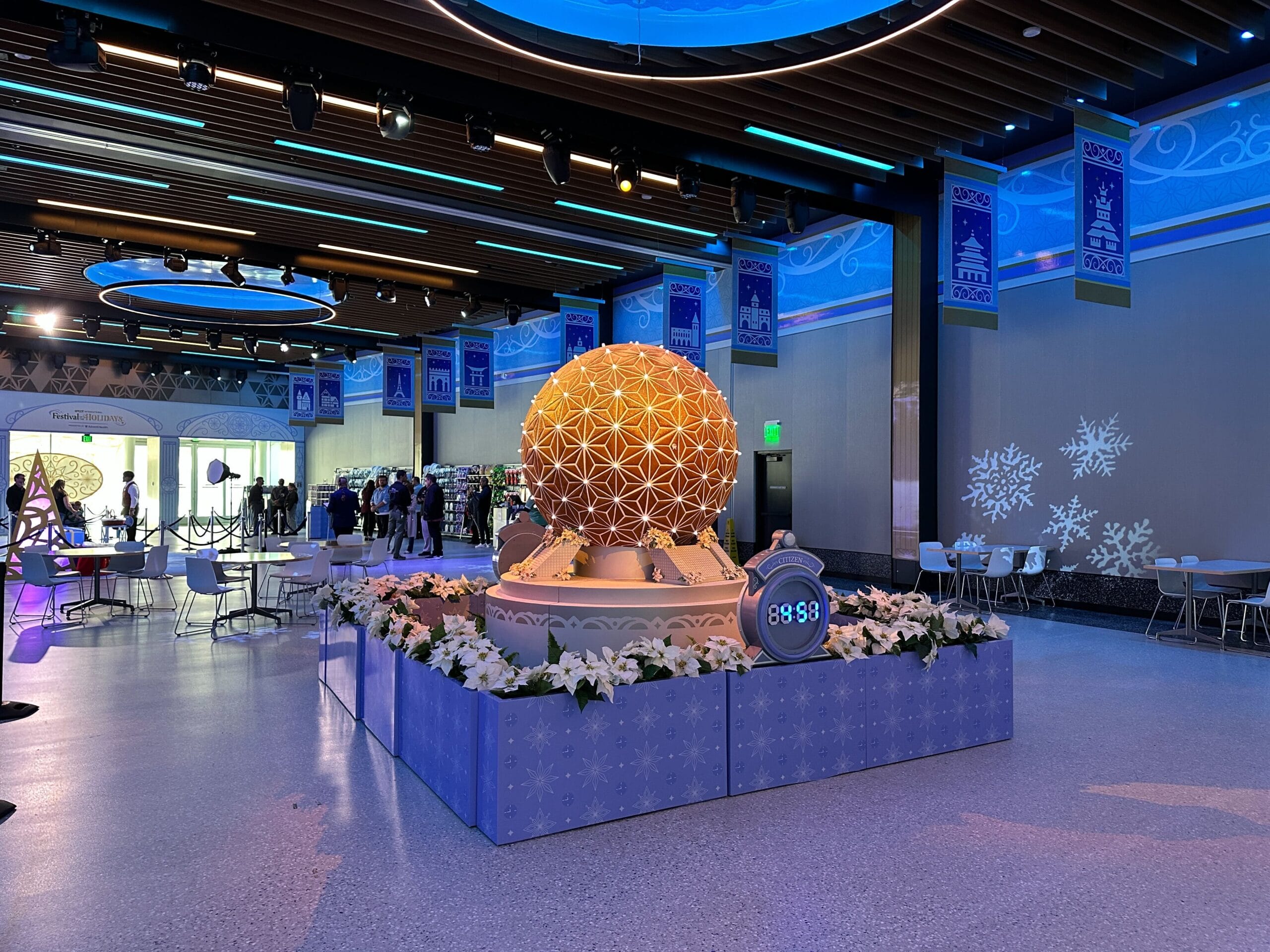 CommuniCore Hall is decked out for the 2025 EPCOT International Festival of the Holidays, including the Spaceship Earth gingerbread display and Santa Claus meet and greet. The latter has moved from The Odyssey pavilion, where Santa Goofy will meet this year.