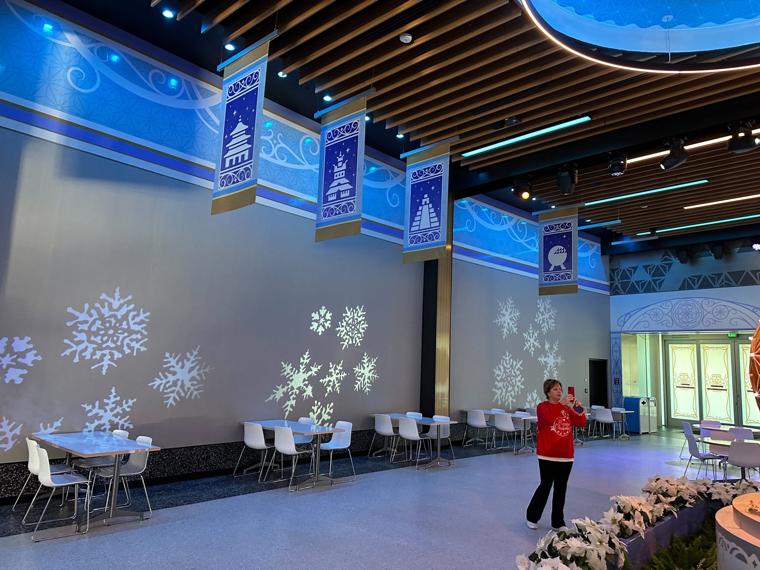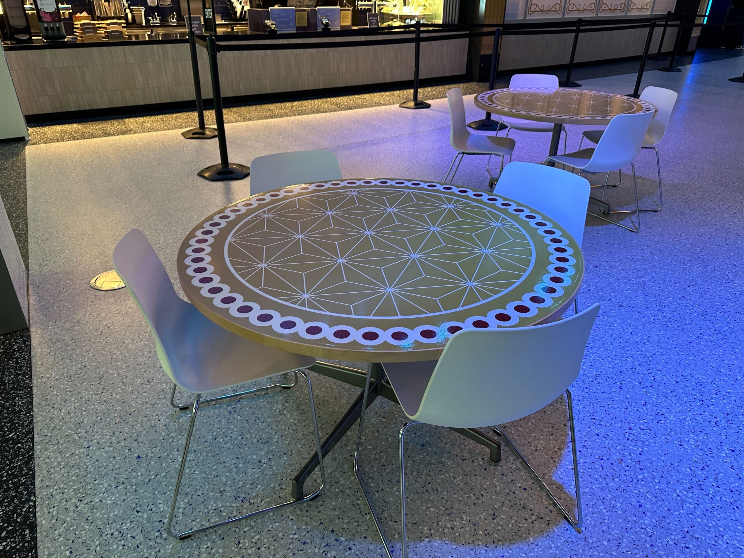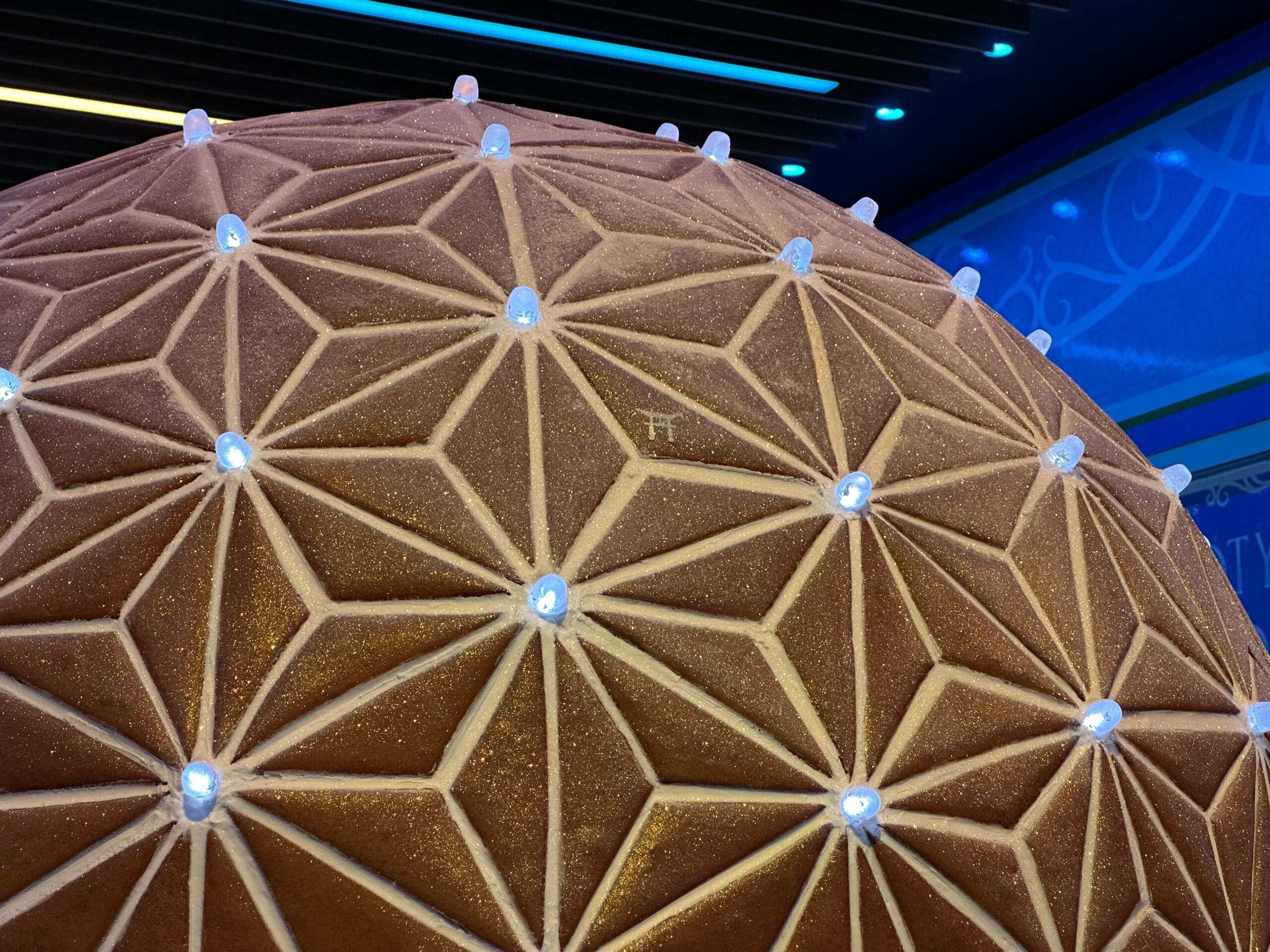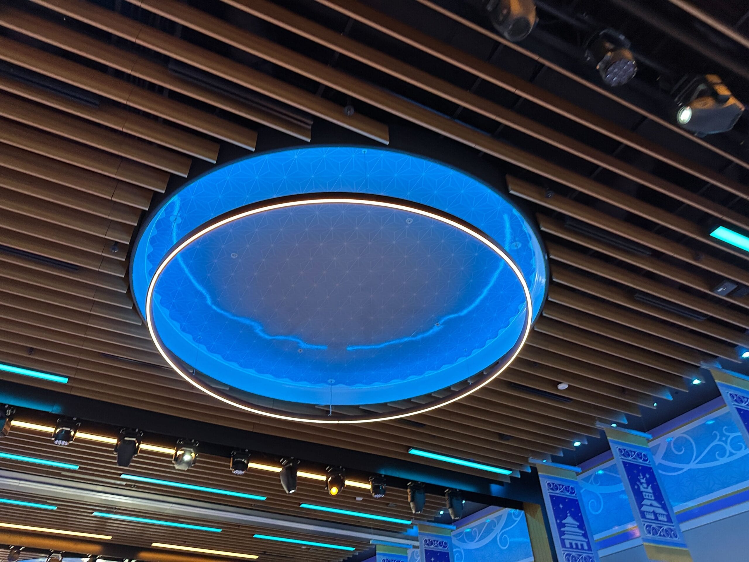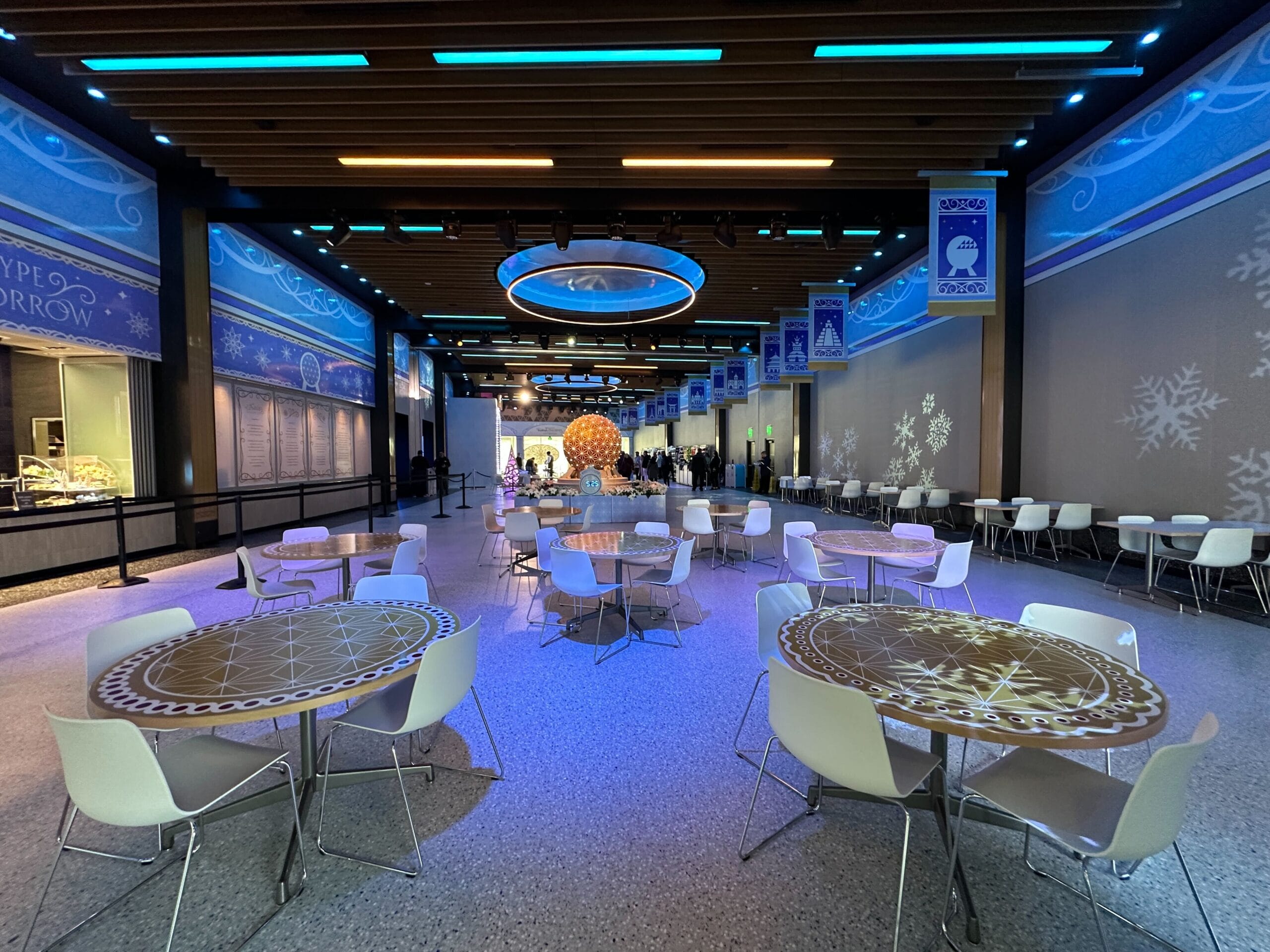 The circular lights in the ceiling are illuminated blue and have a Spaceship Earth-inspired pattern.