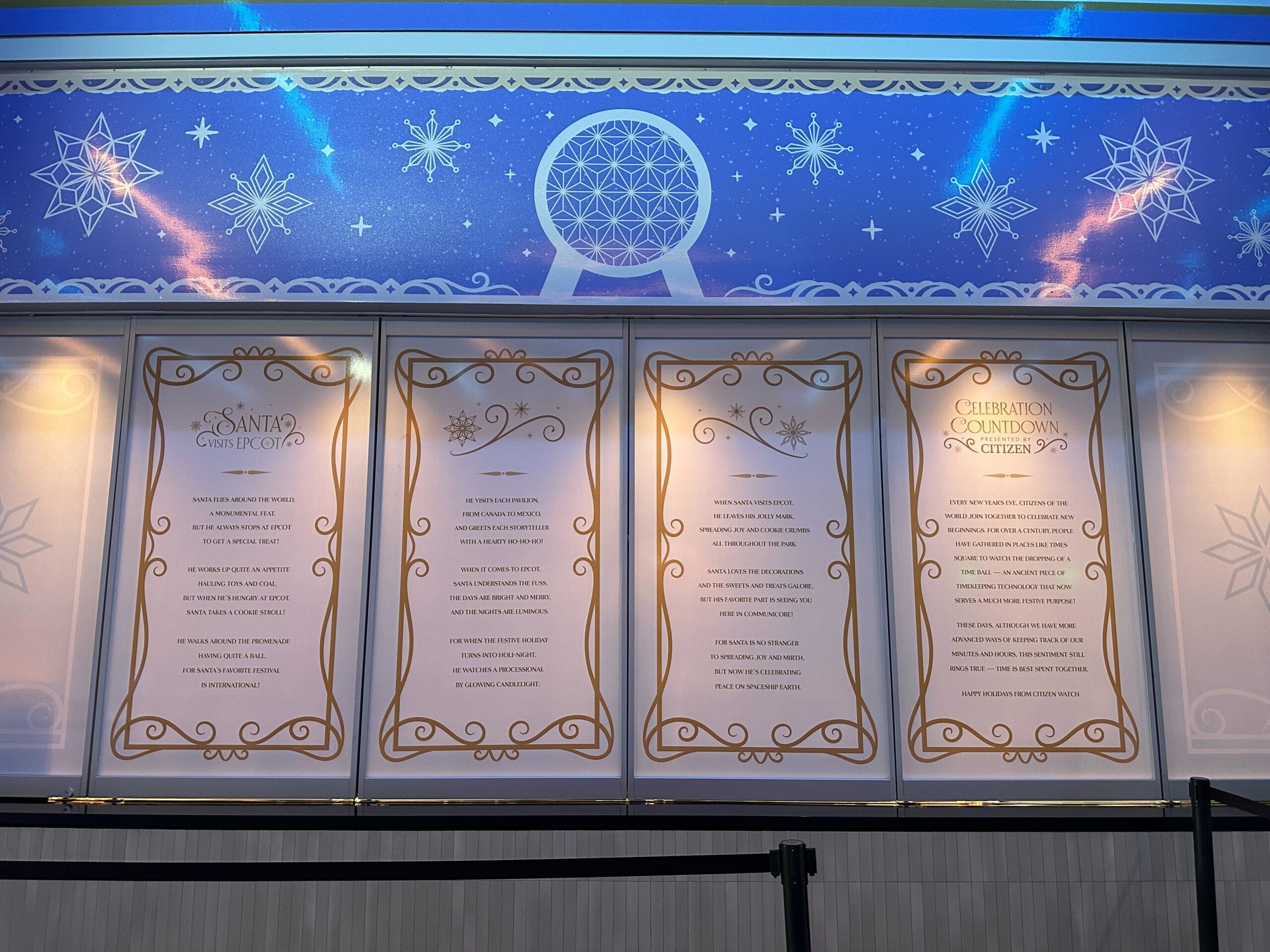 There are rhymes on the walls about Santa and the Celebration Countdown, a light show with the gingerbread display. Trim decals feature Spaceship Earth and snowflakes.
