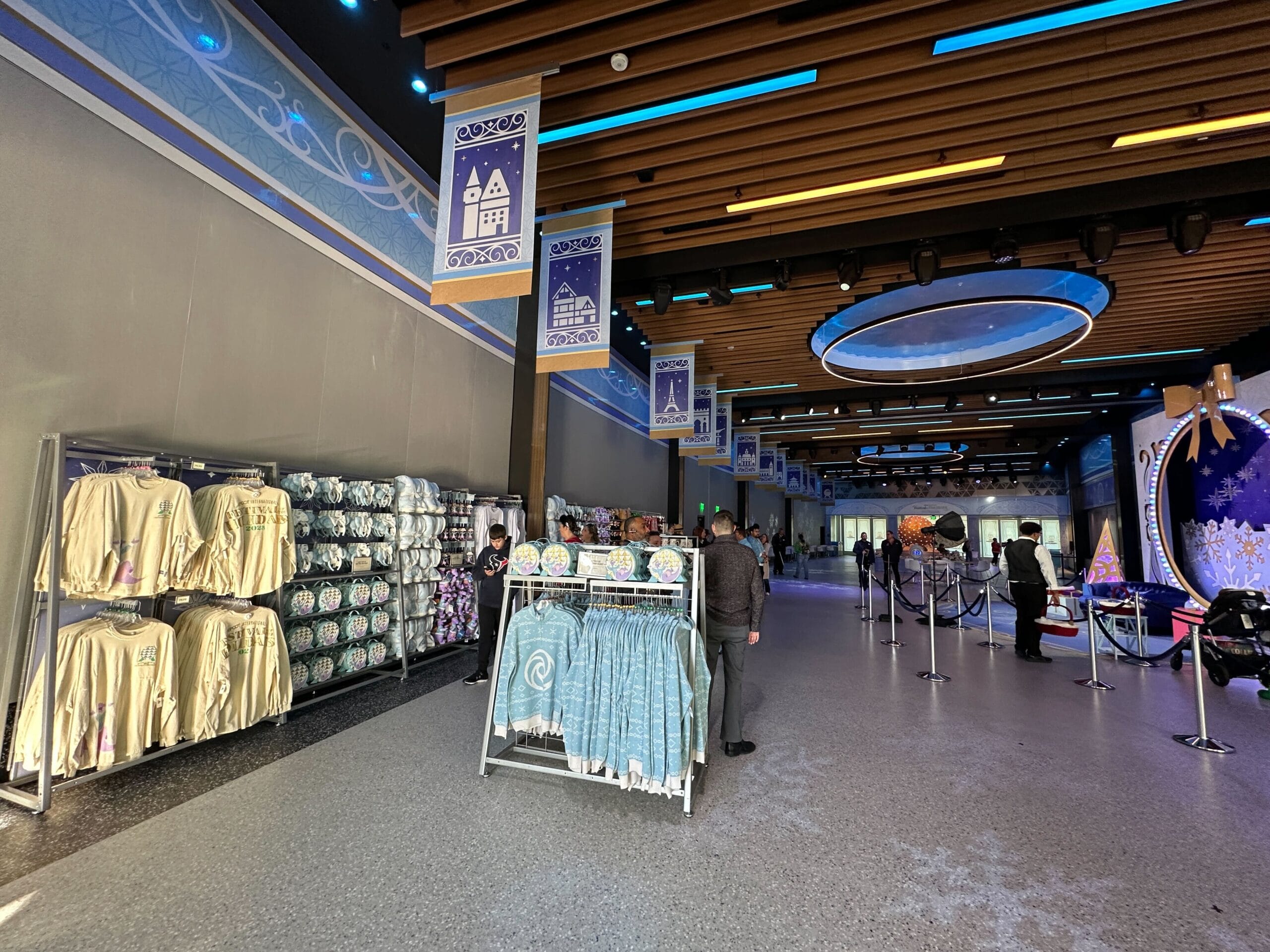 There is some merchandise available for purchase, including festival-exclusive items. Banners hanging from the ceiling feature various World Showcase buildings.