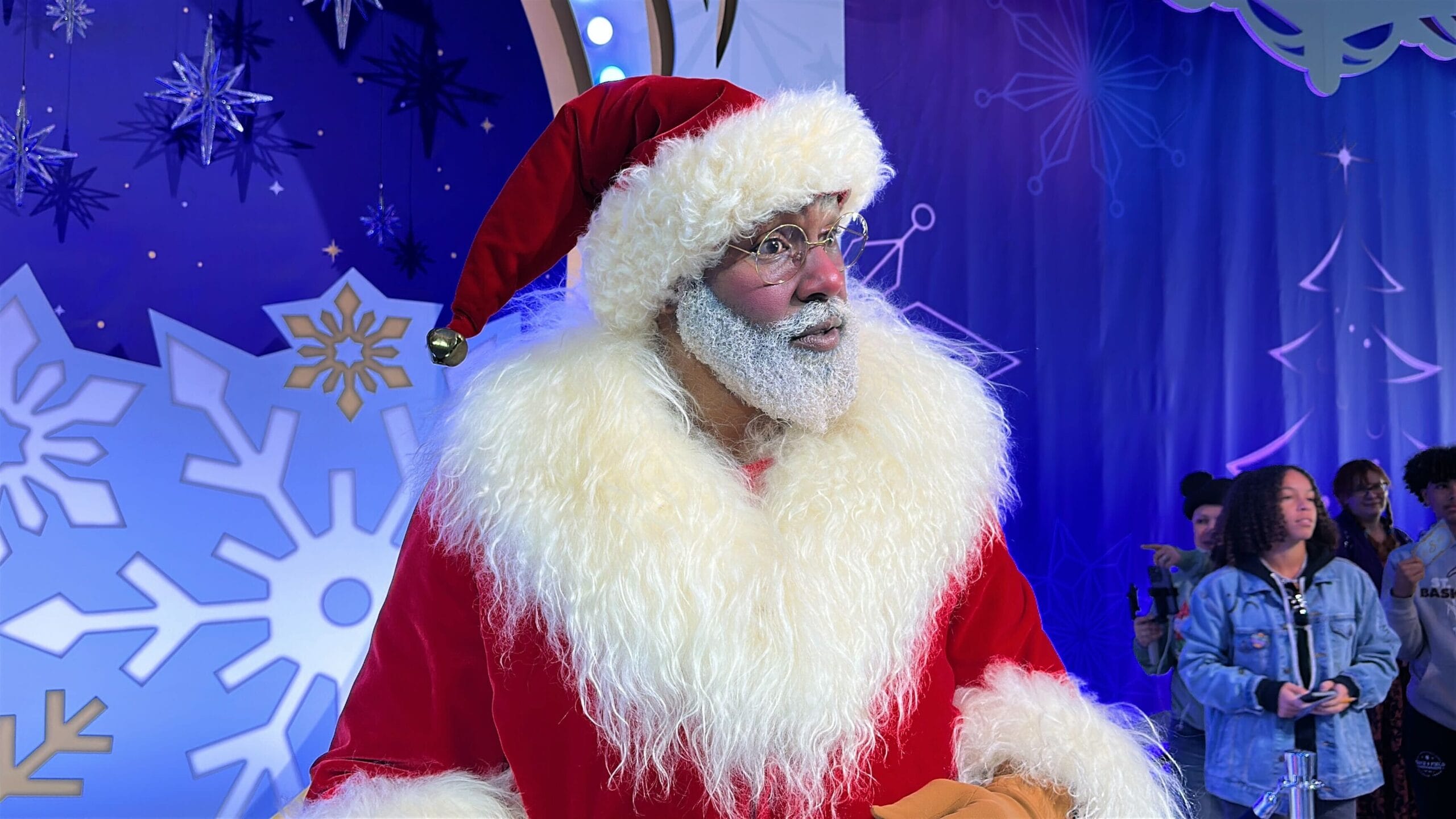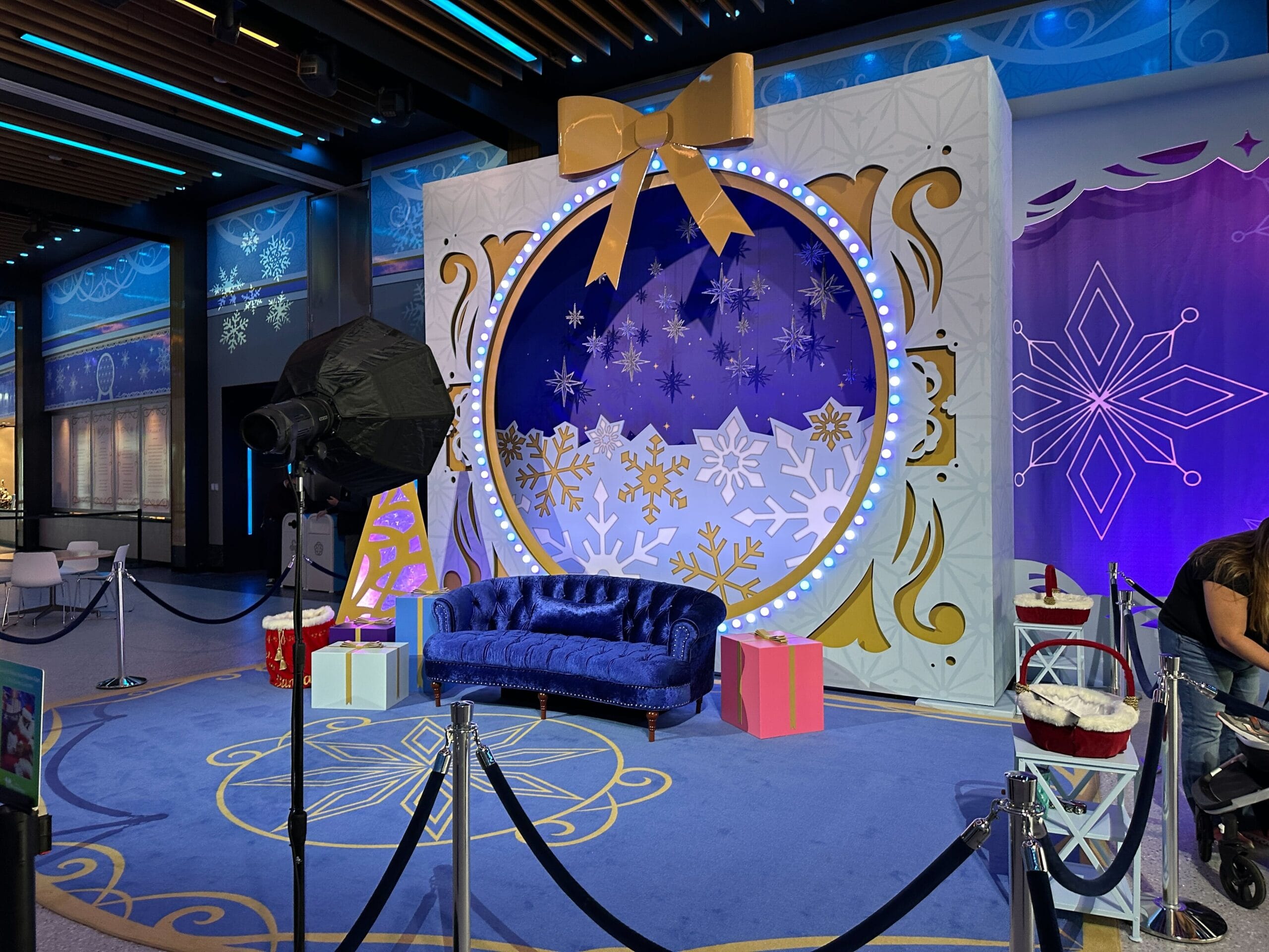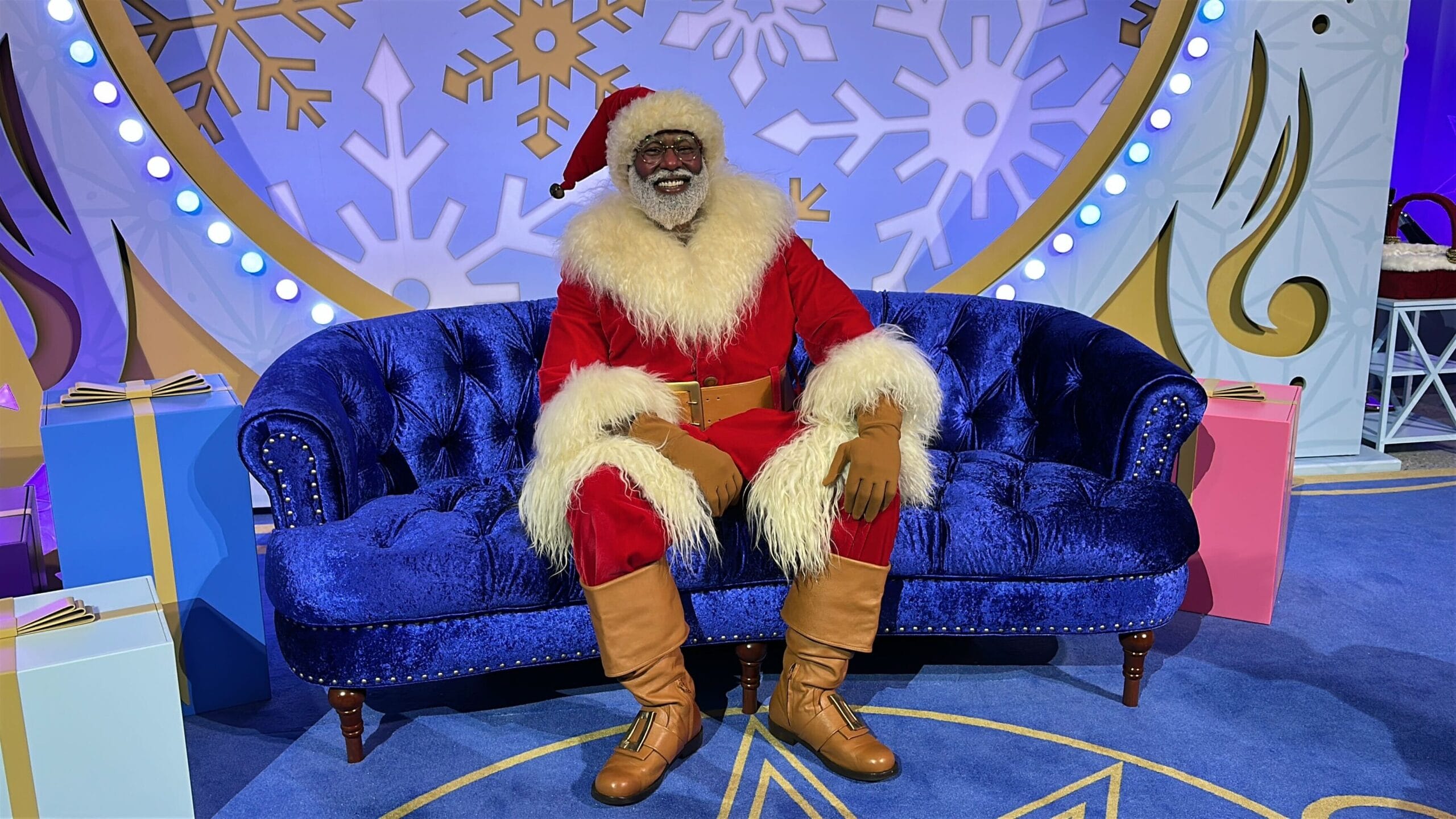 Santa Claus meets next to the merchandise space, on the opposite side of the hall from Experimental Prototype Cookies of Tomorrow. The backdrop resembles a snow globe. There’s a blue velvet couch for Santa, along with some gift boxes.