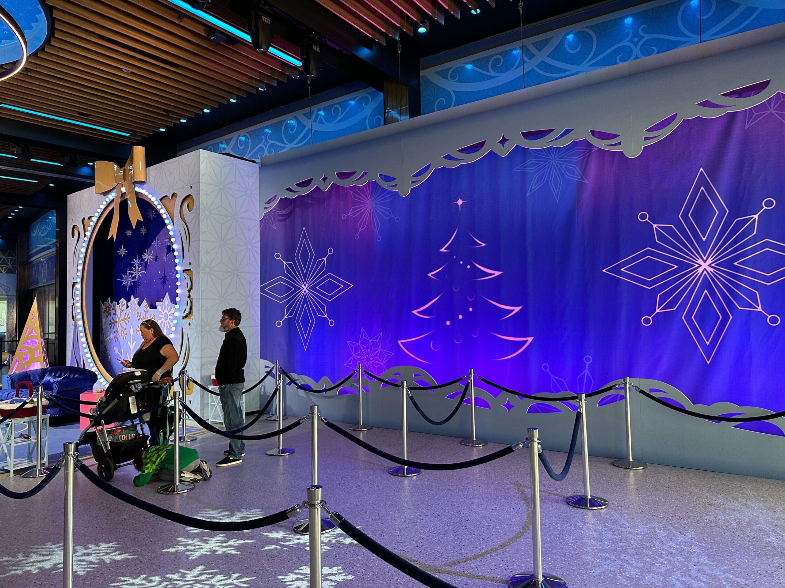 A queue is set up with stanchions. The wall is decorated with Christmas trees and snowflakes.