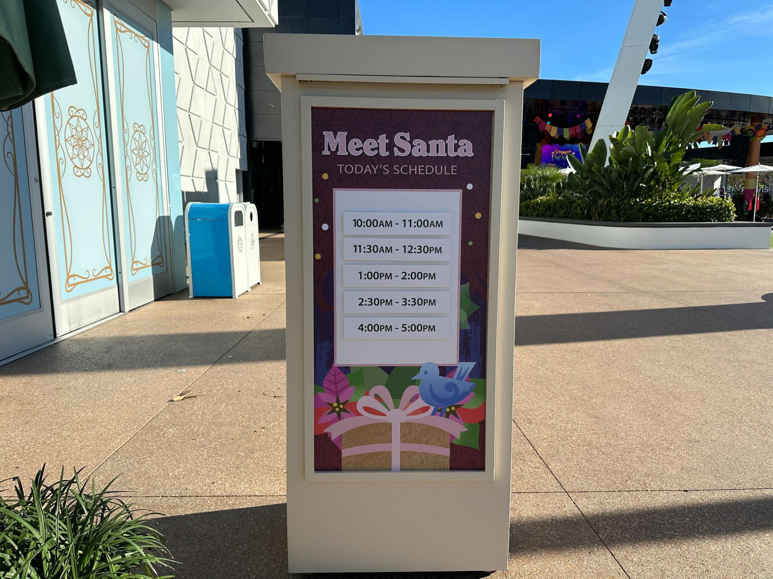 Times are posted outside. Santa is scheduled to meet daily through Christmas Eve (December 24, 2025) at these times:
