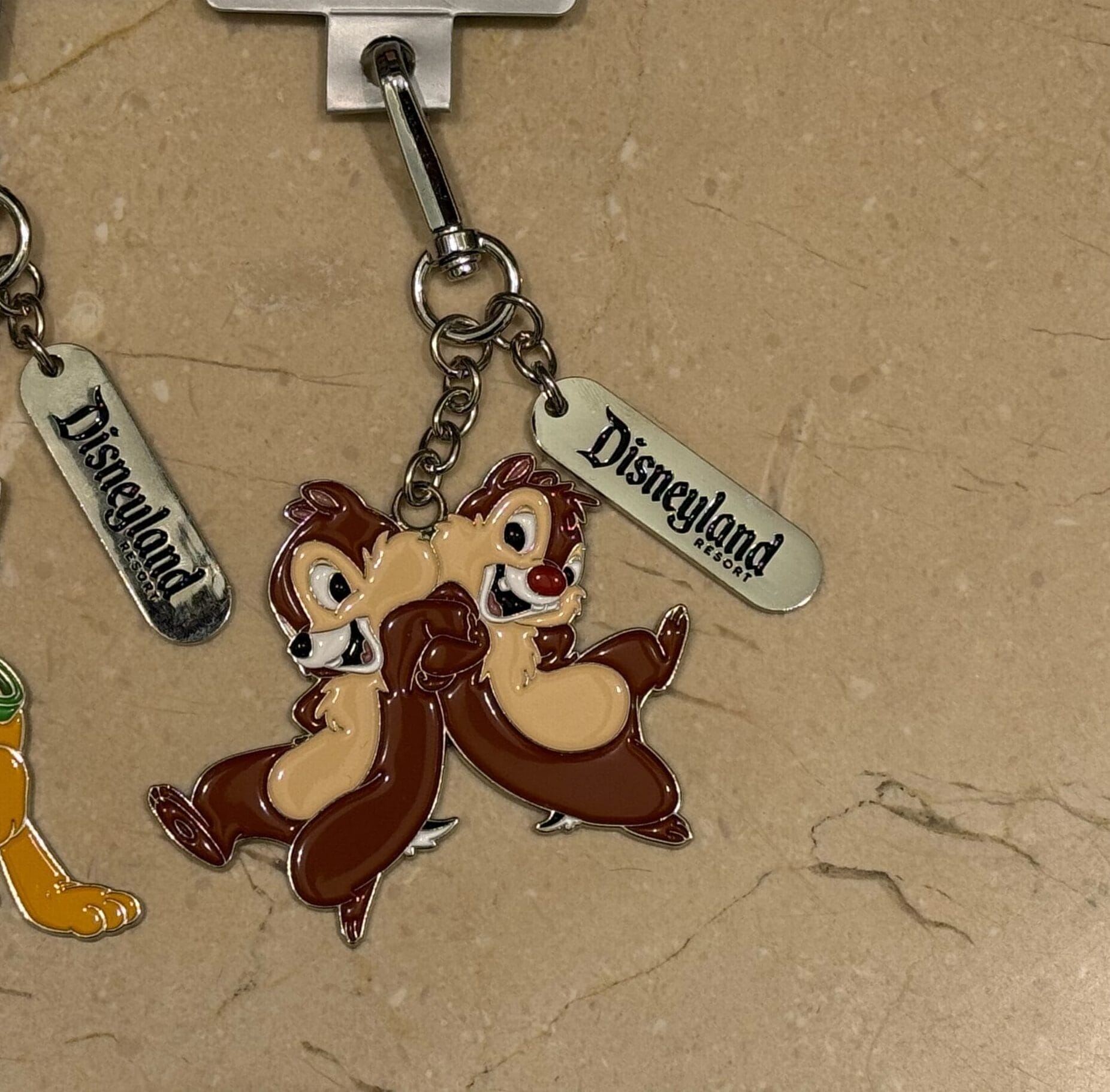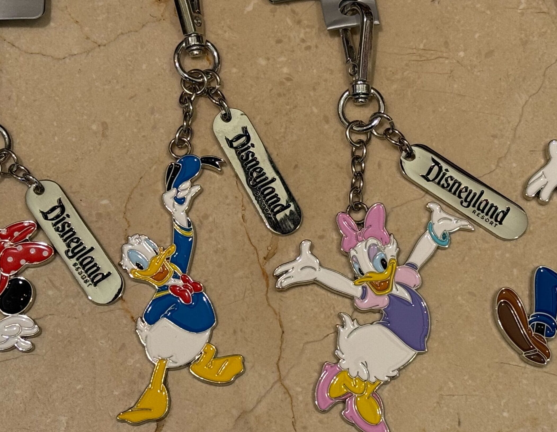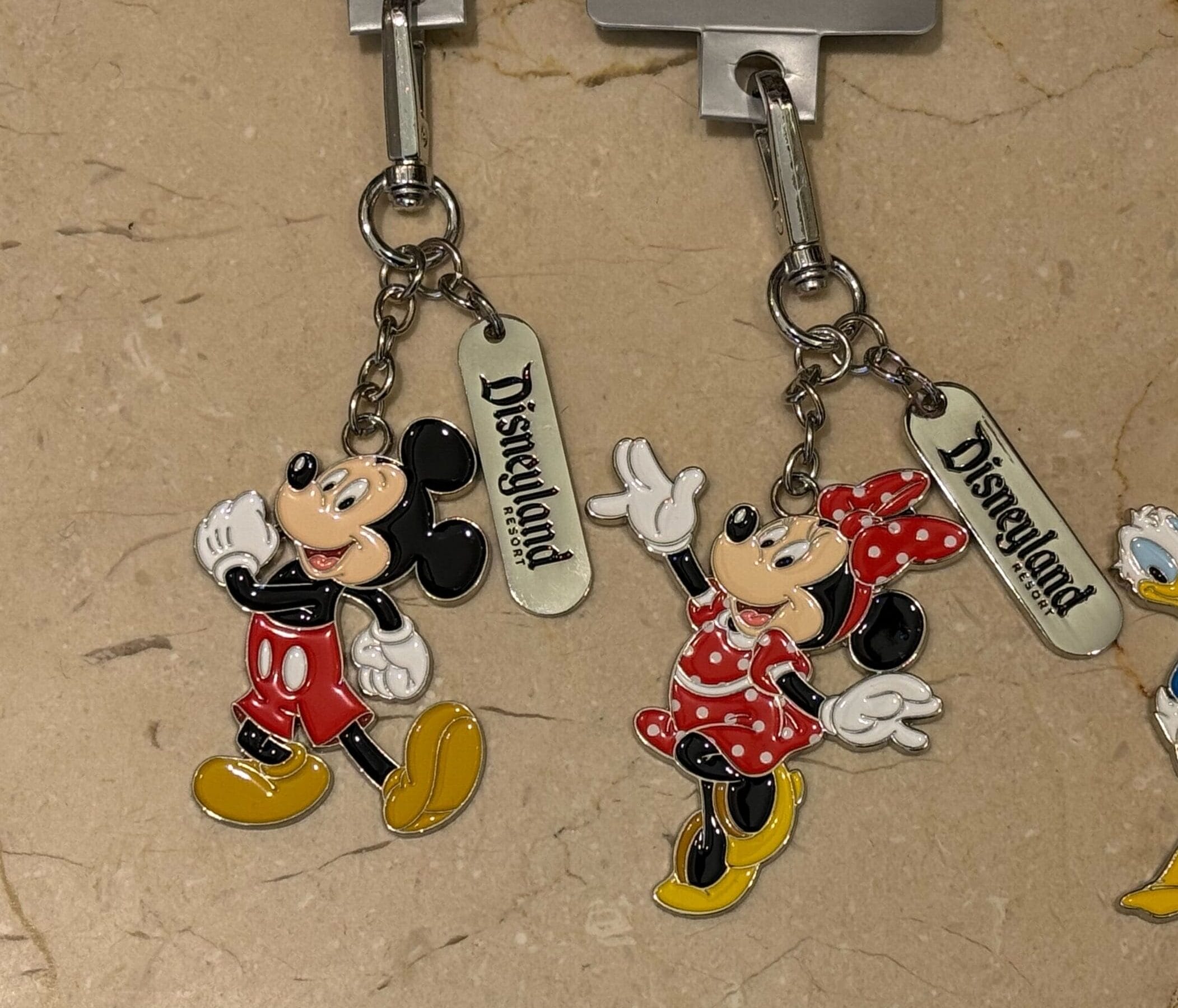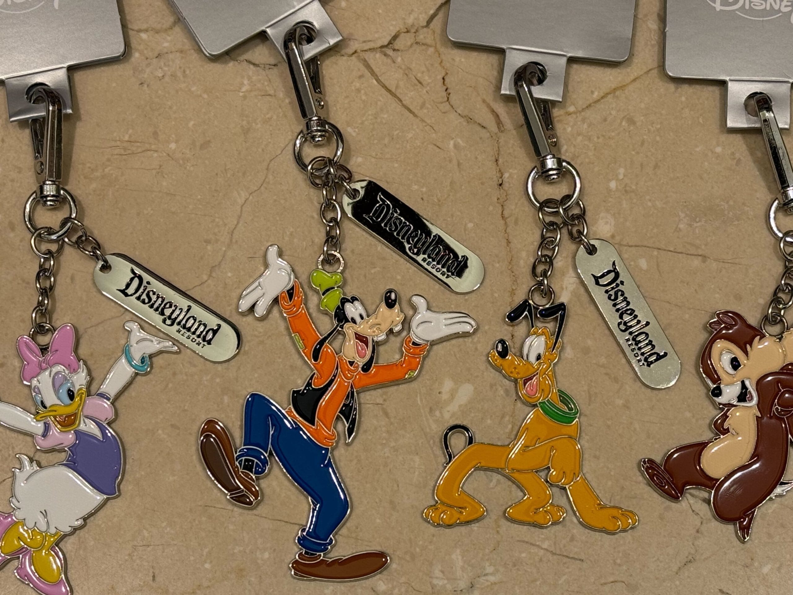 There are seven enamel charms to choose from, each with a Disneyland Resort tag alongside the character(s) who are all smiling. Each also has a lobster-claw clip to attach it to your bag securely.