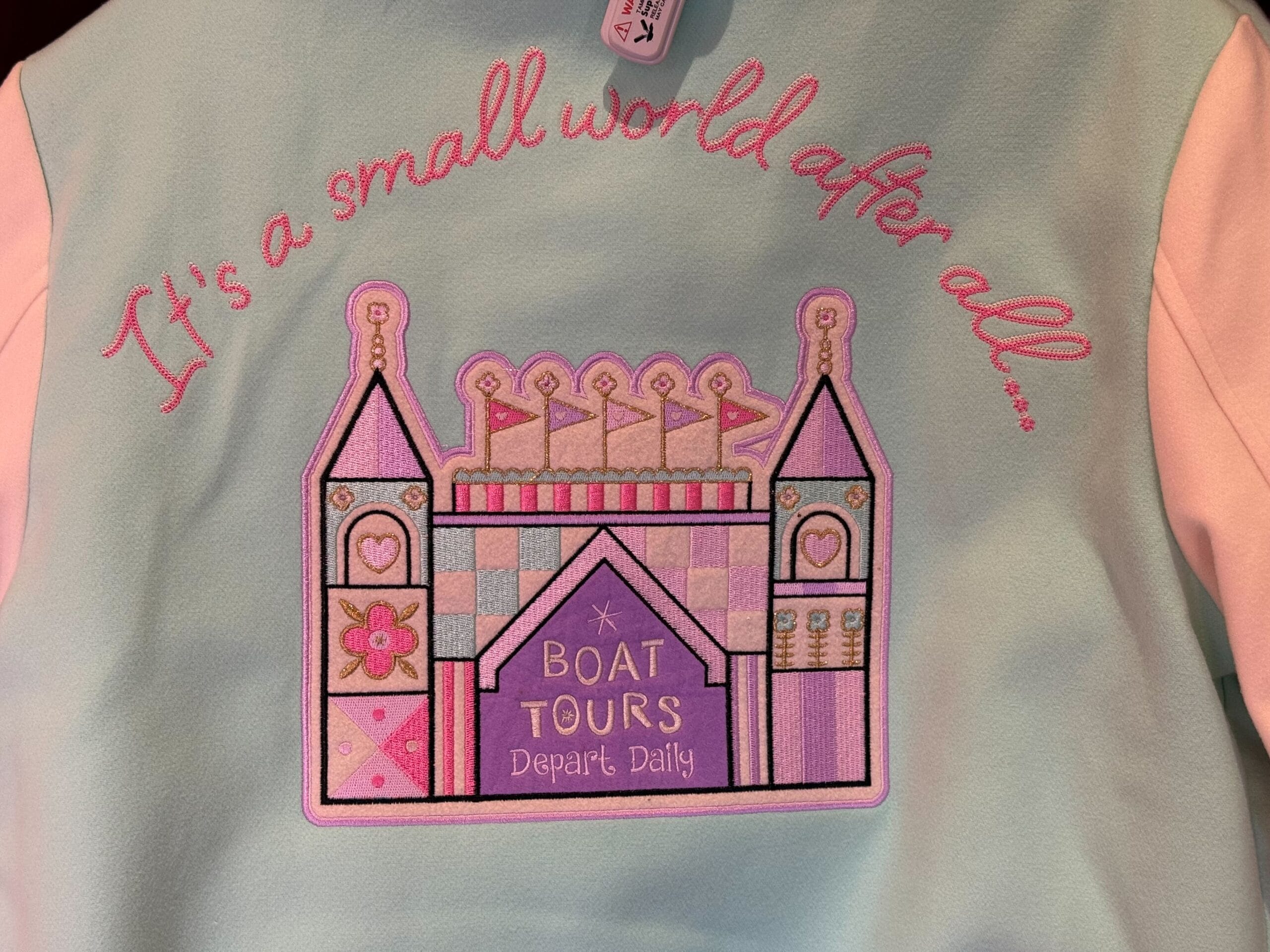 A patch with the ride and “boat tours depart daily” text is on the back. Stitched in pink embroidery above is the text “It’s a small world after all…”