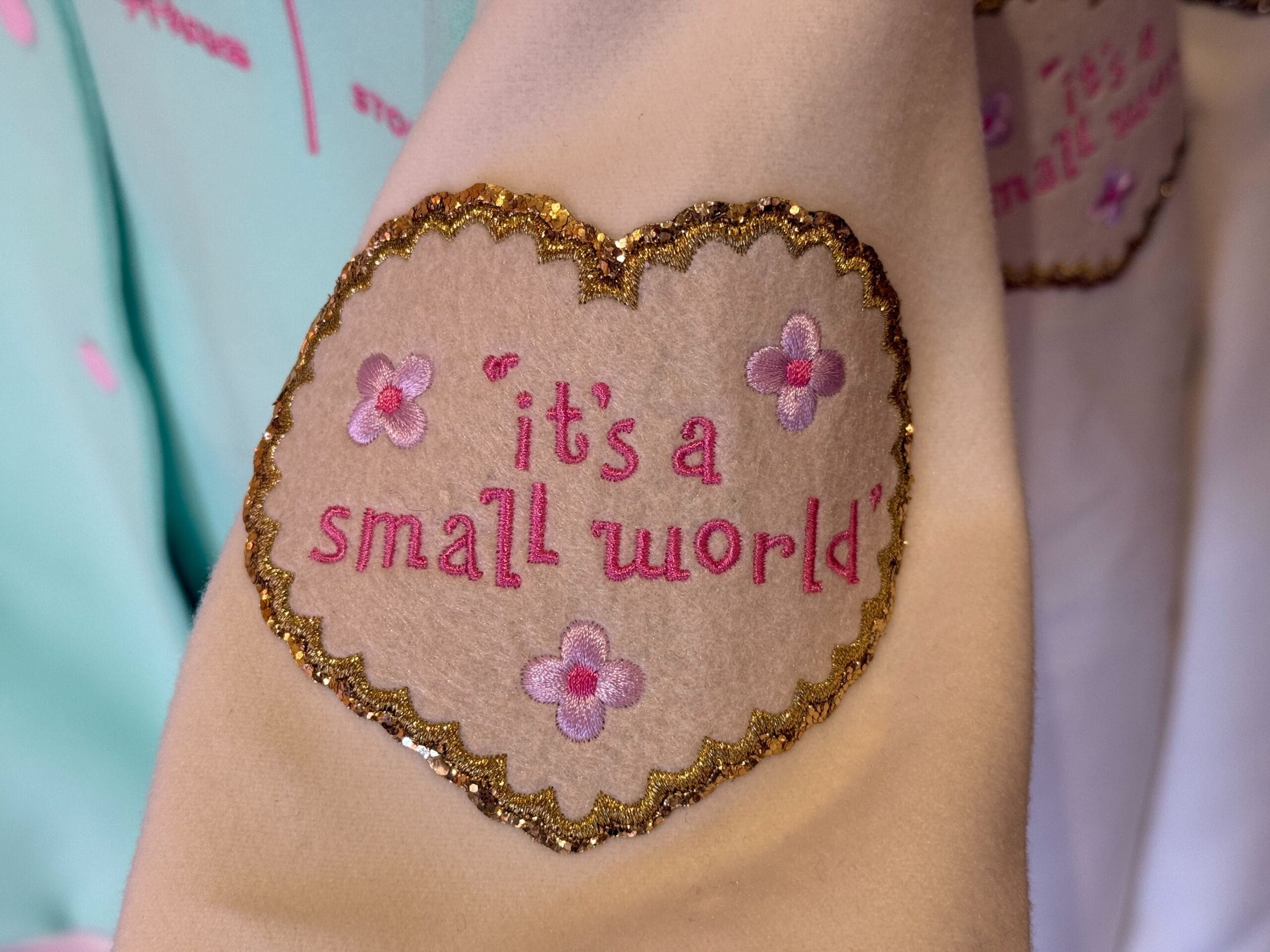 On the right sleeve is an embroidered white heart with “it’s a small world” written inside with a darker shade of pink while 3 flowers surround the text.