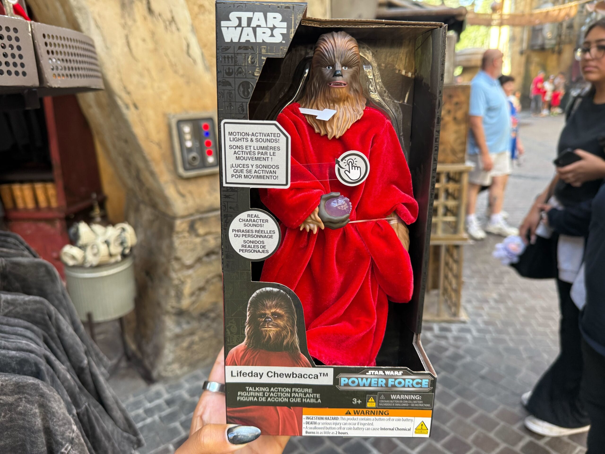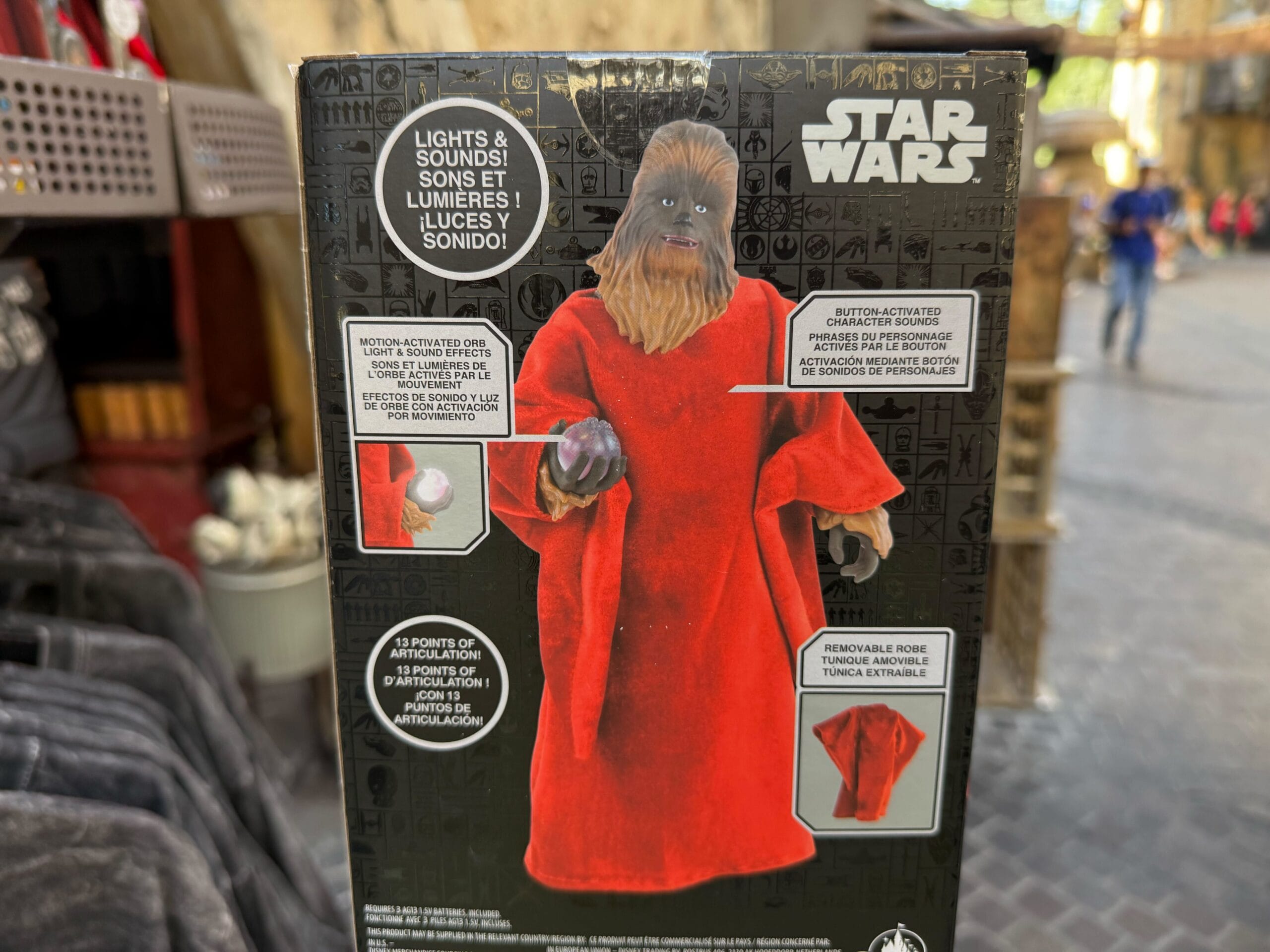 Chewbacca is dressed in his red robe and holding a Life Day Orb. He has articulated limbs and the robe is removable. It features button-activated character sounds and motion-activated orb light and sound effects.