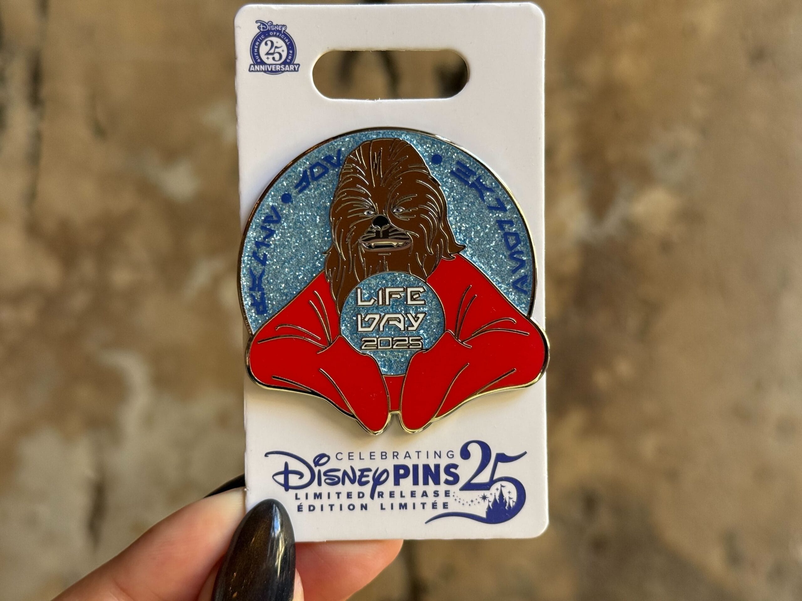Chewbacca is pictured in his red robe on this pin. He’s holding a Life Day Orb with a sparkly light blue finish and white “Life Day 2025” text. The background is also sparkly with dark blue Aurebesh lettering that translates to “Family, Joy, Harmony” — the core tenets of Wookiee culture and the Life Day celebration.