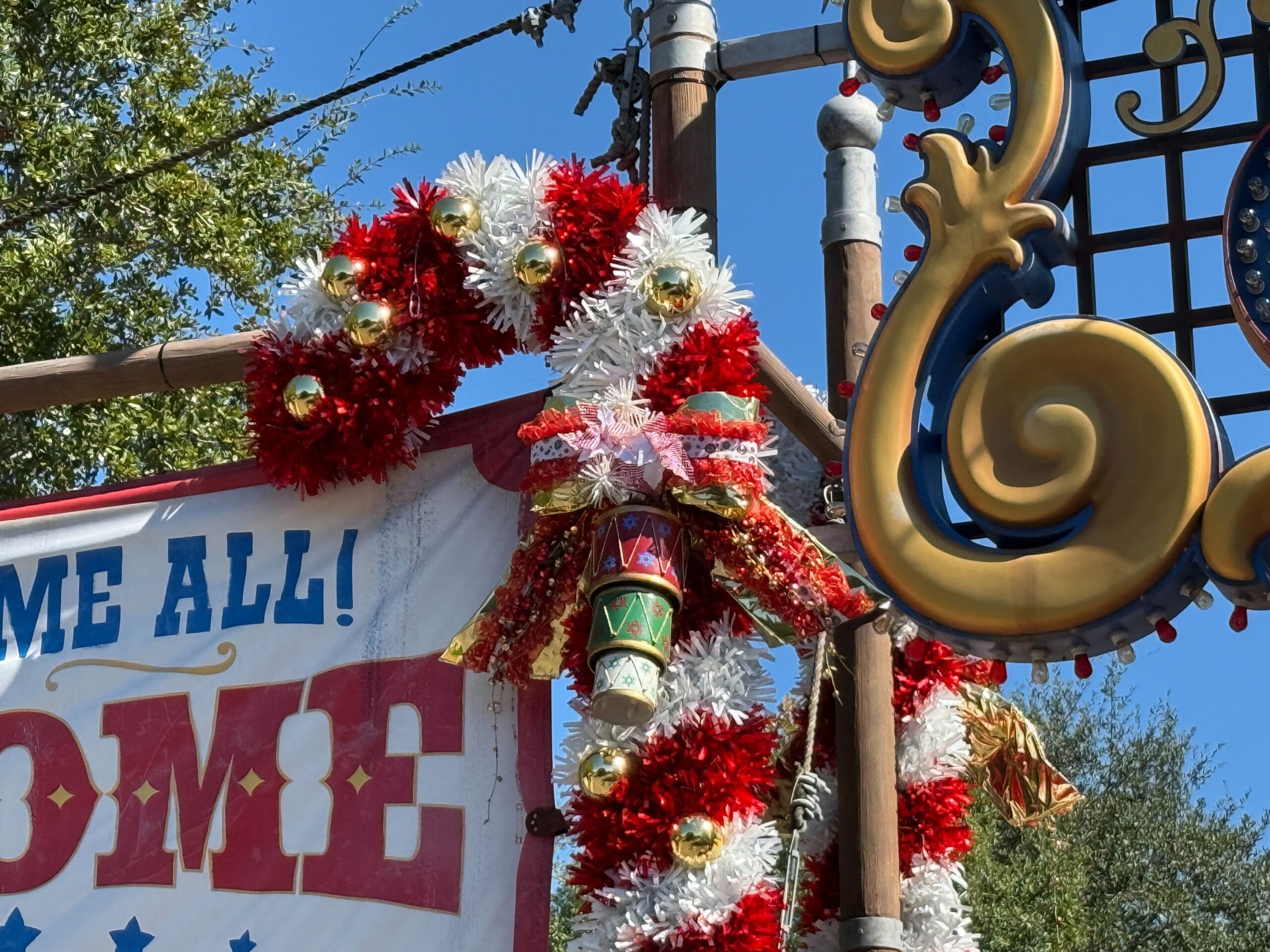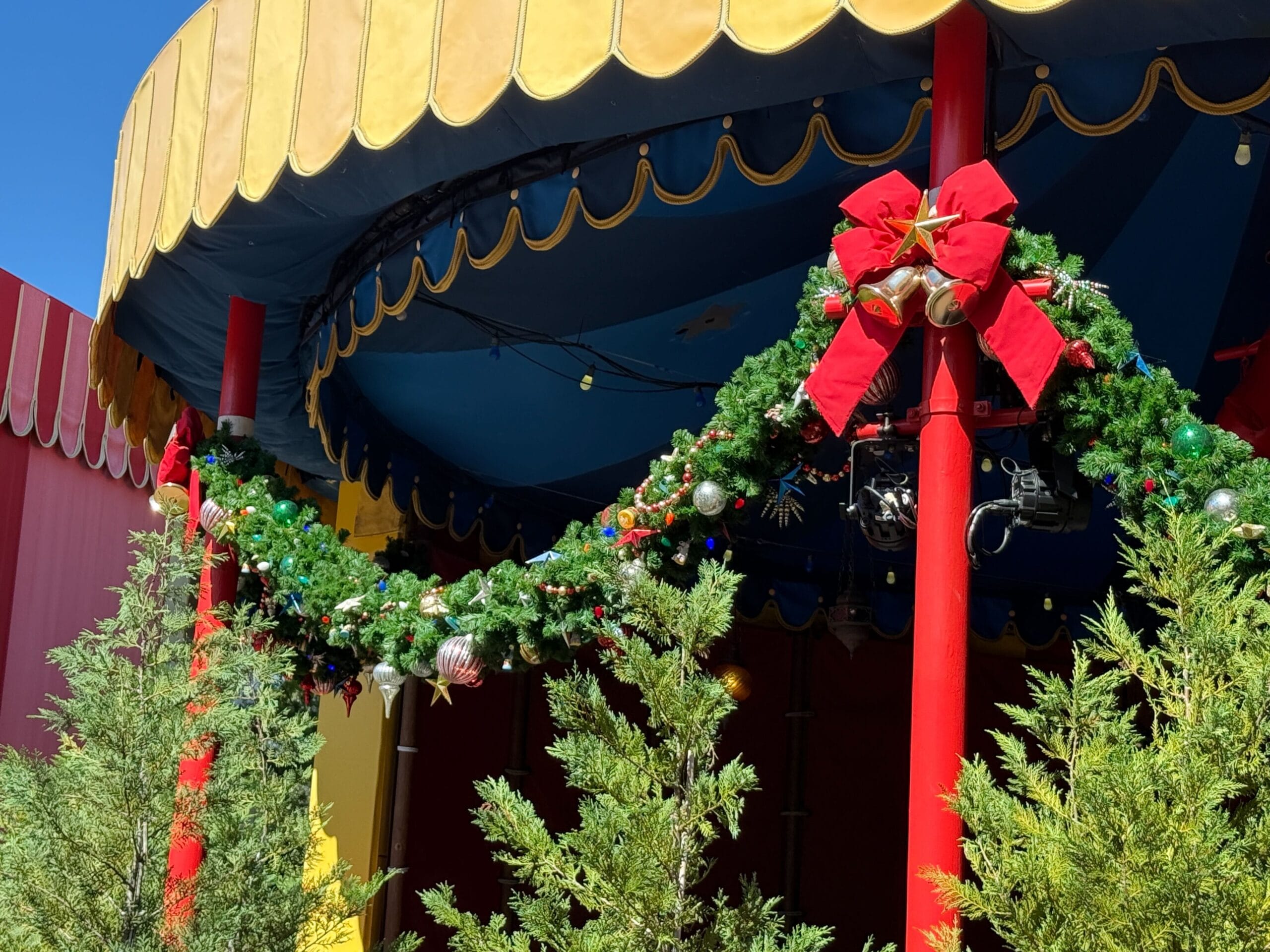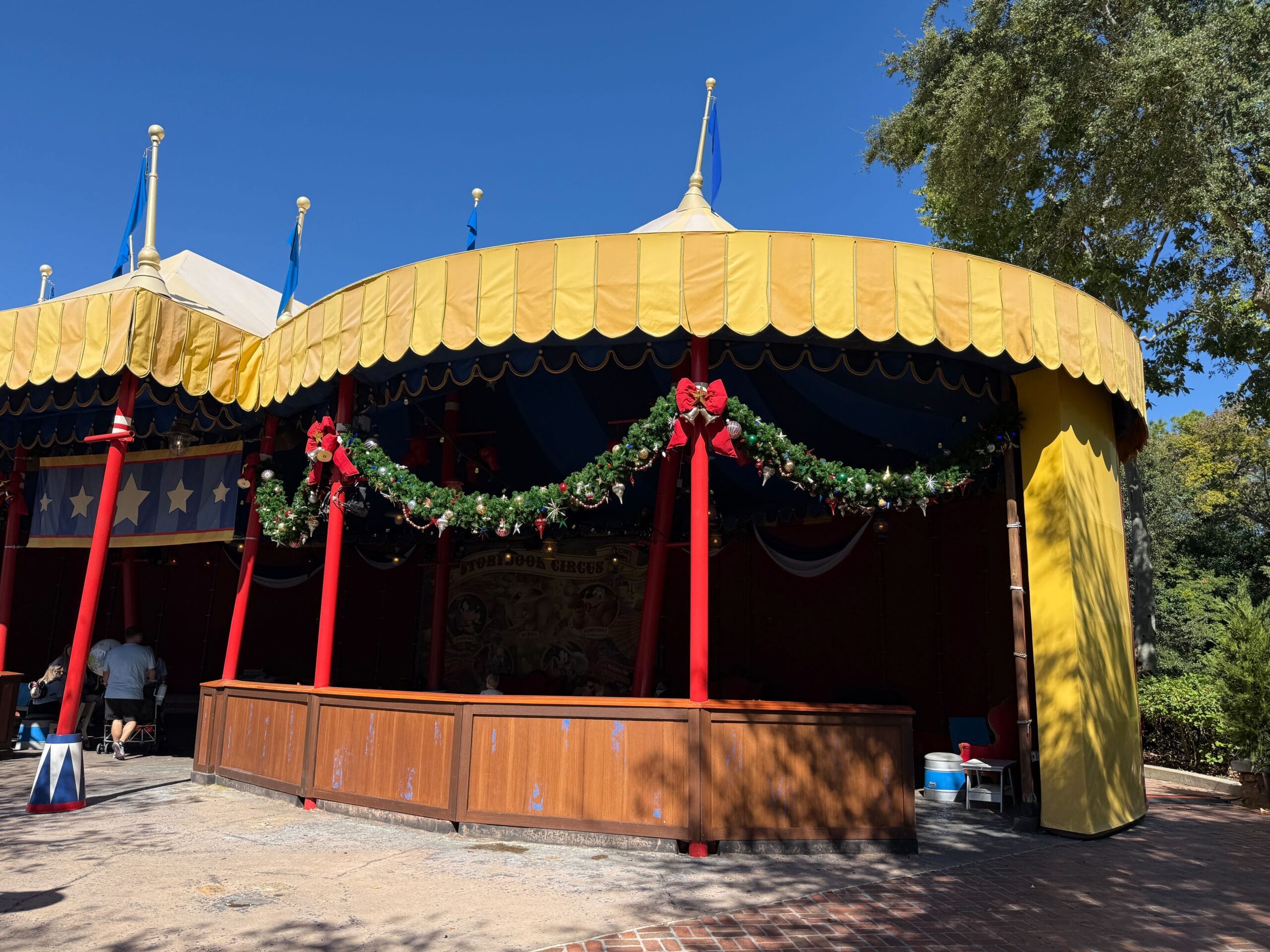 The circus tent in the back of the land, between the train station and Pete’s Silly Sideshow, has garland hanging between its supports. This tent will host Santa’s Christmas Carnival during Mickey’s Very Merry Christmas Party.