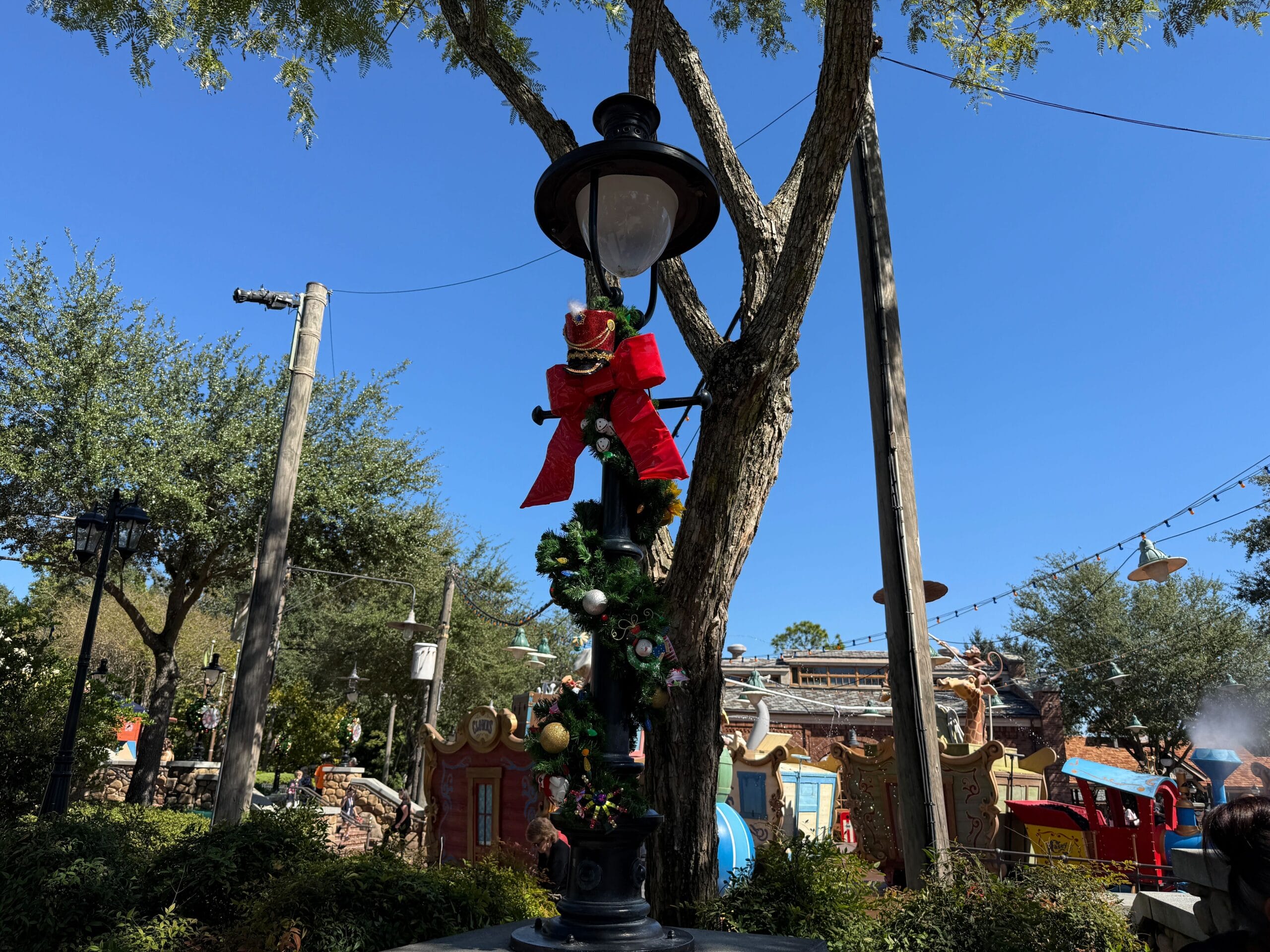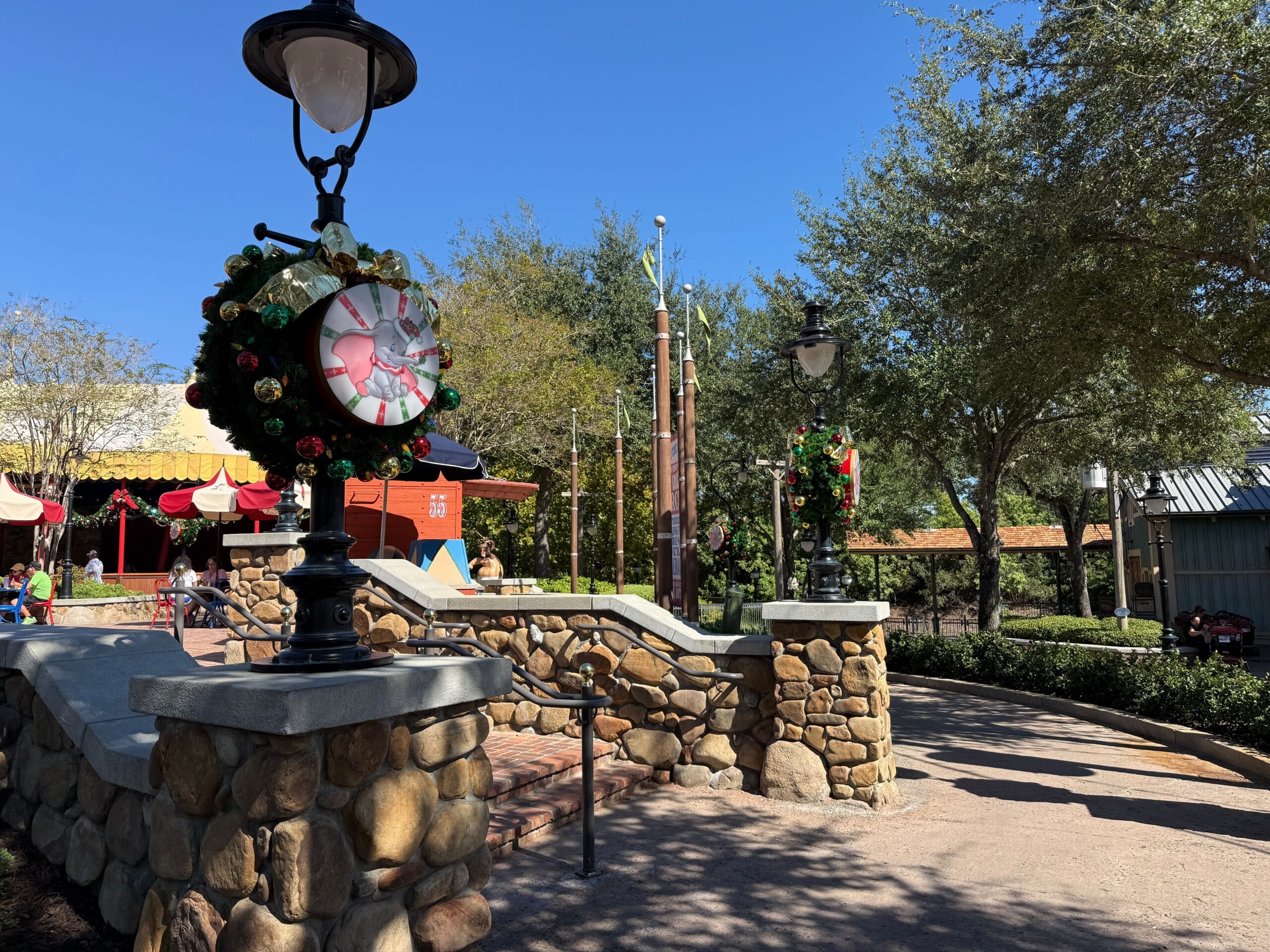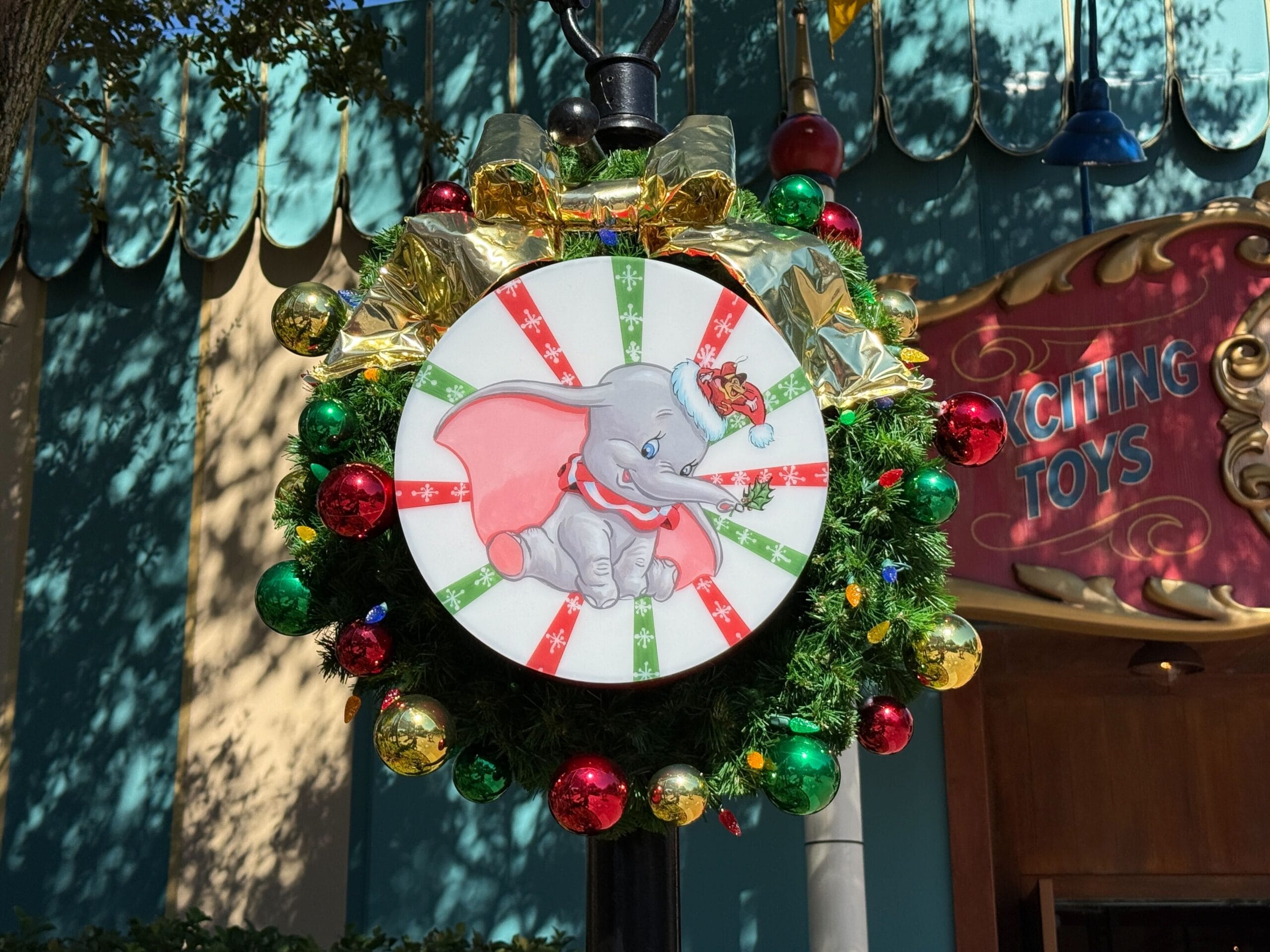 Inside Storybook Circus, several lampposts are decorated with new wreaths and medallions. The wreaths feature shiny gold bows, colorful baubles, and string lights. The medallions in their center feature Dumbo wearing a Santa hat and holding holly. Timothy Q. Mouse is tucked in his hat.