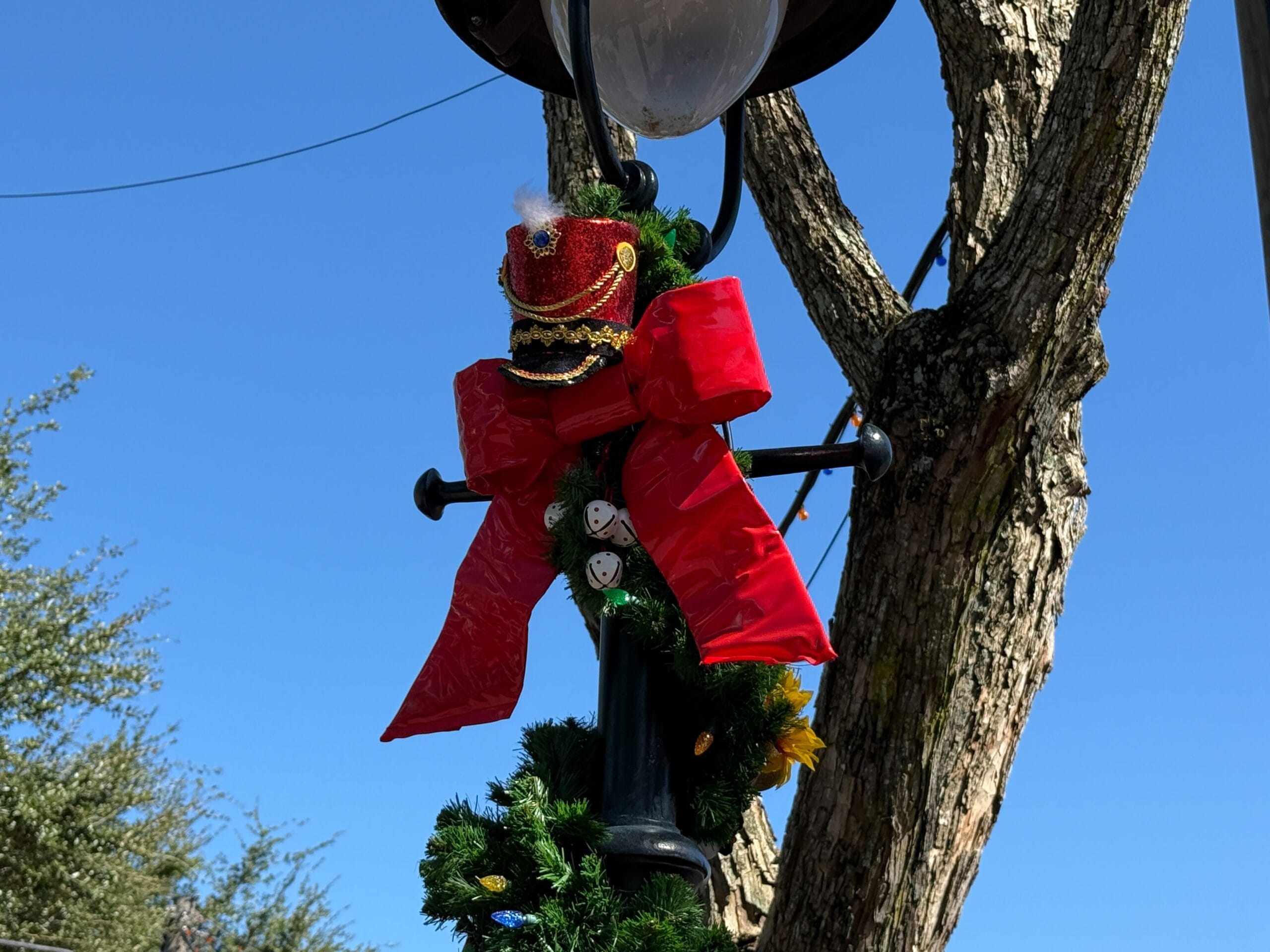 Some lampposts are wrapped with garlands. These feature various ornaments and red bows.