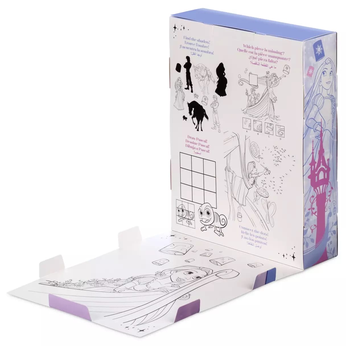 The back of the box unfolds to reveal coloring and activities. It is recommended for ages 3+.