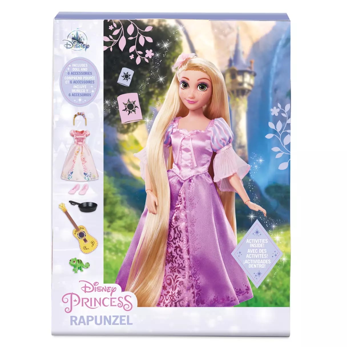 The doll is fully poseable. Her accessories are a Pascal figure, shoes, floral headband, frying pan, and guitar. The front of the box unfolds to reveal a tower play area.