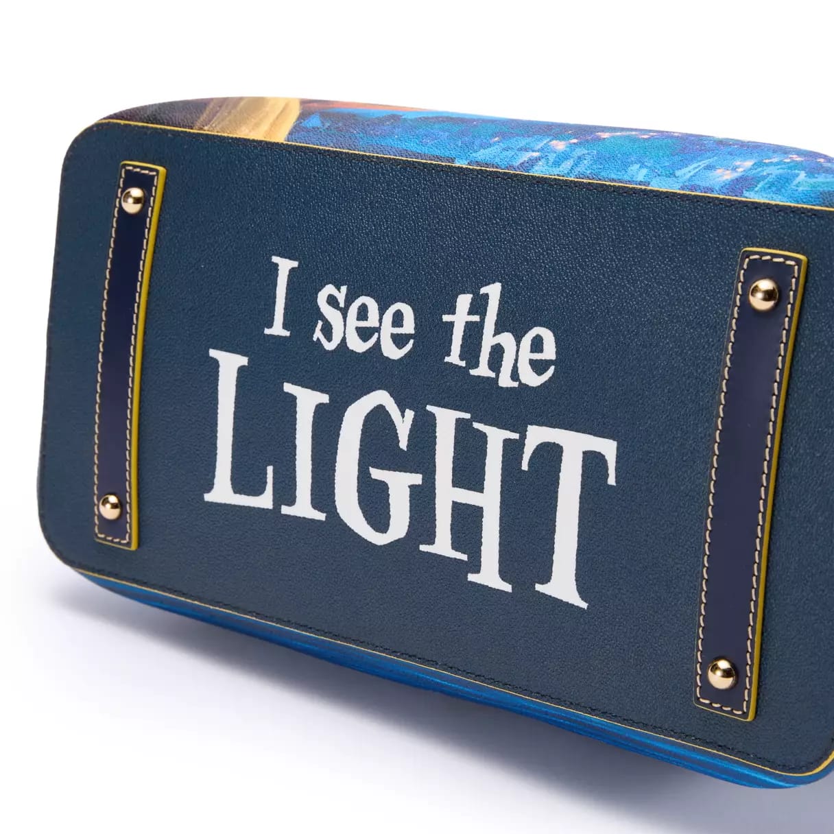The same screen art of Rapunzel is on this small bag, which is also coated cotton with leather trims. It has an adjustable shoulder strap. An embossed metal label is on the front.