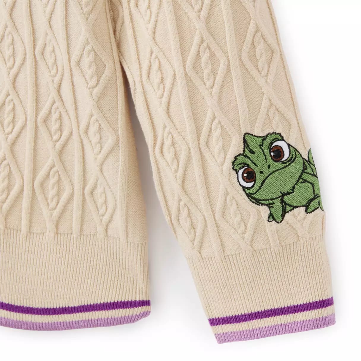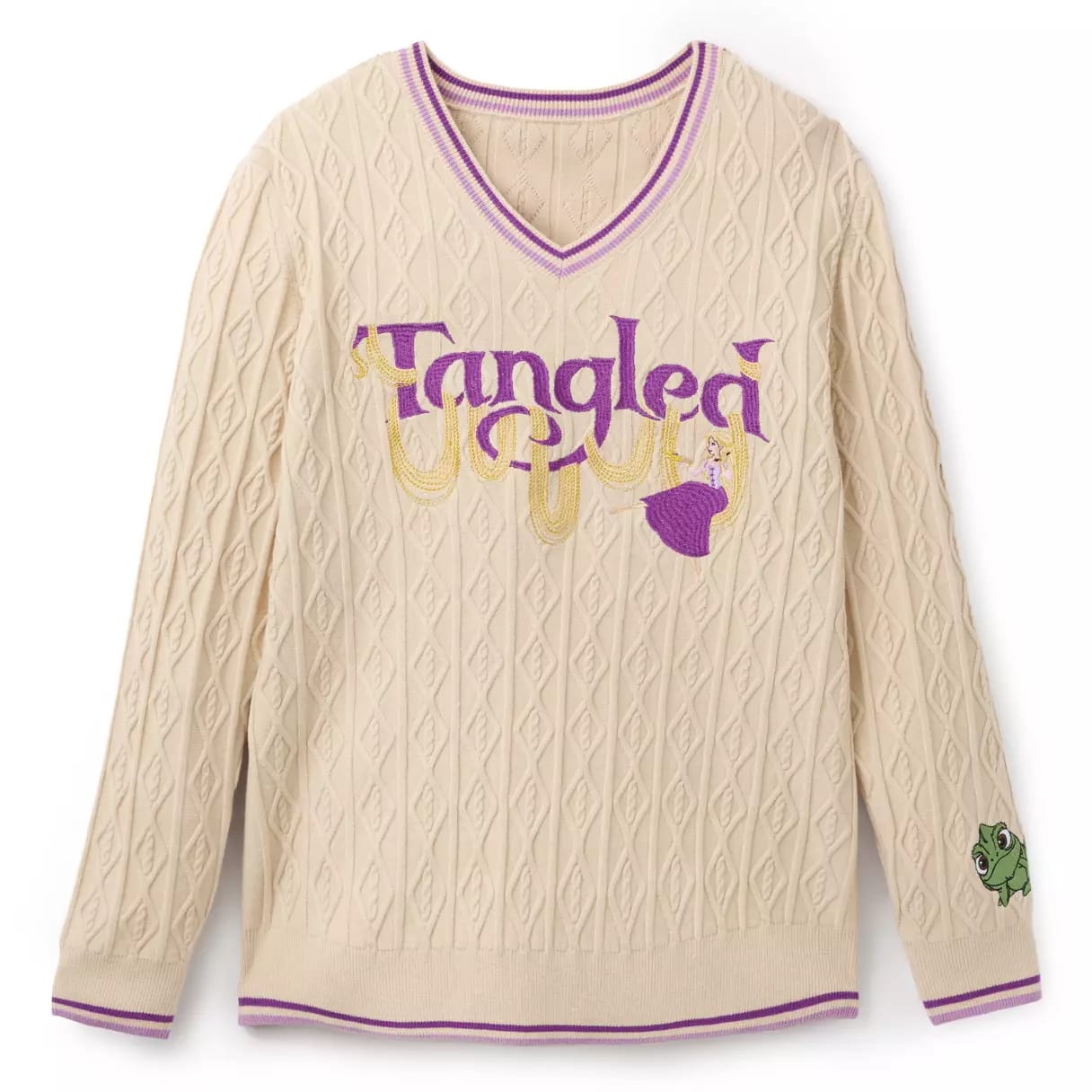 This is a cream-colored pullover sweater with purple stripes on the ribbed cuffs, v-neck collar, and hem. “Tangled” and embroidered Rapunzel appliqués are on the chest, with Rapunzel’s hair weaving through the purple letters. A Pascal appliqué is on the left sleeve. It’s 50% recycled polyester, 28% polyester, and 22% viscose, exclusive of decoration.