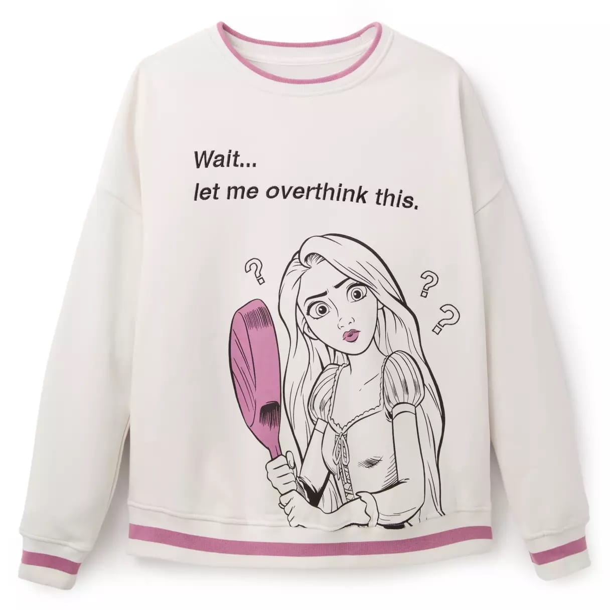 Screen art of Rapunzel is on the chest of this sweatshirt. She’s black and white, except for her pink lips and the pink frying pan she’s holding. Question marks are around her and embroidered above is “Wait… let me overthink this.” The top is white with ribbed crew neck, cuffs, and hem all featuring a pink stripe. It’s 60% cotton and 40% polyester fleece.