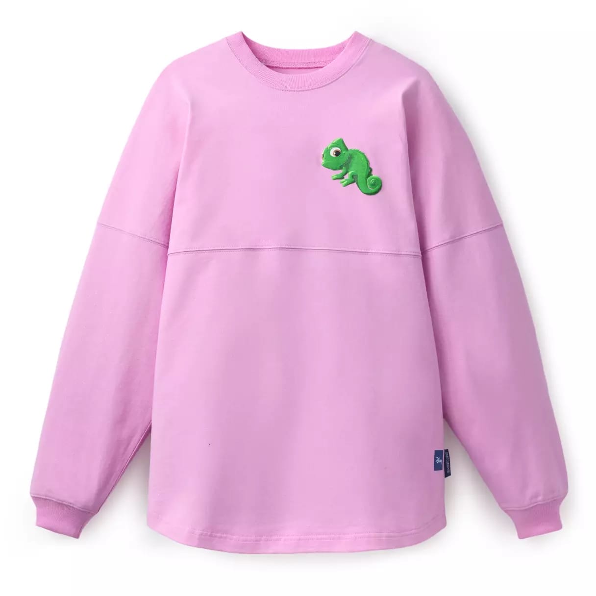 The Spirit Jersey is a purple-pink color. A puffy ink Pascal is on the chest. Puffy metallic “Rapunzel” lettering is on the back with a sequined Corona sun symbol. On the back midsection is screen art of Rapunzel in front of her tower. Like most Spirit Jerseys, it’s 100% cotton.