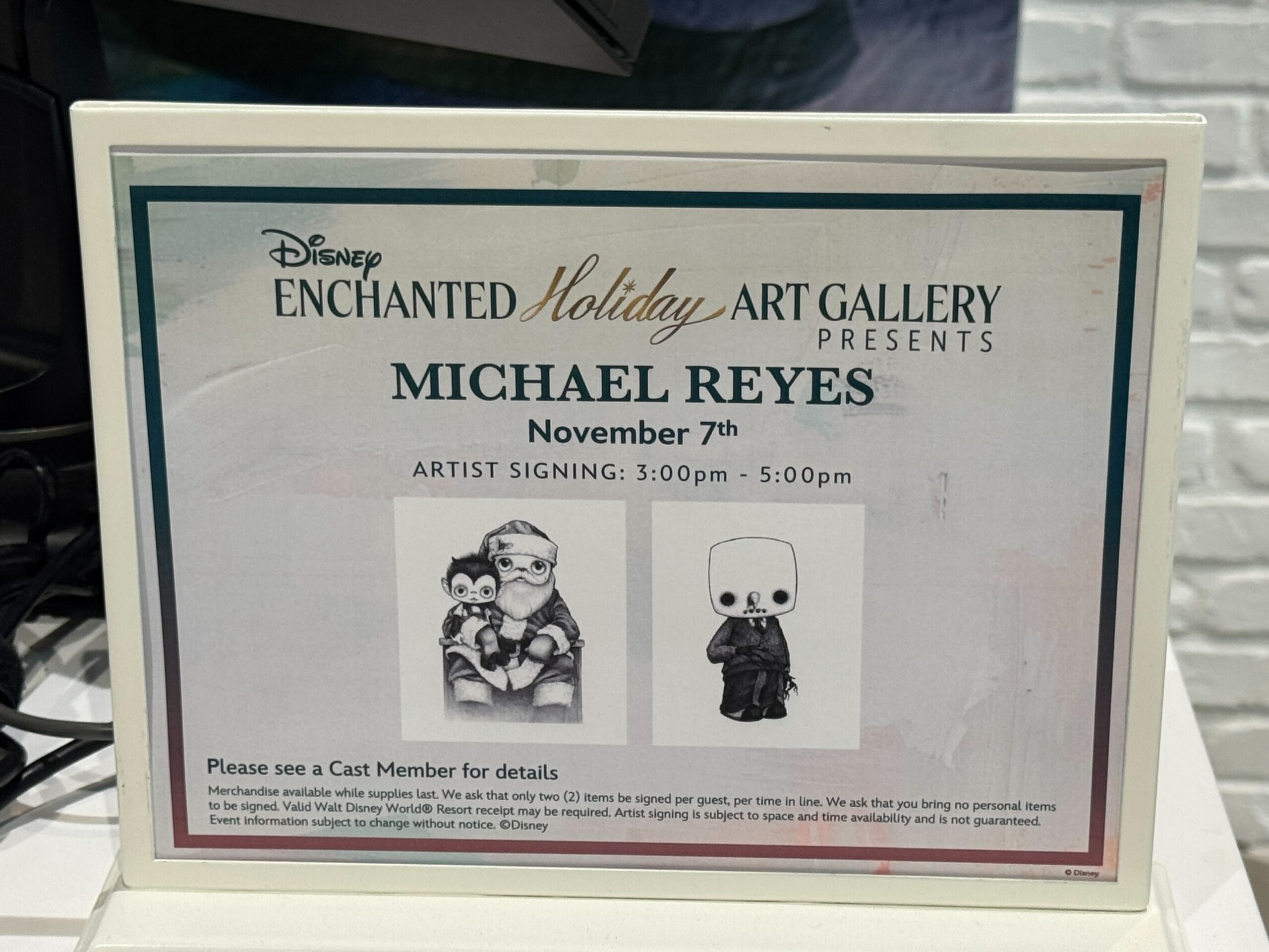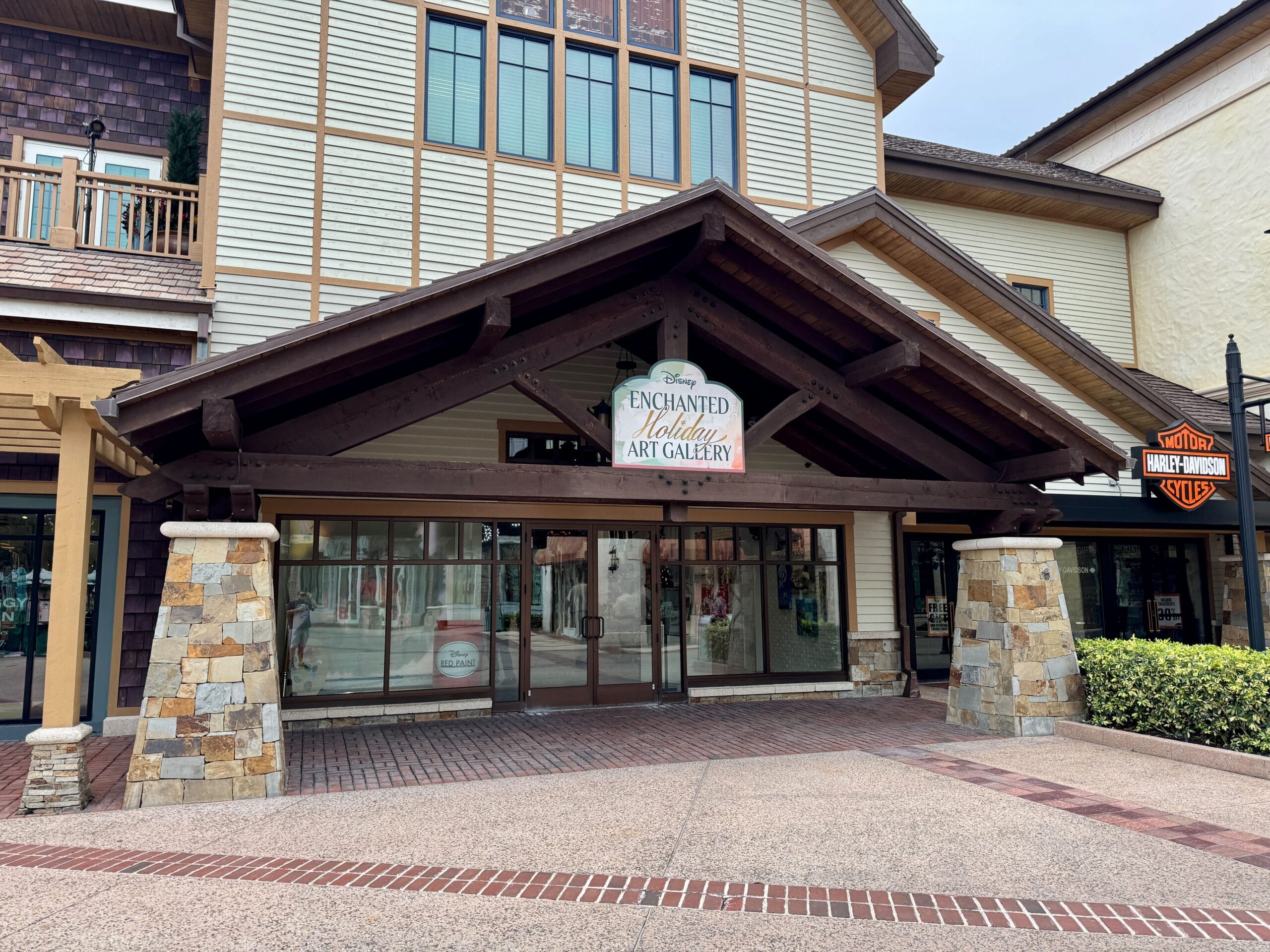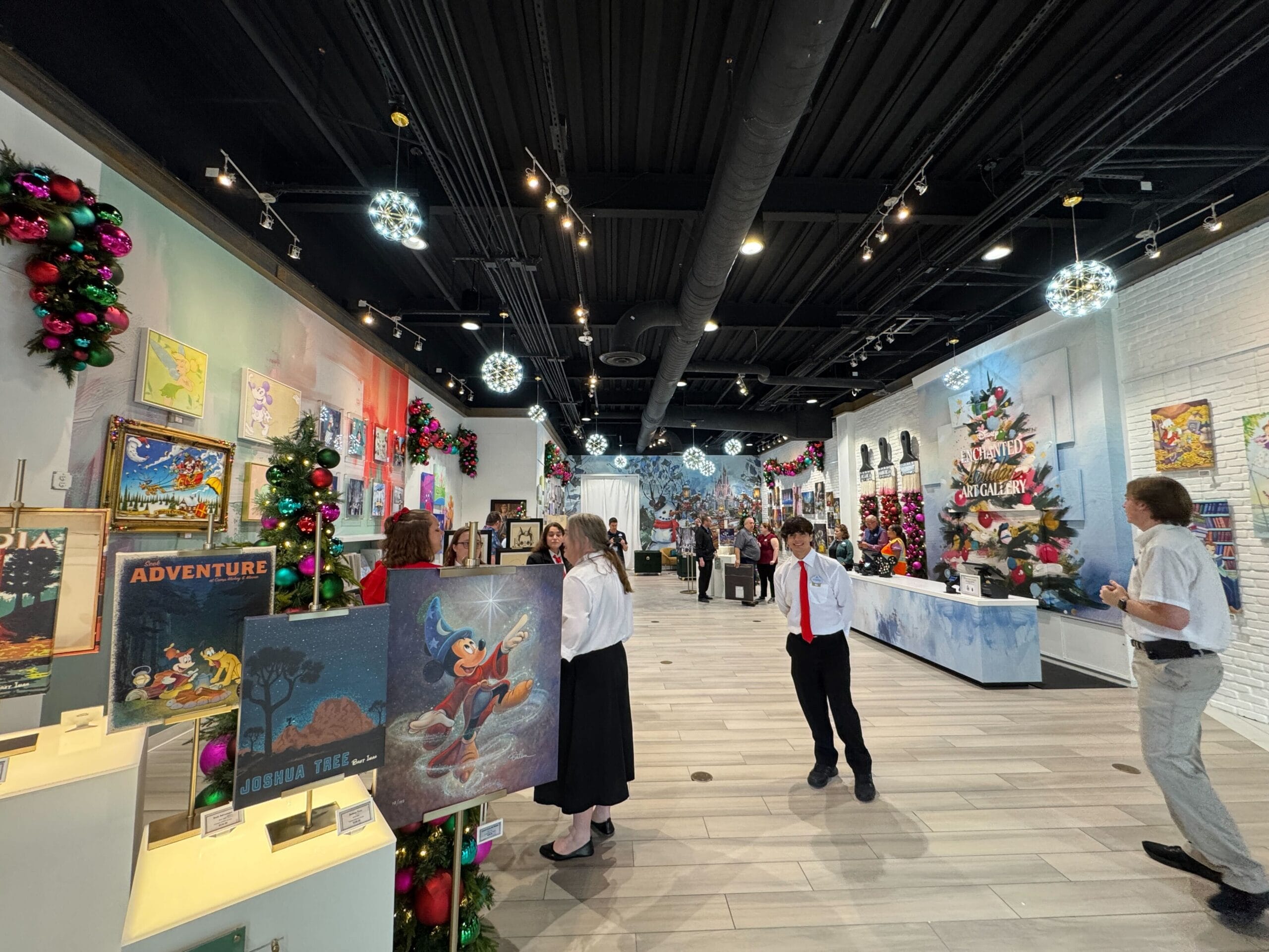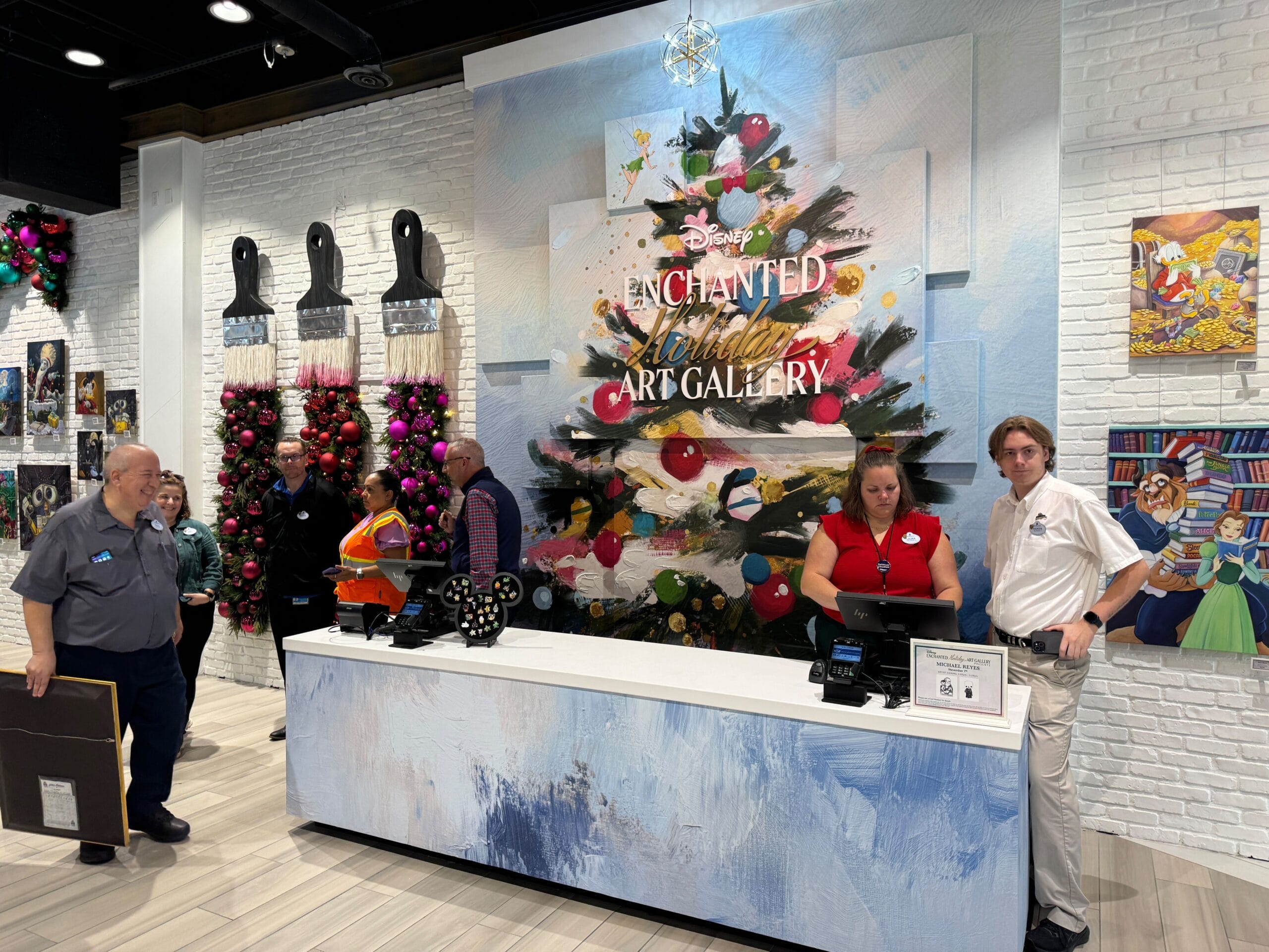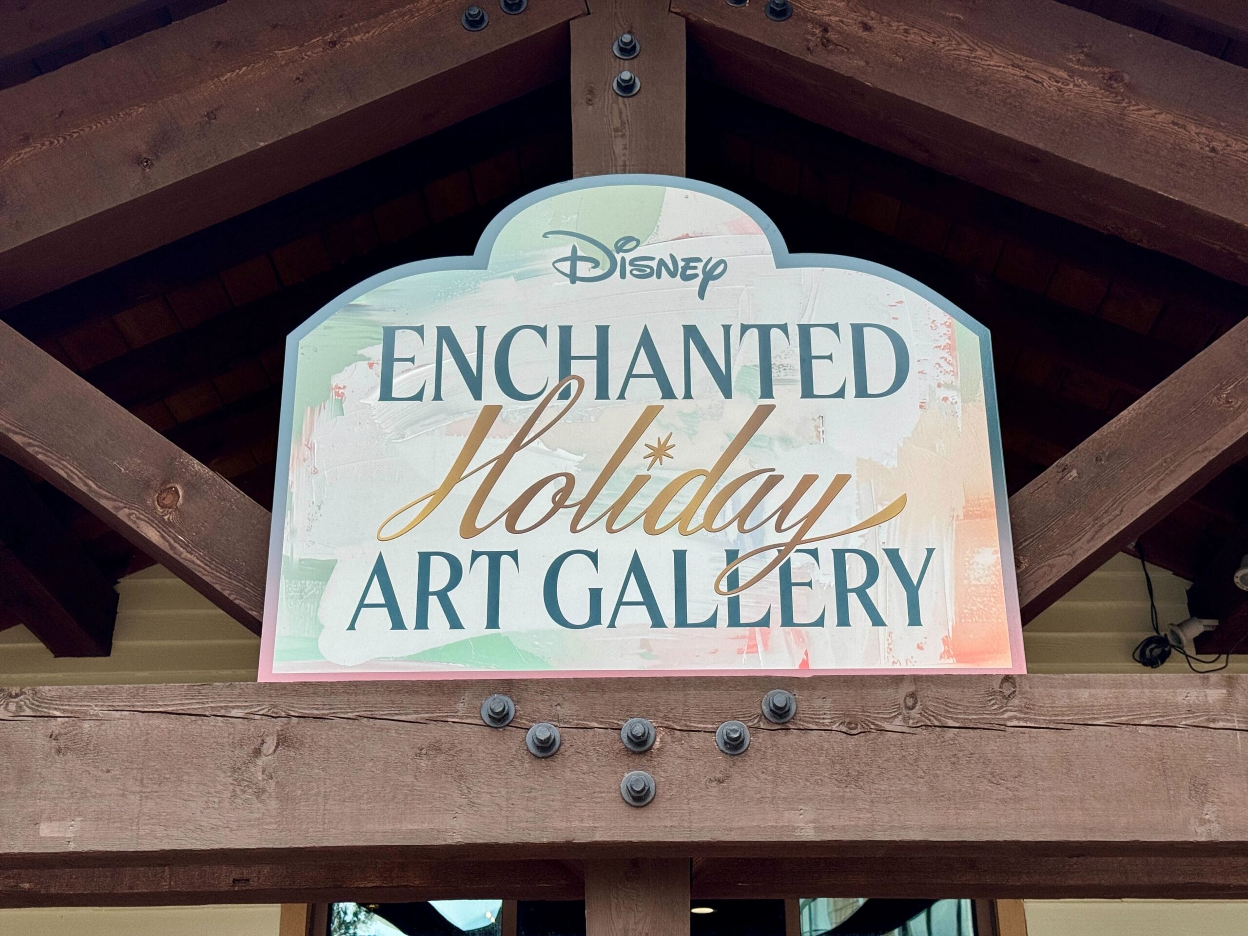 The gallery takes over the former Volcom storefront in the Town Square area near Amorette’s Patisserie. A paint-style Disney Enchanted Holiday Art Gallery sign is above the door.
