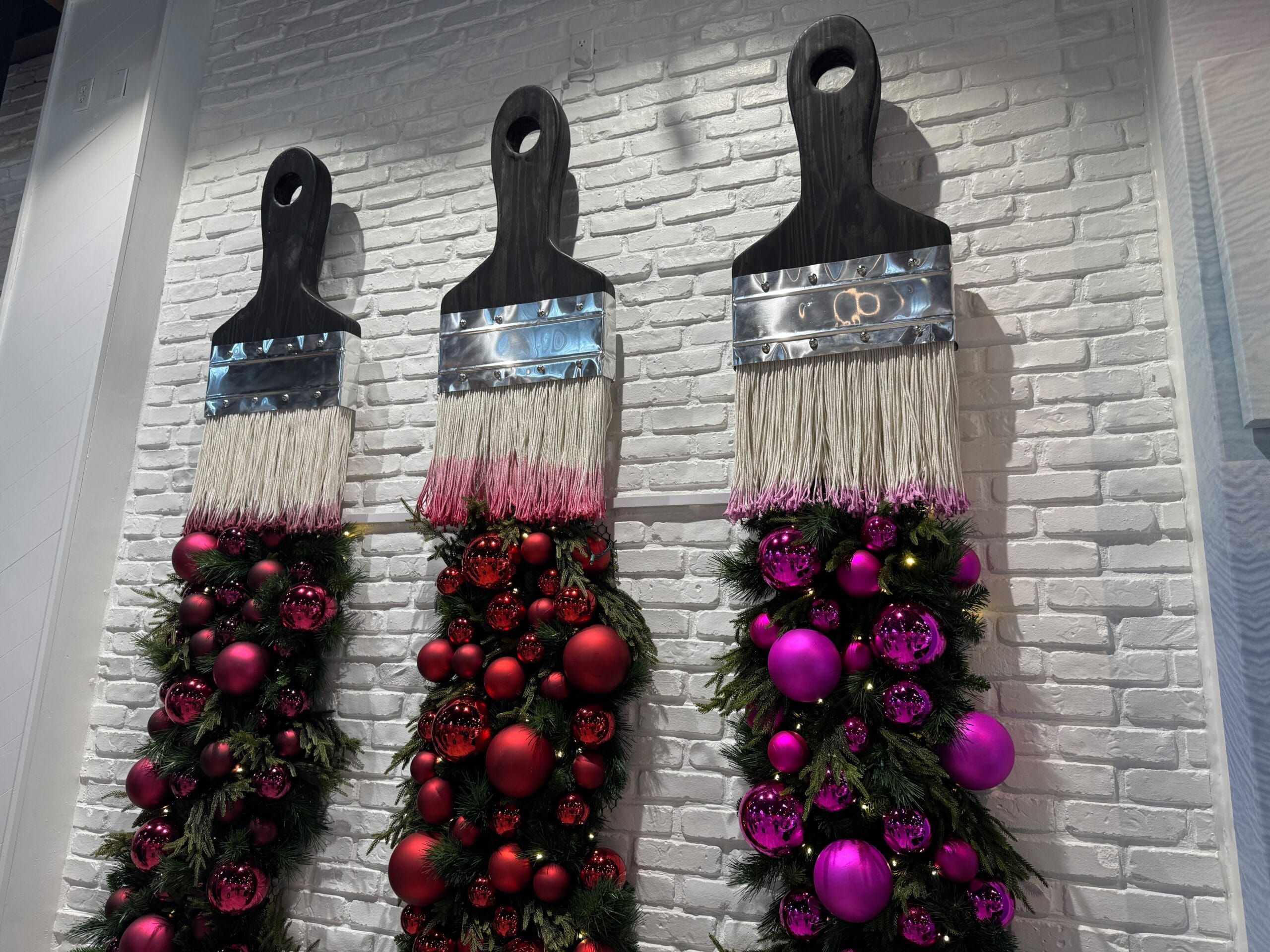 Next to checkout are three oversized paintbrushes with garland full of ornaments hanging below them.